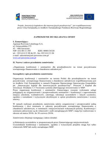 Projekt „Inwestycje kapitałowe dla innowacyjnych przedsięwzięć” jest współfinansowany przez Unię Europejską ze środków Europejskiego Funduszu Rozwoju Regionalnego ZAPROSZENIE DO SKŁADANIA OFERT I. Zamawiający: Agencja Rozwoju Lokalnego S.A. ul. Grunwaldzka 275 43 – 600 Jaworzno NIP: 632-00-11-505 KRS: 0000134320 tel. : 032-614 21 00 do 03 , fax: 032 614 21 04 e-mail: [email protected] www.arl-jaworzno.com.pl II. Nazwa i zakres przedmiotu zamówienia: „Organizacja konferencji i seminariów dla przedsiębiorców na temat pozyskiwania zewnętrznego finansowania o charakterze udziałowym”. Szczegółowy opis przedmiotu zamówienia: Organizacja konferencji i seminariów na terenie Polski dla przedsiębiorców na temat pozyskiwania zewnętrznego finansowania o charakterze udziałowym współfinansowana jest ze środków Unii Europejskiej w ramach Programu Operacyjnego Innowacyjna Gospodarka pn. „Innowacyjny kapitał dla innowacyjnych przedsięwzięć”. Priorytet 3 Kapitał dla inwestycji. Działanie 3.3 Tworzenie systemu ułatwiającego inwestowanie w MSP. Przez organizację konferencji i seminariów Zamawiający rozumie wykonanie usługi polegającej na zorganizowaniu i przeprowadzeniu seminariów i konferencji z zapewnieniem miejsca szkolenia, wykładowców, cateringu, rekrutacji uczestników i innych czynności, zgodnie z warunkami i wytycznymi określonymi w opisie przedmiotu zamówienia i wzorze umowy. W ramach realizacji przedmiotu zamówienia naleŜy zorganizować i przeprowadzić jedną konferencję i dwa seminaria w zakresie pozyskiwania zewnętrznego finansowania o charakterze udziałowym, w terminach i miejscowościach wskazanych poniŜej. Konferencja i seminaria adresowane są do właścicieli i osób zarządzających MSP i mają być realizowane w okresie od marca 2010r. do 30 czerwca 2010r. Zamówienie obejmuje następujący zakres działań: a) Rekrutacja uczestników w proponowanych przez Zamawiającego miejscowościach. Uczestnikami konferencji i seminariów, zgodnie z wytycznymi projektu mogą być tylko właściciele MSP lub osoby zarządzające MSP. 1 b) Zapewnienie odpowiednich sal dla konferencji i seminariów w proponowanych miastach zgodnie z zaproponowanym harmonogramem (kaŜde konferencja i seminarium w innym województwie). c) Przeprowadzenie konferencji i seminariów – zaproponowanie szczegółowego programu i wykładowców oraz pełna obsługa konferencji i seminariów. d) Zapewnienie cateringu podczas konferencji i seminariów. e) Przygotowanie materiałów szkoleniowych dla uczestników konferencji i seminariów, a takŜe trzech egzemplarzy dla Agencji Rozwoju Lokalnego S.A. Szczegółowy opis zamówienia znajduje się w Załączniku nr 1. do niniejszego Zaproszenia Szkolenia i konferencje naleŜy zorganizować zgodnie z następującym harmonogramem: Konferencja: konferencja - w marcu 2010r. w Katowicach, Seminaria: pierwsze seminarium – w kwietniu 2010r. w Krakowie, drugie seminarium – w maju 2010r. we Wrocławiu. 1. O udzielenie zamówienia mogą ubiegać Wykonawcy, którzy spełniają następujące warunki: 1) posiadają uprawnienia do wykonywania określonej działalności lub czynności, jeŜeli przepisy prawa nakładają obowiązek ich posiadania; Zamawiający uzna, Ŝe warunek ten został spełniony jeŜeli: Wykonawca załączy do oferty aktualny odpis z właściwego rejestru albo aktualne zaświadczenie o wpisie do ewidencji działalności gospodarczej, jeŜeli odrębne przepisy wymagają wpisu do rejestru lub zgłoszenia do ewidencji działalności gospodarczej, wystawiony nie wcześniej niŜ 6 miesięcy przed upływem terminu składania ofert. 2) posiadają wiedzę i doświadczenie; Zamawiający uzna, Ŝe warunek ten został spełniony jeŜeli: Wykonawca zorganizował naleŜycie w okresie 2 ostatnich lat minimum dwie konferencje, a jeśli okres działalności jest krótszy zorganizował w tym okresie co najmniej 2 seminaria. 3) dysponują odpowiednim potencjałem technicznym oraz osobami zdolnymi do wykonania zamówienia; Zamawiający uzna, Ŝe warunek ten został spełniony jeŜeli: 2 KaŜdy z proponowanych wykładowców posiada minimum 2 letnie doświadczenie z tematyki objętej przedmiotowym zamówieniem. Do realizacji seminariów, Wykonawca musi zapewnić udział minimum jednego wykładowcy, natomiast w przypadku konferencji minimum dwóch wykładowców. Ci sami wykładowcy mogą prowadzić konferencję i seminaria. W celu potwierdzenia opisanego przez zamawiającego warunku posiadania przez wykonawcę niezbędnej wiedzy i doświadczenia oraz dysponowania odpowiednim potencjałem technicznym i osobami zdolnymi do wykonania zamówienia, zamawiający Ŝąda załączenia do oferty następujących dokumentów: a) Wykaz zorganizowanych szkoleń lub konferencji z ostatnich 2 lat przed dniem wszczęcia postępowania o udzielenie zamówienia. Niniejszy wykaz winien być sporządzony wg wzoru stanowiącego załącznik nr 3 do SIWZ. b) Wykaz wykładowców, których kwalifikacje zawodowe oraz doświadczenie, potwierdzą znajomość tematyki merytorycznej konferencji i seminariów. Niniejszy wykaz winien być sporządzony wg wzoru stanowiącego załącznik nr 4 do SIWZ. Dokumentami potwierdzającymi kwalifikacje zawodowe są CV oraz kserokopie dyplomów, certyfikaty, świadectwa itp. c) Zgodnie z wytycznymi określonymi w „Przewodniku po kryteriach wyboru finansowanych operacji w ramach Programu Operacyjnego Innowacyjna Gospodarka, 2007-2013” Wykładowcy muszą posiadać przynajmniej roczne doświadczenie praktyczne w dokonywaniu inwestycji, rozumianej jako świadczenie usługi o charakterze doradczym, w spółki sektora mikro, małych i średnich przedsiębiorców rozpoczynających działalność gospodarczą i nie notowanych na rynku publicznym poprzez nabywanie lub zbywanie akcji lub udziałów w tych spółkach. Dokumentami potwierdzającymi spełnienie tego warunku mogą być stosowne oświadczenia wykładowców, protoko