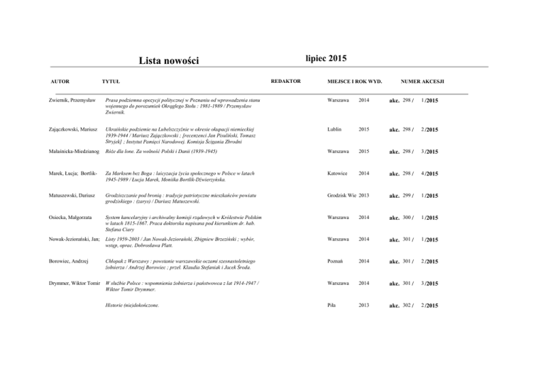 lipiec 2015 Lista nowości AUTOR TYTUŁ REDAKTOR MIEJSCE I ROK WYD. NUMER AKCESJI Zwiernik, Przemysław Prasa podziemna opozycji politycznej w Poznaniu od wprowadzenia stanu wojennego do porozumień Okrągłego Stołu : 1981-1989 / Przemysław Zwiernik. Warszawa 2014 akc. 298 / 1 /2015 Zajączkowski, Mariusz Ukraińskie podziemie na Lubelszczyźnie w okresie okupacji niemieckiej 1939-1944 / Mariusz Zajączkowski ; [recenzenci Jan Pisuliński, Tomasz Stryjek] ; Instytut Pamięci Narodowej. Komisja Ścigania Zbrodni Lublin 2015 akc. 298 / 2 /2015 Małaśnicka-Miedzianog Róże dla lone. Za wolność Polski i Danii (1939-1945) Warszawa 2015 akc. 298 / 3 /2015 Marek, Łucja; Bortlik- Za Marksem bez Boga : laicyzacja życia społecznego w Polsce w latach 1945-1989 / Łucja Marek, Moniika Bortlik-Dźwierzyńska. Katowice 2014 akc. 298 / 4 /2015 Matuszewski, Dariusz Grodziszczanie pod bronią : tradycje patriotyczne mieszkańców powiatu grodziskiego : (zarys) / Dariusz Matuszewski. Grodzisk Wie 2013 akc. 299 / 1 /2015 Osiecka, Małgorzata System kancelaryjny i archiwalny komisji rządowych w Królestwie Polskim w latach 1815-1867. Praca doktorska napisana pod kierunkiem dr. hab. Stefana Ciary Warszawa 2014 akc. 300 / 1 /2015 Nowak-Jeziorański, Jan; Listy 1959-2003 / Jan Nowak-Jeziorański, Zbigniew Brzeziński ; wybór, wstęp, oprac. Dobrosława Platt. Warszawa 2014 akc. 301 / 1 /2015 Borowiec, Andrzej Chłopak z Warszawy : powstanie warszawskie oczami szesnastoletniego żołnierza / Andrzej Borowiec ; przeł. Klaudia Stefaniak i Jacek Środa. Poznań 2014 akc. 301 / 2 /2015 Drymmer, Wiktor Tomir W służbie Polsce : wspomnienia żołnierza i państwowca z lat 1914-1947 / Wiktor Tomir Drymmer. Warszawa 2014 akc. 301 / 3 /2015 Historie (nie)dokończone. Piła 2013 akc. 302 / 2 /2015 AUTOR TYTUŁ REDAKTOR MIEJSCE I ROK WYD. NUMER AKCESJI Split, Jerzy Aleksaner Gdy dymy opadły... : Kalisz w latach Wielkiej Wojny (1914-1918) / Jerzy Aleksander Splitt. Kalisz 2014 akc. 302 / 3 /2015 Kotowski, Robert Dziewczynka z obrazu : historia życia Józi Oderfeldówny / Robert Kotowski. Kielce 2014 akc. 303 / 1 /2015 Skoczyński, Jan Glossy i uwagi / Jan Skoczyński. Kraków 2014 akc. 303 / 2 /2015 Kilańczyk, Piotr Julian Stachiewicz (1890-1934) : żołnierz i historyk / Piotr Kilańczyk. Poznań 2014 akc. 303 / 3 /2015 Roztworowski, Stanisła Listy z wojny polsko-bolszewickiej 1918-1920 / Stanisław Rostworowski ; wybór i oprac. tekstów Stanisław Jan Rostworowski. Warszawa 2015 akc. 303 / 4 /2015 Płowy, Damian Od Ponieca do Bełcza Wielkiego; Działania pościgowe Karola XII jesienią 1704 roku. Zabrze 2015 akc. 303 / 5 /2015 Kraków 2015 akc. 303 / 6 /2015 Kraków 2014 akc. 303 / 7 /2015 Warszawa 2015 akc. 303 / 8 /2015 9 /2015 Podróże i podróżopisarstwo w polskiej literaturze i kulturze XIX wieku : studia i szkice / pod redakcją Agnieszki Kowalczyk i Anety Kwiatek. White, Hayden Agnieszka Kowalczyk Przeszłość praktyczna / Hayden White ; pod red. Ewy Domańskiej ; przekł. Jan Burzyński [et al.]. Społeczeństwo polskie w świetle raportów politycznych austrowęgierskiego Generalnego Gubernatorstwa Wojskowego w Polsce 19151918 : wybór źródeł / oprac. Jerzy Gaul, Alicja Nowak ; Archiwum Główne Jerzy Gaul, Skodlarski, Janusz Stosunki gospodarcze polsko-czechosłowackie w latach 1945-1949 : zbiór dokumentów / wybór, wstęp i opracowanie Janusz Skodlarski. Łódź 2015 akc. 303 / Jefferson, Thomas Uwagi o państwie Wirginia / Thomas Jefferson ; tł., wstęp i oprac. Tomasz Wieciech. Kraków 2014 akc. 303 / 10 /2015 Sandomierz 2014 akc. 304 / Curia regis, curia reginalis : dwory królewskie w średniowiecznej Europie Środkowej - stan badań i postulaty badawcze / pod red. Bożeny Czwojdrak i Agnieszki Januszak-Sieradzkiej. Bożena Czwojdrak 1 /2015 AUTOR TYTUŁ REDAKTOR MIEJSCE I ROK WYD. NUMER AKCESJI Grala Hieronim Rosja / [tekst, wybór il.] Hieronim Grala, zdj. Wojciecha Bussa ; [przedm. Adam Daniel Rotfeld]. Olszanica 2013 akc. 310 / 1 /2015 Namysłowski, Ludwik Pamiętnik ilustrowany żołnierza 2 Brygady Legionów Polskich Ludwika Namysłowskiego / [oprac. Szymon Tadeusz Krawczak]. Warszawa 2013 akc. 311 / 1 /2015 Warszawa 2015 akc. 312 / 1 /2015 Obrazy władzy w literaturze, teatrze i filmie : studia / pod redakcją Mariusza Mazura i Sebastiana Ligarskiego ; [recenzenci Krystyna HeskaKwaśniewicz, Robert Klementowski] ; Instytut Pamięci Narodowej. Mariusz Mazur, Ligarski Sebastian Reisch, Alfred A. Nieznany front zimnej wojny : tajny program dystrybucji książek za żelazną kurtyną / Alfred A. Reisch ; pod redakcją Małgorzaty Chomy-Jusińskiej ; [tłumaczenie Patrycja Poniatowska] ; Instytut Pamięci Narodowej. Warszawa 2015 akc. 312 / 2 /2015 Rokicki, Paweł Glinciszki i Dubinki : zbrodnie wojenne na Wileńszczyźnie w połowie 1944 roku i ich konsekwencje we współczesnych relacjach polsko-litewskich / Paweł Rokicki ; Instytut Pamięci Narodowej. Komisja Ścigania Zbrodni Warszawa 2015 akc. 312 / 3 /2015 Szwarc, Andrzej Portrety zbiorowe dziewiętnastowiecznych polaków w nowszej historiografii. Uwagi dyskusyjne. Rzeszów 2014 akc. 313 / 3 /2015 Szwarc, Andrzej Funkcjonariusze Imperium i inni Rosjanie w Królestwie Polskim po powstaniu styczniowym (stan i perspektywy) Pułtusk 2014 akc. 313 / 4 /2015 Lambert Stephen Inscribed Athenian laws and decrees, 352/1 - 322/1 BC epigraphical essays. Leiden 2012 akc. 314 / 1 /2015 AUTOR TYTUŁ REDAKTOR MIEJSCE I ROK WYD. NUMER AKCESJI Urbanek, Joanna Codzienność w cieniu terroru : okupacja niemiecka w Polsce 1939-1945 / Joanna Urbanek. Gdańsk 2014 akc. 315 / 1 /2015 Borchers, Roland; Mado Wojna na Kaszubach : pamięć polskich i niemieckich świadków / oprac. Roland Borchers, Katarzyna Madoń-Mitzner. Gdańsk 2014 akc. 315 / 2 /2015 Westphal, Marcin Walka o panowanie w głębinach : historia powstania U-boota typu XXI / Marcin Westphal. Gdańsk 2014 akc. 315 / 3 /2015 AUTOR TYTUŁ REDAKTOR MIEJSCE I ROK WYD. NUMER AKCESJI L