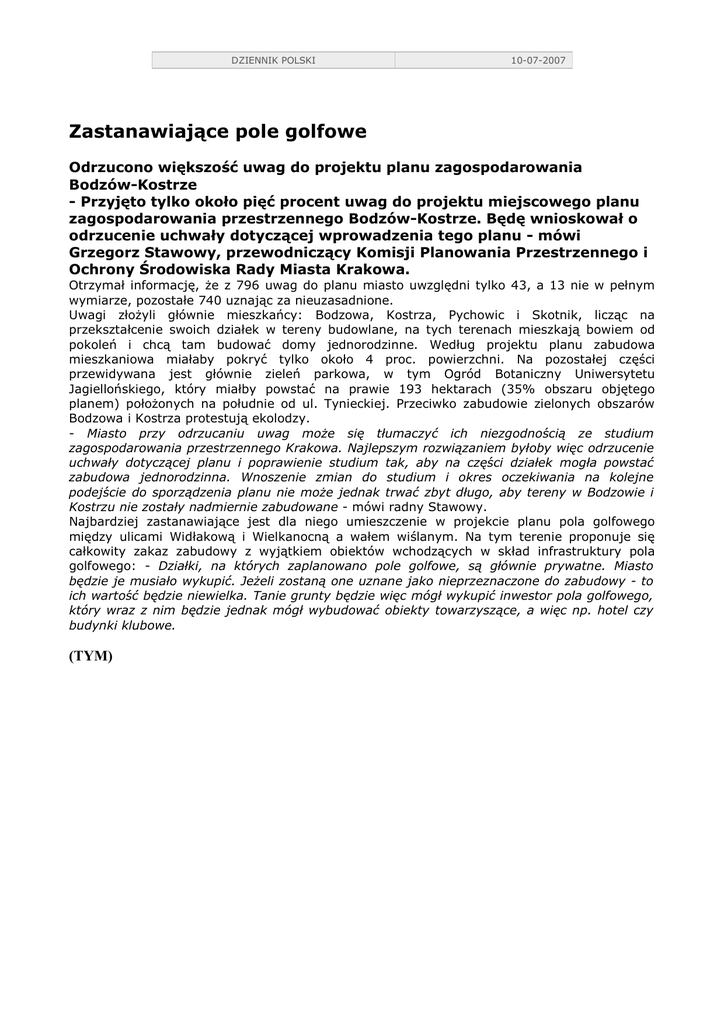DZIENNIK POLSKI 10-07-2007 Zastanawiające pole golfowe Odrzucono większość uwag do projektu planu zagospodarowania Bodzów-Kostrze - Przyjęto tylko około pięć procent uwag do projektu miejscowego planu zagospodarowania przestrzennego Bodzów-Kostrze. Będę wnioskował o odrzucenie uchwały dotyczącej wprowadzenia tego planu - mówi Grzegorz Stawowy, przewodniczący Komisji Planowania Przestrzennego i Ochrony Środowiska Rady Miasta Krakowa. Otrzymał informację, Ŝe z 796 uwag do planu miasto uwzględni tylko 43, a 13 nie w pełnym wymiarze, pozostałe 740 uznając za nieuzasadnione. Uwagi złoŜyli głównie mieszkańcy: Bodzowa, Kostrza, Pychowic i Skotnik, licząc na przekształcenie swoich działek w tereny budowlane, na tych terenach mieszkają bowiem od pokoleń i chcą tam budować domy jednorodzinne. Według projektu planu zabudowa mieszkaniowa miałaby pokryć tylko około 4 proc. powierzchni. Na pozostałej części przewidywana jest głównie zieleń parkowa, w tym Ogród Botaniczny Uniwersytetu Jagiellońskiego, który miałby powstać na prawie 193 hektarach (35% obszaru objętego planem) połoŜonych na południe od ul. Tynieckiej. Przeciwko zabudowie zielonych obszarów Bodzowa i Kostrza protestują ekolodzy. - Miasto przy odrzucaniu uwag moŜe się tłumaczyć ich niezgodnością ze studium zagospodarowania przestrzennego Krakowa. Najlepszym rozwiązaniem byłoby więc odrzucenie uchwały dotyczącej planu i poprawienie studium tak, aby na części działek mogła powstać zabudowa jednorodzinna. Wnoszenie zmian do studium i okres oczekiwania na kolejne podejście do sporządzenia planu nie moŜe jednak trwać zbyt długo, aby tereny w Bodzowie i Kostrzu nie zostały nadmiernie zabudowane - mówi radny Stawowy. Najbardziej zastanawiające jest dla niego umieszczenie w projekcie planu pola golfowego między ulicami Widłakową i Wielkanocną a wałem wiślanym. Na tym terenie proponuje się całkowity zakaz zabudowy z wyjątkiem obiektów wchodzących w skład infrastruktury pola golfowego: - Działki, na których zaplanowano pole golfowe, są głównie prywatne. Miasto będzie je musiało wykupić. JeŜeli zostaną one uznane jako nieprzeznaczone do zabudowy - to ich wartość będzie niewielka. Tanie grunty będzie więc mógł wykupić inwestor pola golfowego, który wraz z nim będzie jednak mógł wybudować obiekty towarzyszące, a więc np. hotel czy budynki klubowe. (TYM)