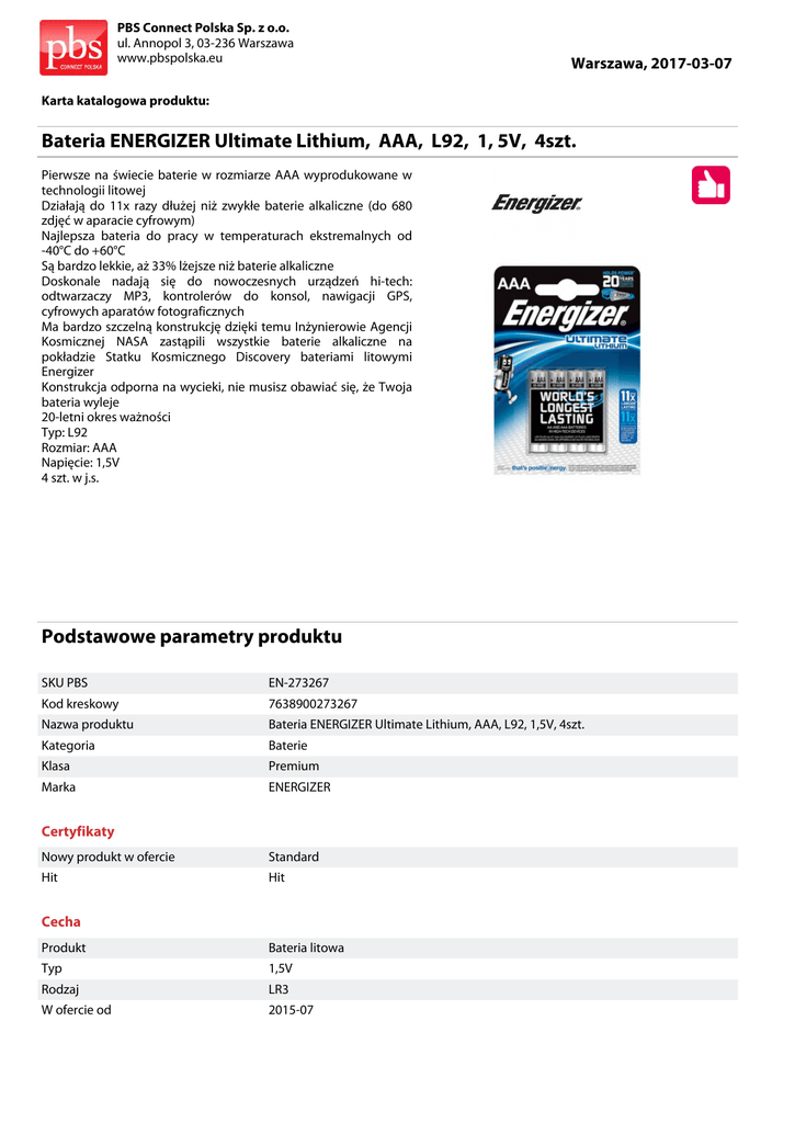 PBS Connect Polska Sp. z o.o. ul. Annopol 3, 03-236 Warszawa www.pbspolska.eu Warszawa, 2017-03-07 Karta katalogowa produktu: Bateria ENERGIZER Ultimate Lithium, AAA, L92, 1, 5V, 4szt. Pierwsze na świecie baterie w rozmiarze AAA wyprodukowane w technologii litowej Działają do 11x razy dłużej niż zwykłe baterie alkaliczne (do 680 zdjęć w aparacie cyfrowym) Najlepsza bateria do pracy w temperaturach ekstremalnych od -40°C do +60°C Są bardzo lekkie, aż 33% lżejsze niż baterie alkaliczne Doskonale nadają się do nowoczesnych urządzeń hi-tech: odtwarzaczy MP3, kontrolerów do konsol, nawigacji GPS, cyfrowych aparatów fotograficznych Ma bardzo szczelną konstrukcję dzięki temu Inżynierowie Agencji Kosmicznej NASA zastąpili wszystkie baterie alkaliczne na pokładzie Statku Kosmicznego Discovery bateriami litowymi Energizer Konstrukcja odporna na wycieki, nie musisz obawiać się, że Twoja bateria wyleje 20-letni okres ważności Typ: L92 Rozmiar: AAA Napięcie: 1,5V 4 szt. w j.s. Podstawowe parametry produktu SKU PBS EN-273267 Kod kreskowy 7638900273267 Nazwa produktu Bateria ENERGIZER Ultimate Lithium, AAA, L92, 1,5V, 4szt. Kategoria Baterie Klasa Premium Marka ENERGIZER Certyfikaty Nowy produkt w ofercie Standard Hit Hit Cecha Produkt Bateria litowa Typ 1,5V Rodzaj LR3 W ofercie od 2015-07 PBS Connect Polska Sp. z o.o. ul. Annopol 3, 03-236 Warszawa www.pbspolska.eu Warszawa, 2017-03-07 Karta katalogowa produktu cd. Bateria ENERGIZER Ultimate Lithium, AAA, L92, 1, 5V, 4szt. Podstawowe parametry produktu Wymiary Rozmiar AAA Wymiary (mm) Średnica: 10,5 wysokość: 44,5 Wspólny słownik zamówień CPV 31411000-0 Jednostki logistyczne Opakowanie 1 12 op Opakowanie 2 10296 op