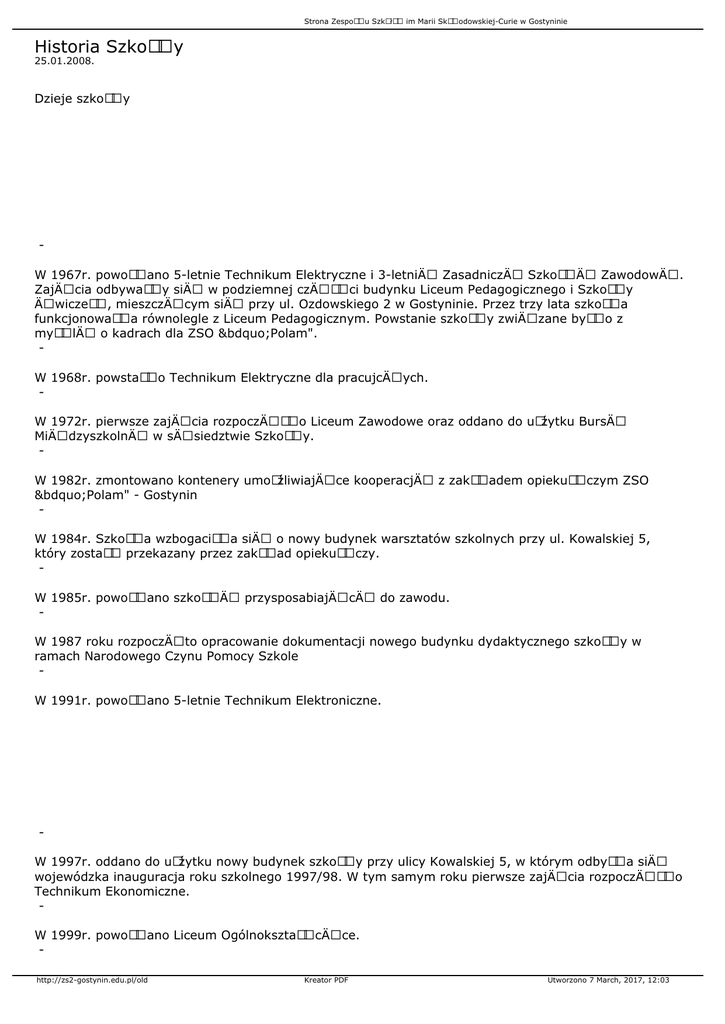 Strona ZespoÅ‚u SzkÃłÅ‚ im Marii SkÅ‚odowskiej-Curie w Gostyninie Historia SzkoÅ‚y 25.01.2008. Dzieje szkoÅ‚y W 1967r. powoÅ‚ano 5-letnie Technikum Elektryczne i 3-letniÄ… ZasadniczÄ… Szkołę ZawodowÄ…. ZajÄ™cia odbywaÅ‚y siÄ™ w podziemnej części budynku Liceum Pedagogicznego i SzkoÅ‚y ĆwiczeÅ„, mieszczÄ…cym siÄ™ przy ul. Ozdowskiego 2 w Gostyninie. Przez trzy lata szkoÅ‚a funkcjonowaÅ‚a równolegle z Liceum Pedagogicznym. Powstanie szkoÅ‚y zwiÄ…zane byÅ‚o z myÅ›lÄ… o kadrach dla ZSO „Polam". W 1968r. powstaÅ‚o Technikum Elektryczne dla pracujcÄ…ych. W 1972r. pierwsze zajÄ™cia rozpoczęło Liceum Zawodowe oraz oddano do uÅźytku BursÄ™ MiÄ™dzyszkolnÄ… w sÄ…siedztwie SzkoÅ‚y. W 1982r. zmontowano kontenery umoÅźliwiajÄ…ce kooperacjÄ™ z zakÅ‚adem opiekuÅ„czym ZSO „Polam" - Gostynin W 1984r. SzkoÅ‚a wzbogaciÅ‚a siÄ™ o nowy budynek warsztatów szkolnych przy ul. Kowalskiej 5, który zostaÅ‚ przekazany przez zakÅ‚ad opiekuÅ„czy. W 1985r. powoÅ‚ano szkołę przysposabiajÄ…cÄ… do zawodu. W 1987 roku rozpoczÄ™to opracowanie dokumentacji nowego budynku dydaktycznego szkoÅ‚y w ramach Narodowego Czynu Pomocy Szkole W 1991r. powoÅ‚ano 5-letnie Technikum Elektroniczne. W 1997r. oddano do uÅźytku nowy budynek szkoÅ‚y przy ulicy Kowalskiej 5, w którym odbyÅ‚a siÄ™ wojewódzka inauguracja roku szkolnego 1997/98. W tym samym roku pierwsze zajÄ™cia rozpoczęło Technikum Ekonomiczne. W 1999r. powoÅ‚ano Liceum OgólnoksztaÅ‚cÄ…ce. http://zs2-gostynin.edu.pl/old Kreator PDF Utworzono 7 March, 2017, 12:03 Strona ZespoÅ‚u SzkÃłÅ‚ im Marii SkÅ‚odowskiej-Curie w Gostyninie 1. grudnia 2001r. zostaÅ‚y zlikwidowane Warsztaty Szkolne przy ulicy Kowalskiej. W 2002 roku oddano do uÅźytku szkoÅ‚y halÄ™ sportowÄ…. W tym czasie SzkoÅ‚a istniaÅ‚a pod nastÄ™pujÄ…cymi nazwami: Technikum Elektryczne ZespóÅ‚ SzkóÅ‚ Zawodowych Nr 2 ZespóÅ‚ SzkóÅ‚ Nr 2 ZespóÅ‚ SzkóÅ‚ im. Marii SkÅ‚odowskiej-Curie Zawody, jakie uzyskiwali absolwenci: Elektromechanik Elektrotechnik Elektromonter Tokarz Åšlusarz-spawacz Technik Elektryk Technik Elektronik Technik Ekonomista Kilka sÅ‚ów o dyrektorach Pierwszym dyrektorem byÅ‚ Marian MilczarekNastÄ™pnie stanowisko dyrektora piastowaÅ‚ Zenon KostkiewiczKolejnym dyrektorem byÅ‚ ZdzisÅ‚aw Syska, inicjator budowy nowego gmachu SzkoÅ‚y, który prowadziÅ‚ szkołę w latach 1978-1991. NastÄ™pnym w kolejnoÅ›ci dyrektorem byÅ‚ ZdzisÅ‚aw Tarka (absolwent Technikum Elektrycznego z 1981r.), który kierowa? Szkołą od 1991r. do 2007 r.Obecnie dyrektorem SzkoÅ‚y jest Izabela Ewa Sieradzka, która piastuje to stanowisko od 2007 roku. Kierownicy Warsztatów Szkolnych Ryszard CybulskiMieczysÅ‚aw KwaÅ›niewski Zygmunt GóreckiRyszard Zdziennicki http://zs2-gostynin.edu.pl/old Kreator PDF Utworzono 7 March, 2017, 12:03