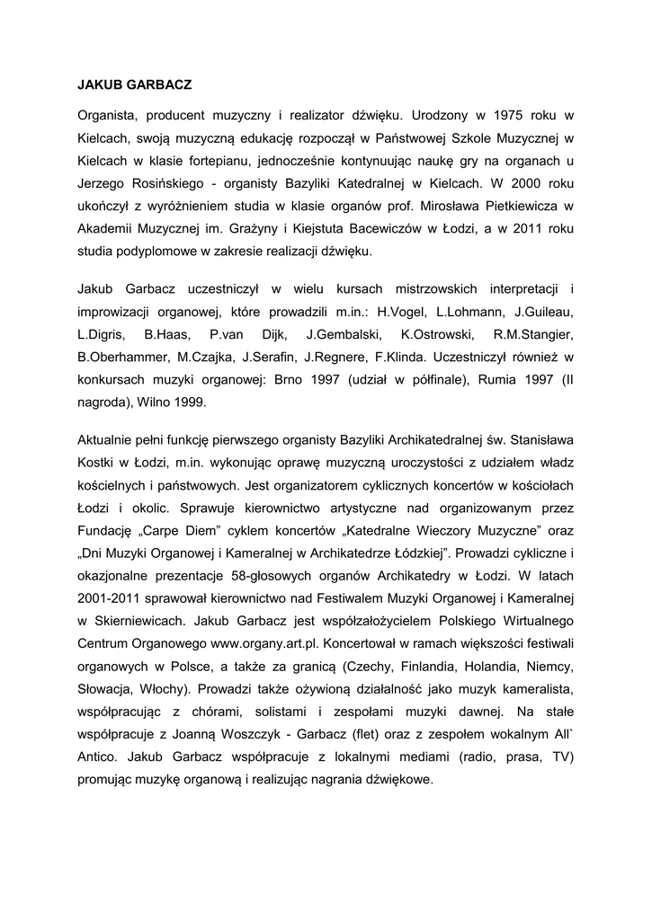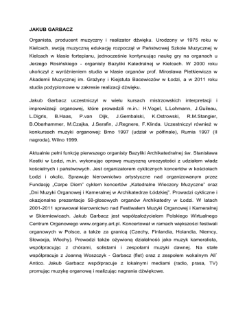 JAKUB GARBACZ Organista, producent muzyczny i realizator dźwięku. Urodzony w 1975 roku w Kielcach, swoją muzyczną edukację rozpoczął w Państwowej Szkole Muzycznej w Kielcach w klasie fortepianu, jednocześnie kontynuując naukę gry na organach u Jerzego Rosińskiego - organisty Bazyliki Katedralnej w Kielcach. W 2000 roku ukończył z wyróżnieniem studia w klasie organów prof. Mirosława Pietkiewicza w Akademii Muzycznej im. Grażyny i Kiejstuta Bacewiczów w Łodzi, a w 2011 roku studia podyplomowe w zakresie realizacji dźwięku. Jakub Garbacz uczestniczył w wielu kursach mistrzowskich interpretacji i improwizacji organowej, które prowadzili m.in.: H.Vogel, L.Lohmann, J.Guileau, L.Digris, B.Haas, P.van Dijk, J.Gembalski, K.Ostrowski, R.M.Stangier, B.Oberhammer, M.Czajka, J.Serafin, J.Regnere, F.Klinda. Uczestniczył również w konkursach muzyki organowej: Brno 1997 (udział w półfinale), Rumia 1997 (II nagroda), Wilno 1999. Aktualnie pełni funkcję pierwszego organisty Bazyliki Archikatedralnej św. Stanisława Kostki w Łodzi, m.in. wykonując oprawę muzyczną uroczystości z udziałem władz kościelnych i państwowych. Jest organizatorem cyklicznych koncertów w kościołach Łodzi i okolic. Sprawuje kierownictwo artystyczne nad organizowanym przez Fundację „Carpe Diem” cyklem koncertów „Katedralne Wieczory Muzyczne” oraz „Dni Muzyki Organowej i Kameralnej w Archikatedrze Łódzkiej”. Prowadzi cykliczne i okazjonalne prezentacje 58-głosowych organów Archikatedry w Łodzi. W latach 2001-2011 sprawował kierownictwo nad Festiwalem Muzyki Organowej i Kameralnej w Skierniewicach. Jakub Garbacz jest współzałożycielem Polskiego Wirtualnego Centrum Organowego www.organy.art.pl. Koncertował w ramach większości festiwali organowych w Polsce, a także za granicą (Czechy, Finlandia, Holandia, Niemcy, Słowacja, Włochy). Prowadzi także ożywioną działalność jako muzyk kameralista, współpracując z chórami, solistami i zespołami muzyki dawnej. Na stałe współpracuje z Joanną Woszczyk - Garbacz (flet) oraz z zespołem wokalnym All` Antico. Jakub Garbacz współpracuje z lokalnymi mediami (radio, prasa, TV) promując muzykę organową i realizując nagrania dźwiękowe. Jakub Garbacz prócz działalności ściśle artystycznej prowadzi studio nagraniowe muzyki klasycznej i wydawnictwo płytowe.