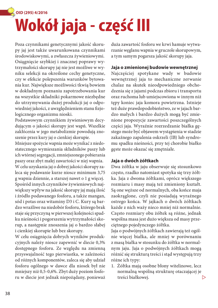 OID (295) 4/2016 Wokół jaja - część III Poza czynnikami genetycznymi jakość skorupy jaj jest także uwarunkowana czynnikami środowiskowymi, a zwłaszcza żywieniowymi. Osiągnięcie szybkiej i znacznej poprawy wytrzymałości skorupy jaj nie jest możliwe w wyniku selekcji na określone cechy genetyczne, czy w efekcie polepszenia warunków bytowania kur. Największe możliwości tkwią bowiem w dokładnym poznaniu zapotrzebowania kur na wszystkie składniki pokarmowe niezbędne do utrzymywania dużej produkcji jaj o odpowiedniej jakości, z uwzględnieniem stanu fizjologicznego organizmu nioski. Podstawowym czynnikiem żywieniowym decydującym o jakości skorupy jest wapń. Wszelkie zakłócenia w jego metabolizmie powodują znoszenie przez kury jaj o cienkiej skorupie. Mniejsze spożycie wapnia może wynikać z niedostatecznego wymieszania składników paszy lub ich wtórnej segregacji, zmniejszonego pobierania paszy oraz zbyt małej zawartości w niej wapnia. W celu uzyskania jaj o dobrej jakości skorupy zaleca się podawanie kurze niosce minimum 3,75 g wapnia dziennie, a starszej nawet o 1 g więcej. Spośród innych czynników żywieniowych największy wpływ na jakość skorupy jaj mają ilość i źródło podawanego fosforu, a także mangan, sód i potas oraz witaminy D3 i C. Kury są bardzo wrażliwe na niedobór fosforu, którego brak staje się przyczyną w pierwszej kolejności spadku nieśności i pogorszenia wytrzymałości skorup, a następnie znoszenia jaj o bardzo słabej i cienkiej skorupie lub bez skorupy. W celu osiągnięcia dobrych wyników produkcyjnych należy niosce zapewnić w diecie 0,3% dostępnego fosforu. Ze względu na zmienną przyswajalność tego pierwiastka, w zależności od różnych komponentów, zaleca się aby udział fosforu ogólnego w dawce dla niosek był nie mniejszy niż 0,5-0,6%. Zbyt duży poziom fosforu w diecie jest jednak niepożądany, ponieważ 38 duża zawartość fosforu we krwi hamuje wytwarzanie węglanu wapnia w gruczole skorupowym, a tym samym pogarsza jakość skorupy jaja. Jaja o zmienionej budowie wewnętrznej Najczęściej spotykane wady w budowie wewnętrznej jaja to mechaniczne zerwanie chalaz na skutek nieodpowiedniego obchodzenia się z jajami podczas zbioru i transportu oraz ruchoma lub umiejscowiona w innym niż tępy koniec jaja komora powietrzna. Istnieje też duże prawdopodobieństwo, ze w jajach bardzo małych i bardzo dużych mogą być zmienione propozycje zawartości poszczególnych części jaja. Wyraźnie rozrzedzanie białka gęstego może być objawem wystąpienia w stadzie zakaźnego zapalenia oskrzeli (IB) lub syndromu spadku nieśności, przy tej chorobie białko gęste może okazać się zmętniałe. Jaja o dwóch żółtkach Dwa żółtka w jaju obserwuje się stosunkowo często, rzadko natomiast spotyka się trzy żółtka. Jaja z dwoma żółtkami, oprócz większego rozmiaru i masy mają też zmieniony kształt. Są one węższe od normalnych, oba końce maja zaokrąglone, czyli nie posiadają wyraźnego ostrego końca. W jajkach o dwóch żółtkach każde z nich waży nieco mniej niż normalnie. Często rozmiary obu żółtek są różne, jednak wspólna masa jest dużo większa od masy przeciętnego pojedynczego żółtka. Jaja o podwójnych żółtkach zawierają też ogólnie więcej białka, ale mniej w porównaniu z masą białka w stosunku do żółtka w normalnym jaju. Jaja o podwójnych żółtkach mogą różnić się strukturą treści i stąd występują trzy różne ich typy: 1. Żółtka mają osobne błony witelinowe, lecz normalną wspólną strukturę otaczającej je treści białkowej. OID (295) 4/2016 2. Każde żółtko posiada odrębne otaczające je warstwy białka, lecz mają wspólne chalazy. 3. Wokół każdego z żółtek wykształca się odrębna struktura białkowa łącznie z chalazami, a tylko błony podskorupowe i skorupa pozostają wspólne. Większość jaj o dwóch żółtkach ma budowę typu 2. Ponad 53% jaj o podwójnych żółtkach pochodzi od niosek w okresie pierwszych 60 dni nieśności. Jaja o dwóch żółtkach obserwuje się dość często u kaczek, spotykano je również u gęsi Istnieje wiele teorii dotyczących przyczyn pojawienia się dwóch żółtek w jaju. Niewątpliwie zasadniczą przyczyną są zaburzenia w jajowodzie, które prowadzą do spotkania się dwóch żółtek. Uważa się też, że równoczesna owulacja dwóch jaj względnie zatrzymanie jednego jaja do następnego dnia może być również powodem tworzenia się jaj o dwóch żółtkach. Wykazano, że jaja o dwóch żółtkach spotyka się najczęściej wiosną i latem Brak białka Wada ta występuje bardzo rzadko. Przyczyny szuka się albo w czasowej niezdolności do wydzielenia białek odpowiedniej części jajowodu, albo przez nienormalne, przyspieszone przesuwanie się żółtka przez białko twórczy odcinek jajowodu. Podwójne jajo w jaju Jajo umiejscowione wewnątrz innego jaja jest oczywiście mniejsze. Niekiedy może być bez żółtka. Uważa się, że jedną z przyczyn tworzenia się takich jak może być zatrzymanie pierwszego jaja w macicy, aż do czasu objęcia go (otoczenia) przez drugie. Inni przypuszczają, że zachodzi cofnięcie się pierwszego uformowanego już jaja do początkowego, białko twórczego odcinka jajowodu i wówczas białko pokrywa jajo , które znów przesuwa się dalej i pokry40 wa skorupą. To drugie przypuszczenie znajduje zresztą mniej zwolenników. Wady żółtka Niejednokrotnie obserwuje się takie wady żółtka, jak: rozerwanie, zniekształcenie i skurczenia się początkowych odcinkach jajowodu. Plamy na żółtku lub tzw. marmurkowatością są jakby ciemniejsze miejsca na jednolicie zabarwionej powierzchni żółtka. Przypuszcza się, że przyczyną plam jest nienormalne, nierównomierne ciśnienie wywierane na żółtko przechodzące przez jajowód. Natomiast marmurkowość powstaje wskutek wad budowy błony witelinowej. Wadliwa bł