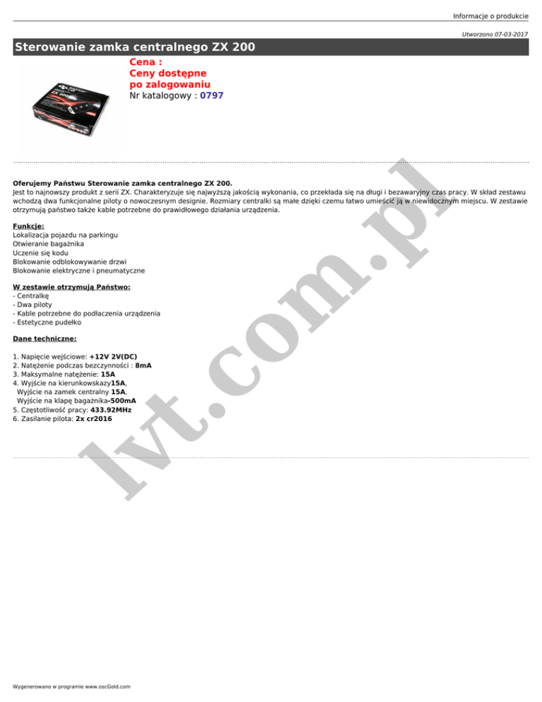 Informacje o produkcie Utworzono 07-03-2017 Sterowanie zamka centralnego ZX 200 Cena : Ceny dostępne po zalogowaniu Nr katalogowy : 0797 Funkcje: Lokalizacja pojazdu na parkingu Otwieranie bagażnika Uczenie się kodu Blokowanie odblokowywanie drzwi Blokowanie elektryczne i pneumatyczne W zestawie otrzymują Państwo: - Centralkę - Dwa piloty - Kable potrzebne do podłaczenia urządzenia - Estetyczne pudełko lv t. co Dane techniczne: m .p l Oferujemy Państwu Sterowanie zamka centralnego ZX 200. Jest to najnowszy produkt z serii ZX. Charakteryzuje się najwyższą jakością wykonania, co przekłada się na długi i bezawaryjny czas pracy. W skład zestawu wchodzą dwa funkcjonalne piloty o nowoczesnym designie. Rozmiary centralki są małe dzięki czemu łatwo umieścić ją w niewidocznym miejscu. W zestawie otrzymują państwo także kable potrzebne do prawidłowego działania urządzenia. 1. Napięcie wejściowe: +12V 2V(DC) 2. Natężenie podczas bezczynności : 8mA 3. Maksymalne natężenie: 15A 4. Wyjście na kierunkowskazy15A, Wyjście na zamek centralny 15A, Wyjście na klapę bagażnika-500mA 5. Częstotliwość pracy: 433.92MHz 6. Zasilanie pilota: 2x cr2016 Wygenerowano w programie www.oscGold.com