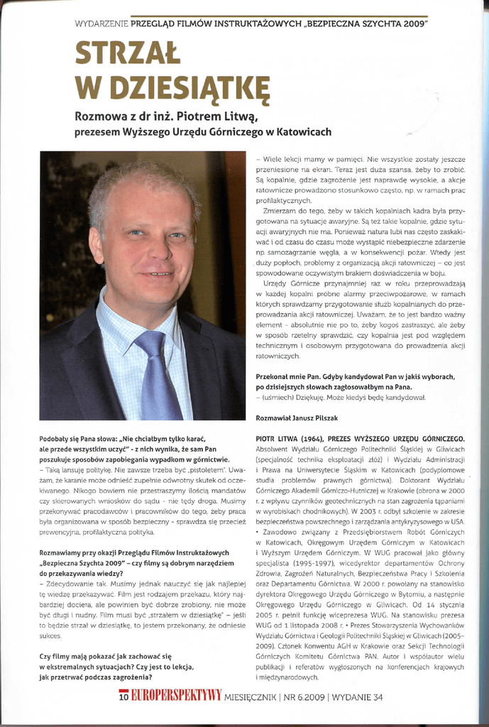 WYDARZENIE PRZEGLAD FILMOW INSTRUKTAZOWYCH ,,BEZPIECZNA SZYCHTA 2009" STRZAL W DZIESIATK^ Rozmowa z dr inz. Piotrem Litw§, prezesem Wyzszego Urzedu Gorniczego w Katowicach - Wiele lekcji mamy w pamieci. Nie wszystkie zostaty jeszcze przemesione na ekran. Teraz jest duza szansa, zeby to zrobic. Sa, kopalnie, gdzie zagrozenie jest naprawde wysokie, a akcje ratownicze prowadzono stosunkowo czesto, np. w ramach prac profilaktycznych. Zmierzam do tego, zeby w takich kopalniach kadra byla przygotowana na sytuacje awaryjne. 83 tez takie kopalnie, gdzie sytuacji awaryjnych nie ma. Poniewaz natura lubi nas czesto zaskakiwac i od czasu do czasu moze wysta.pic niebezpieczne zdarzenie np. samozagrzanie wegla, a w konsekwencji pozar. Wtedy jest duzy poploch, problemy z organizacj^ akcji ratowniczej - co jest spowodowane oczywistym brakiem doswiadczenia w boju. Urzedy Gornicze przynajmniej raz w roku przeprowadzaj^ w kazdej kopalni probne alarmy przeciwpozarowe, w ramach ktorych sprawdzamy przygotowanie stuzb kopalnianych do przeprowadzania akcji ratowniczej. Uwazam, ze to jest bardzo wazny element - absolutnie nie po to, zeby kogos zastraszyc, ale zeby w sposob rzetelny sprawdzic, czy kopalnia jest pod wzgledem technicznym i osobowym przygotowana do prowadzenia akcji ratowniczych. Przekonat mnie Pan. Gdyby kandydowal Pan w jakis wyborach, po dzisiejszych stowach zagtosowatbym na Pana. - (usmiech) Dziekuje. Moze kiedys bede kandydowat. Rozmawiat Janusz Pilszak Podobaty sitj Pana stowa: ,,Nie chcialbym tylko karac, PIOTR LITWA (1964), PREZES WYZSZEGO URZEDU GORNICZEGO. ale przede wszystkim uczyc" - z nich wynika, ze sam Pan Absolwent Wydziatu Gorniczego Politechniki Sl^skiej w Gliwicach poszukuje sposobow zapobiegania wypadkom w gornictwie. fspecjalnosc technika ekspLoatacji zEoz) i Wydziatu Administracji - Taka, lansuje polityke. Nie zawsze trzeba bye .pistoletem". Uwazam, ze karanie moze odniesc zupetnie odwrotny skutek od oczekiwanego. Nikogo bowiem nie przestraszymy iloscia^ mandatow czy skierowanych wnioskow do s^du - nie tedy droga. Musimy przekonywac pracodawcow i pracownikow do tego, zeby praca byta organizowana w sposob bezpieczny - sprawdza sie przeciez prewencyjna, profilaktyczna pohtyka. i Prawa na Uniwersytecie SL^skim w Katowicach (podyplomowe studia probLemow prawnych gornictwa). Doktorant Wydzialu Gorniczego Akademii Gorniczo-Hutniczej w Krakowie (obrona w 2000 r. z wptywu czynnikow geotechnicznych na stan zagrozenia tapaniami w wyrobiskach chodnikowych). W 2003 (- odbyl szkolenie w zakresie bezpieczeristwa powszechnego i zarz^dzania antykryzysowego w USA. - Zawodowo zwiazany z Przedsi^biorstwem Robot Gorniczych w Katowicach, Okr^gowym Urz^dem Gorniczym w Katowicach Rozmawiamy przy okazji PrzegUjdu Filmow Instruktazowych i Wyzszym Urz^dem Gorniczyrn. W WUG pracowal jako gtowny ,,Bezpieczna Szychta 2009" - czy filmy 53 dobrym narz^dziem specjalista (1995-1997), wicedyrektor departamentow Ochrony do przekazywania wiedzy? Zdrowia, Zagrozeri Naturalnych, Bezpieczeristwa Pracy i Szkolenia - Zdecydowanie tak. Musimy jednak nauczyc sie; jak najlepiej te wiedzy przekazywac. Film jest rodzajem przekazu, ktory najbardziej dociera, ale powinien bye dobrze zrobiony, nie moze bye dtugi i nudny. Film rnusi bye ..strzatem w dziesi^tke" - jesli to bedzie strzat w dziesi^tke, to jestem przekonany, ze odniesie sukces. oraz Departamentu Gornictwa. W 2000 r. powotany na stanowisko dyrektora Okr^gowego Urzedu Gorniczego w Bytomiu, a nast^pnie Okr^gowego Urz^du Gorniczego w GLiwicach. Od 14 stycznia 2005 r. petnit funkcj^ wiceprezesa WUG. Na stanowisku prezesa WUG od 1 Listopada 2008 r. • Prezes Stowarzyszenia Wychowankow Wydziatu Gornictwa i Geologii Politechniki Sl^skiej w Gliwicach (20052009}. Cztonek Konwentu AGH w Krakowie oraz Sekcji Technologii Czy filmy maj$ pokazacjak zachowac si^ Gorniczych Komitetu Gornictwa PAN. Autor i wspotautor wielu wekstremalnych sytuacjach? Czy jest to lekcja, publikacji i referatow wygtoszonych na konferencjach krajowych jak przetrwac podczas zagrozenia? i rni^dzynarodowych. 10 EIWBRSPBKTWY MIESI^CZNIK [ NR 6.2009 | WYDANIE 34