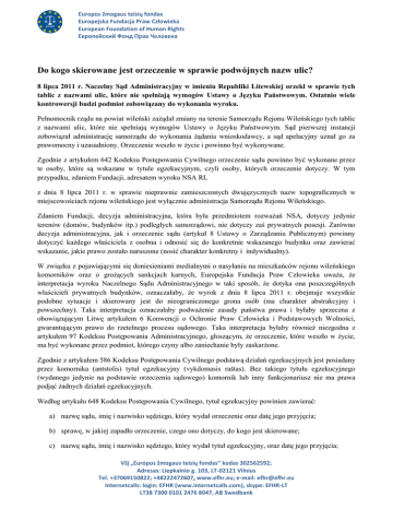 Europos žmogaus teisių fondas Europejska Fundacja Praw Człowieka European Foundation of Human Rights Европейский Фонд Прав Человека Do kogo skierowane jest orzeczenie w sprawie podwójnych nazw ulic? 8 lipca 2011 r. Naczelny Sąd Administracyjny w imieniu Republiki Litewskiej orzekł w sprawie tych tablic z nazwami ulic, które nie spełniają wymogów Ustawy o Języku Państwowym. Ostatnio wiele kontrowersji budzi podmiot zobowiązany do wykonania wyroku. Pełnomocnik rządu na powiat wileński zażądał zmiany na terenie Samorządu Rejonu Wileńskiego tych tablic z nazwami ulic, które nie spełniają wymogów Ustawy o Języku Państwowym. Sąd pierwszej instancji zobowiązał administrację samorządu do wykonania żądania wnioskodawcy, a sąd apelacyjny uznał go za prawomocny i uzasadniony. Orzeczenie weszło w życie i powinno być wykonywane. Zgodnie z artykułem 642 Kodeksu Postępowania Cywilnego orzeczenie sądu powinno być wykonane przez te osoby, które są wskazane w tytule egzekucyjnym, czyli osoby, których orzeczenie dotyczy. W tym przypadku, zdaniem Fundacji, adresatem wyroku NSA RL z dnia 8 lipca 2011 r. w sprawie nieprawnie zamieszczonych dwujęzycznych nazw topograficznych w miejscowościach rejonu wileńskiego jest wyłącznie administracja Samorządu Rejonu Wileńskiego. Zdaniem Fundacji, decyzja administracyjna, która była przedmiotem rozważań NSA, dotyczy jedynie terenów (domów, budynków itp.) podległych samorządowi, nie dotyczy zaś prywatnych posesji. Zarówno decyzja administracyjna, jak i orzeczenie sądu (artykuł 8 Ustawy o Zarządzaniu Publicznym) powinny dotyczyć każdego właściciela z osobna i odnosić się do konkretnie wskazanego budynku oraz zawierać wskazanie, jakie prawo zostało naruszone (nosić charakter konkretny i indywidualny). W związku z pojawiającymi się doniesieniami medialnymi o nasyłaniu na mieszkańców rejonu wileńskiego komorników oraz o grożących sankcjach karnych, Europejska Fundacja Praw Człowieka uważa, że interpretacja wyroku Naczelnego Sądu Administracyjnego w taki sposób, że dotyka ona poszczególnych właścicieli prywatnych budynków, oznaczałaby, że wyrok z dnia 8 lipca 2011 r. obejmuje wszystkie podobne sytuacje i skierowany jest do nieograniczonego grona osób (ma charakter abstrakcyjny i powszechny). Taka interpretacja oznaczałaby podważenie zasady państwa prawa i byłaby sprzeczna z obowiązującym Litwę artykułem 6 Konwencji o Ochronie Praw Człowieka i Podstawowych Wolności, gwarantującym prawo do rzetelnego procesu sądowego. Taka interpretacja byłaby również niezgodna z artykułem 97 Kodeksu Postępowania Administracyjnego, głoszącym, że orzeczenie, które weszło w życie, ma być wykonane przez podmiot, którego czyny albo zaniechanie były zaskarżone. Zgodnie z artykułem 586 Kodeksu Postępowania Cywilnego podstawą działań egzekucyjnych jest posiadany przez komornika (antstolis) tytuł egzekucyjny (vykdomasis raštas). Bez takiego tytułu egzekucyjnego (wydanego jedynie na podstawie orzeczenia sądowego) komornik lub inny funkcjonariusz nie ma prawa podjąć żadnych działań egzekucyjnych. Według artykułu 648 Kodeksu Postępowania Cywilnego, tytuł egzekucyjny powinien zawierać: a) nazwę sądu, imię i nazwisko sędziego, który wydał orzeczenie oraz datę jego przyjęcia; b) sprawę, w jakiej zapadło orzeczenie, czego ono dotyczy, do kogo jest skierowane; c) nazwę sądu, imię i nazwisko sędziego, który wydał tytuł egzekucyjny, oraz datę jego przyjęcia; VšĮ „Europos žmogaus teisių fondas“ kodas 302562592; Adresas: Liepkalnio g. 103, LT-02121 Vilnius Tel. +37069150822; +48222472607, www.efhr.eu; e-mail: [email protected] Internetcalls: login: EFHR (www.internetcalls.com), skype: EFHR-LT LT38 7300 0101 2476 8047, AB Swedbank d) termin, w ciągu którego orzeczenie nabrało mocy; e) dokładna nazwa windykatora i dłużnika, jego adres, PESEL’e (asmens kodas) lub REGON’y (įmonės kodas), i inne dane umożliwiające identyfikację. Komornik ma prawo wstępu do posesji dłużnika bez jego pozwolenia jedynie wówczas, jeśli możliwość taką przewiduje tytuł egzekucyjny. Warto także zwrócić uwagę na to, że artykuł 592 Kodeksu Postępowania Cywilnego przewiduje ramy czasowe, kiedy egzekucja może się odbyć — nie wcześniej niż od godziny 6.00 rano i nie później niż do godziny 22.00 (dni robocze). Wyjątek stanowią pilne sprawy egzekucyjne. Prawomocność działań komornika nadzoruje sędzia sądu rejonowego, na którego terytorium działa komornik. Ten sam przepis przewiduje również prawo do tłumacza (w wypadku nieznajomości języka państwowego) — wówczas należy zwrócić się na piśmie do komornika. Należy z całą stanowczością podkreślić, że sąd może w orzeczeniu nałożyć obowiązki jedynie na te osoby, które były stroną postępowania. Tylko takie osoby powinny wykonywać orzeczenie sądowe i podporządkować się komornikowi. Tym samym orzeczenie sądowe nie dotyczy tych, którzy nie byli stronami sporu i tym samym nie mają prawnego obowiązku realizacji takiego orzeczenia. Warto również dodać, że alternatywnym zewnętrznym sposobem oznakowania ulic na domach w języku polskim jest tworzenie napisu poprzez malowanie ściany od strony ulicy. W istocie oznacza to, że nazwa ulicy dużymi literami jest namalowana na ścianie domu. Stanowi to zarówno przekaz informacyjny, jak i pewien sposób dekoracji domu. Jeżeli otrzymacie Państwo jakiekolwiek pismo z urzędów lub sądu w tej sprawie prosimy o pilny kontakt z Fundacją. Ważne jest to, aby nie przekroczyć terminów, w ciągu których można się odwołać od decyzji lub je zaskarżyć. Europejska Fundacja Praw Człowieka zapewnia, że udzieli Państwu bezpłatnej pomocy prawnej włącznie z reprezentowaniem przed sądami krajowymi oraz międzynarodowymi. Jeżeli ktokolwiek będzie próbował wkraczać na Państw