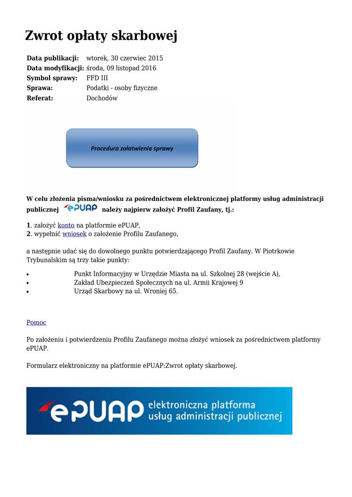Zwrot opłaty skarbowej Data publikacji: wtorek, 30 czerwiec 2015 Data modyfikacji: środa, 09 listopad 2016 Symbol sprawy: FFD III Sprawa: Podatki - osoby fizyczne Referat: Dochodów W celu złożenia pisma/wniosku za pośrednictwem elektronicznej platformy usług administracji publicznej należy najpierw założyć Profil Zaufany, tj.: 1. założyć konto na platformie ePUAP, 2. wypełnić wniosek o założenie Profilu Zaufanego, a następnie udać się do dowolnego punktu potwierdzającego Profil Zaufany. W Piotrkowie Trybunalskim są trzy takie punkty: ● ● ● Punkt Informacyjny w Urzędzie Miasta na ul. Szkolnej 28 (wejście A), Zakład Ubezpieczeń Społecznych na ul. Armii Krajowej 9 Urząd Skarbowy na ul. Wroniej 65. Pomoc Po założeniu i potwierdzeniu Profilu Zaufanego można złożyć wniosek za pośrednictwem platformy ePUAP. Formularz elektroniczny na platformie ePUAP:Zwrot opłaty skarbowej.