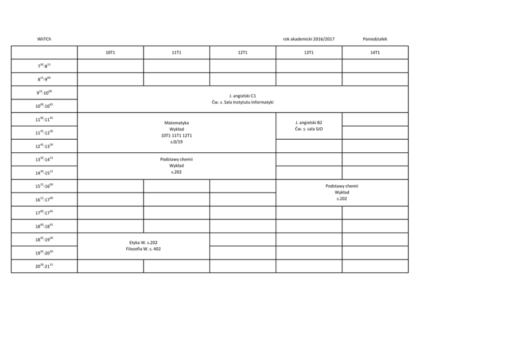 WIiTCh 10T1 11T1 12T1 rok akademicki 2016/2017 Poniedziałek 13T1 14T1 730-815 815-900 915-1000 J. angielski C1 Ćw. s. Sala Instytutu Informatyki 1000-1045 1100-1145 Matematyka Wykład 10T1 11T1 12T1 s.0/19 1145-1230 1245-1330 1330-1415 1430-1515 Podstawy chemii Wykład s.202 1515-1600 Podstawy chemii Wykład s.202 1615-1700 1700-1745 1800-1845 1845-1930 45 19 -20 30 2030-2115 J. angielski B2 Ćw. s. sala SJO Etyka W. s.202 Filozofia W. s. 402 WIiTCh 730-815 15 8 -9 00 915-1000 10T1 11T1 12T1 Fizyka - Lab s.F115 7.30-9.45 I poł. sem. Fizyka - ćw s.F202 9.00-9.45 II poł. sem Fizyka - Lab s.F115 7.30-9.45 I poł. sem. Fizyka - ćw s.F202 9.00-9.45 II poł. sem Fizyka - Lab s.F016 7.30-9.45 I poł. sem. rok akademicki 2016/2017 Wtorek 13T1 14T1 Zarzadzanie jakością W. s. 402 1000-1045 Fizyka - Wykład s.F101 Matematyka Wykład s.202 1100-1145 1145-1230 1245-1330 30 13 -14 15 1430-1515 1515-1600 Fizyka - ćw s.F203 I poł. sem Fizyka - ćw s.F203 II poł. sem Fizyka - ćw s.F203 Podstawy chemii Ćw. s. 134 Matematyka ćw. s. 135 Matematyka ćw. s. 133 Podstawy chemii Ćw. s. 134 1615-1700 1700-1745 1800-1845 1845-1930 1945-2030 2030-2115 Etyka W. s.0/19 Filozofia W. s. 402 WIiTCh 10T1 11T1 12T1 730-815 rok akademicki 2016/2017 Środa 13T1 14T1 Fizyka - ćw s.F101 I poł. sem. Fizyka - ćw s.F101 II poł. sem. 815-900 Fizyka - Wykład s.F101 915-1000 1000-1045 J. angielski B2 Ćw. s. sala SJO 1100-1145 Matematyka ćw s 0/10 1145-1230 1245-1330 30 13 -14 15 Matematyka ćwiczenia s. 0/10 1430-1515 1615-1700 1800-1845 1845-1930 1945-2030 2030-2115 J. angielski B2 Ćw. s. 135 Technol. informacyjna W. tyg. nieparz. s. 402 1515-1600 1700-1745 J. angielski B2 Ćw. s.135 Podstawy chemii Ćw. 10T1 s135 Fizyka - ćw s.F202 10.00-10.45 II poł sem. Fizyka - Lab s.F115 10.00-12.15 I poł. sem. Fizyka - ćw s.F202 10.00-10.45 I poł sem. Fizyka - Lab s.F115 10.00-12.15 II poł. sem. J. angielski B2 Ćw. s. sala SJO 150 Technol. informacyjna W. tyg. parz. s. 402 WIiTCh 10T1 11T1 rok akademicki 2016/2017 Czwartek 12T1 13T1 14T1 Matematyka ćw 12T1 s 0/10 Technol. informac. tyg. nieparz. Lab. s. 135, 136 (IMK) Technol. informac. tyg. parz. Lab. s. 135, 136 (IMK) 730-815 815-900 915-1000 1000-1045 1100-1145 1145-1230 1245-1330 1330-1415 1430-1515 15 15 -16 00 1615-1700 1700-1745 Technol. informac. tyg. nieparz. Lab. s. 135, 136 (IMK) Technol. informac. tyg. parz. Lab. s. 135, 136 (IMK) Podstawy chemii Ćw. s. 134 Zarzadzanie jakością W. s. 402 Podstawy chemii Ćw. s. 134 Technol. informac. tyg. nieparz. Lab. s. 135, 136 (IMK) 1800-1845 J. niemiecki – ćw s. 149b (SJO) 1845-1930 1945-2030 2030-2115 WIiTCh 10T1 730-815 815-900 915-1000 1000-1045 1100-1145 1145-1230 1245-1330 1330-1415 1430-1515 1515-1600 1615-1700 1700-1745 1800-1845 1845-1930 1945-2030 2030-2115 11T1 12T1 rok akademicki 2016/2017 Piątek 13T1 14T1