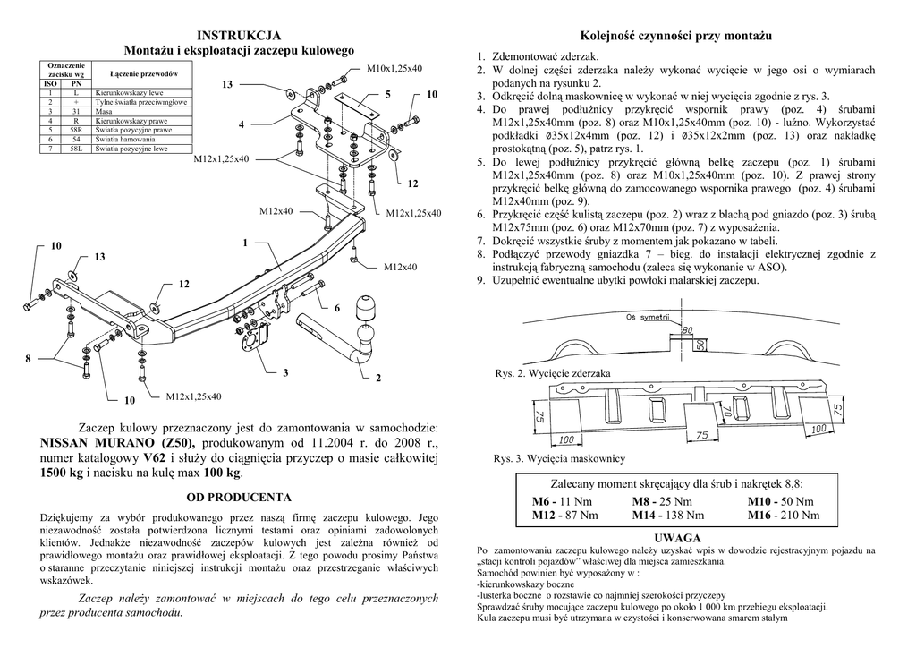 INSTRUKCJA MontaŜu i eksploatacji zaczepu kulowego Oznaczenie zacisku wg ISO PN 1 L 2 + 3 31 4 R 5 58R 6 54 7 58L Kolejność czynności przy montaŜu M10x1,25x40 Łączenie przewodów 13 Kierunkowskazy lewe Tylne światła przeciwmgłowe Masa Kierunkowskazy prawe Światła pozycyjne prawe Światła hamowania Światła pozycyjne lewe 5 10 4 M12x1,25x40 12 M12x40 M12x1,25x40 1 10 13 M12x40 12 1. Zdemontować zderzak. 2. W dolnej części zderzaka naleŜy wykonać wycięcie w jego osi o wymiarach podanych na rysunku 2. 3. Odkręcić dolną maskownicę w wykonać w niej wycięcia zgodnie z rys. 3. 4. Do prawej podłuŜnicy przykręcić wspornik prawy (poz. 4) śrubami M12x1,25x40mm (poz. 8) oraz M10x1,25x40mm (poz. 10) - luźno. Wykorzystać podkładki ø35x12x4mm (poz. 12) i ø35x12x2mm (poz. 13) oraz nakładkę prostokątną (poz. 5), patrz rys. 1. 5. Do lewej podłuŜnicy przykręcić główną belkę zaczepu (poz. 1) śrubami M12x1,25x40mm (poz. 8) oraz M10x1,25x40mm (poz. 10). Z prawej strony przykręcić belkę główną do zamocowanego wspornika prawego (poz. 4) śrubami M12x40mm (poz. 9). 6. Przykręcić część kulistą zaczepu (poz. 2) wraz z blachą pod gniazdo (poz. 3) śrubą M12x75mm (poz. 6) oraz M12x70mm (poz. 7) z wyposaŜenia. 7. Dokręcić wszystkie śruby z momentem jak pokazano w tabeli. 8. Podłączyć przewody gniazdka 7 – bieg. do instalacji elektrycznej zgodnie z instrukcją fabryczną samochodu (zaleca się wykonanie w ASO). 9. Uzupełnić ewentualne ubytki powłoki malarskiej zaczepu. 6 8 3 10 2 Rys. 2. Wycięcie zderzaka M12x1,25x40 Zaczep kulowy przeznaczony jest do zamontowania w samochodzie: NISSAN MURANO (Z50), produkowanym od 11.2004 r. do 2008 r., numer katalogowy V62 i słuŜy do ciągnięcia przyczep o masie całkowitej 1500 kg i nacisku na kulę max 100 kg. OD PRODUCENTA Dziękujemy za wybór produkowanego przez naszą firmę zaczepu kulowego. Jego niezawodność została potwierdzona licznymi testami oraz opiniami zadowolonych klientów. JednakŜe niezawodność zaczepów kulowych jest zaleŜna równieŜ od prawidłowego montaŜu oraz prawidłowej eksploatacji. Z tego powodu prosimy Państwa o staranne przeczytanie niniejszej instrukcji montaŜu oraz przestrzeganie właściwych wskazówek. Zaczep naleŜy zamontować w miejscach do tego celu przeznaczonych przez producenta samochodu. Rys. 3. Wycięcia maskownicy Zalecany moment skręcający dla śrub i nakrętek 8,8: M6 - 11 Nm M8 - 25 Nm M10 - 50 Nm M12 - 87 Nm M14 - 138 Nm M16 - 210 Nm UWAGA Po zamontowaniu zaczepu kulowego naleŜy uzyskać wpis w dowodzie rejestracyjnym pojazdu na „stacji kontroli pojazdów” właściwej dla miejsca zamieszkania. Samochód powinien być wyposaŜony w : -kierunkowskazy boczne -lusterka boczne o rozstawie co najmniej szerokości przyczepy Sprawdzać śruby mocujące zaczepu kulowego po około 1 000 km przebiegu eksploatacji. Kula zaczepu musi być utrzymana w czystości i konserwowana smarem stałym PPUH AUTO-HAK S.J. WyposaŜenie zaczepu: Produkcja Zaczepów Kulowych Henryk & Zbigniew Nejman 76-200 SŁUPSK ul. Słoneczna 16K tel/fax (059) 8-414-414; 8-414-413 E-mail: [email protected] www. autohak.com.pl Zaczep kulowy bez wyposaŜenia elektrycznego V62 Klasa: A50-X Nr kat. Przeznaczony do zamontowania w samochodzie: Producent: NISSAN Model: MURANO (Z50) produkowanym od 11.2004 r. do 2008 r. Dane techniczne: wartość siły D: 9,1 kN maksymalna masa przyczepy: 1500 kg maksymalny nacisk na kulę: 100 kg Numer homologacji zgodnie z dyrektywą 94/20/WE: e20*94/20*0093*00 KARTA GWARANCYJNA Producent udziela gwarancji niniejszą kartą gwarancyjną na okres 24 miesięcy licząc od dnia zakupu zaczepu kulowego do samochodu: NISSAN MURANO produkowanego od 11.2004 r. do 2008 r. Data produkcji .............................. Data zakupu.................................. Zakres gwarancji obejmuje wyłącznie wady jakościowe wynikające z winy producenta. Gwarancja nie obejmuje natomiast uszkodzeń zawinionych przez nabywcę, wynikających z niewłaściwego montaŜu, uŜytkowania lub konserwacji, uszkodzeń mechanicznych, normalnego zuŜycia podczas eksploatacji itp. Gwarancja udzielona na zakupiony towar nie wyłącza, nie ogranicza ani nie zawiesza uprawnień kupującego wynikających z niezgodności towaru z umową. Reklamacje naleŜy zgłaszać w punkcie sprzedaŜy, składając jednocześnie kartę gwarancyjną. Usunięcie "wady" następuje po stwierdzeniu przez punkt sprzedaŜy wspólnie z producentem słuszności złoŜonej reklamacji. Reklamacja powinna być załatwiona w ciągu 14 dni od dnia uznania reklamacji. Karta gwarancyjna jest niewaŜna jeŜeli nie jest wypełniona i podpisana. Data zgłoszenia reklamacji: ................................................................... INFORMACJA WSTĘPNA Zaczep kulowy jest skonstruowany zgodnie z zasadami bezpieczeństwa ruchu drogowego. Zaczep kulowy jest elementem wpływającym na bezpieczeństwo jazdy i moŜe zostać zainstalowany wyłącznie przez personel wyspecjalizowany. Niedopuszczalne jest dokonywanie jakichkolwiek zmian w konstrukcji zaczepu. Powoduje to wygaśniecie dopuszczenia do stosowania. W przypadku obecności masy izolacyjnej lub osłony podwozia w miejscu przylegania zaczepu, naleŜy ją usunąć. Nieosłonięte miejsca karoserii oraz wywiercone otwory naleŜy pomalować farbą antykorozyjną. Informacjami wiąŜącymi odnośnie wartości obciąŜeń są dane podawane przez producenta samochodu, względnie wartości maksymalnej masy przyczepy oraz maksymalnego nacisku na kulę, przy czym wartości parametrów zaczepu kulowego nie mogą być przekroczone. Wzór do obliczania wartości siły D: Maks. masa przyczepy [kg] x Maks. masa samochodu [kg] Maks. masa przyczepy [kg] + Maks. masa samochodu [kg] X 9,81 = 1000 D [kN]