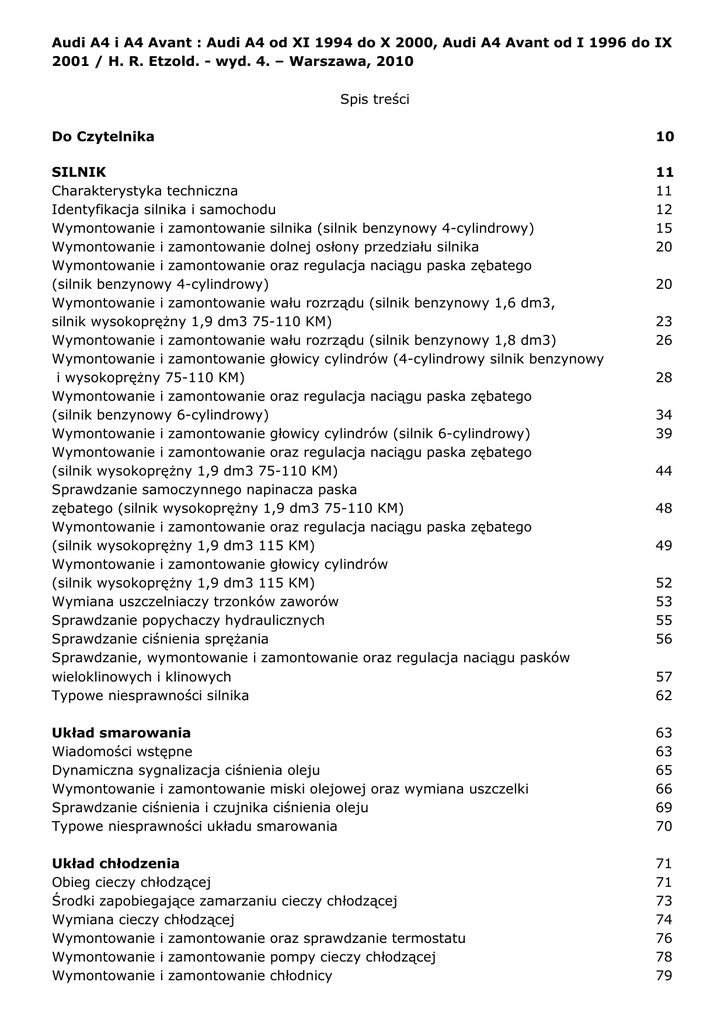 Audi A4 i A4 Avant : Audi A4 od XI 1994 do X 2000, Audi A4 Avant od I 1996 do IX 2001 / H. R. Etzold. - wyd. 4. – Warszawa, 2010 Spis treści Do Czytelnika 10 SILNIK Charakterystyka techniczna Identyfikacja silnika i samochodu Wymontowanie i zamontowanie silnika (silnik benzynowy 4-cylindrowy) Wymontowanie i zamontowanie dolnej osłony przedziału silnika Wymontowanie i zamontowanie oraz regulacja naciągu paska zębatego (silnik benzynowy 4-cylindrowy) Wymontowanie i zamontowanie wału rozrządu (silnik benzynowy 1,6 dm3, silnik wysokopręŜny 1,9 dm3 75-110 KM) Wymontowanie i zamontowanie wału rozrządu (silnik benzynowy 1,8 dm3) Wymontowanie i zamontowanie głowicy cylindrów (4-cylindrowy silnik benzynowy i wysokopręŜny 75-110 KM) Wymontowanie i zamontowanie oraz regulacja naciągu paska zębatego (silnik benzynowy 6-cylindrowy) Wymontowanie i zamontowanie głowicy cylindrów (silnik 6-cylindrowy) Wymontowanie i zamontowanie oraz regulacja naciągu paska zębatego (silnik wysokopręŜny 1,9 dm3 75-110 KM) Sprawdzanie samoczynnego napinacza paska zębatego (silnik wysokopręŜny 1,9 dm3 75-110 KM) Wymontowanie i zamontowanie oraz regulacja naciągu paska zębatego (silnik wysokopręŜny 1,9 dm3 115 KM) Wymontowanie i zamontowanie głowicy cylindrów (silnik wysokopręŜny 1,9 dm3 115 KM) Wymiana uszczelniaczy trzonków zaworów Sprawdzanie popychaczy hydraulicznych Sprawdzanie ciśnienia spręŜania Sprawdzanie, wymontowanie i zamontowanie oraz regulacja naciągu pasków wieloklinowych i klinowych Typowe niesprawności silnika 11 11 12 15 20 Układ smarowania Wiadomości wstępne Dynamiczna sygnalizacja ciśnienia oleju Wymontowanie i zamontowanie miski olejowej oraz wymiana uszczelki Sprawdzanie ciśnienia i czujnika ciśnienia oleju Typowe niesprawności układu smarowania 63 63 65 66 69 70 Układ chłodzenia Obieg cieczy chłodzącej Środki zapobiegające zamarzaniu cieczy chłodzącej Wymiana cieczy chłodzącej Wymontowanie i zamontowanie oraz sprawdzanie termostatu Wymontowanie i zamontowanie pompy cieczy chłodzącej Wymontowanie i zamontowanie chłodnicy 71 71 73 74 76 78 79 20 23 26 28 34 39 44 48 49 52 53 55 56 57 62 Sprawdzanie wyłącznika termicznego dodatkowego wentylatora elektrycznego Sprawdzenia wentylatora chłodnicy Sprawdzanie szczelności układu chłodzenia Typowe niesprawności układu chłodzenia 80 80 81 81 Układ zapłonowy, świece zapłonowe Wiadomości wstępne Wymontowanie i zamontowanie rozdzielacza zapłonu Sprawdzanie i regulacja kąta wyprzedzenia zapłonu Sprawdzanie układu zapłonowego i cewki zapłonowej (silnik benzynowy 1,6 dm3) Sprawdzanie układu zapłonowego i cewki zapłonowej (silnik benzynowy1,8 dm3 125 KM) Sprawdzanie układu zapłonowego i cewki zapłonowej (silnik benzynowy 1,8 dm3 150 KM) Sprawdzanie cewki zapłonowej Sprawdzanie czujnika prędkości obrotowej silnika Świece zapłonowe Wymontowanie i zamontowanie świec zapłonowych Typowe niesprawności układu zapłonowego 82 82 84 86 87 Obwód doprowadzenia paliwa Wiadomości wstępne Wykonanie i podłączenie obwodu zdalnego sterowania pompą paliwa Sprawdzanie pompy paliwa Sprawdzanie przekaźnika pompy paliwa Wymontowanie i zamontowanie pompy paliwa i czujnika poziomu paliwa Regulacja linki przepustnicy 96 96 96 96 98 99 101 Układ wtrysku benzyny Wiadomości wstępne Wymontowanie i zamontowanie oraz sprawdzanie czujnika temperatury cieczy chłodzącej Sprawdzanie wtryskiwaczy paliwa Wymontowanie i zamontowanie wtryskiwaczy, sprawdzanie kształtu strumienia Wtryskiwanego paliwa i szczelności Układ wtrysku benzyny silnika 6-cylindrowego Wymontowanie i zamontowanie wtryskiwaczy silnika 6-cylindrowego Sprawdzanie wtryskiwaczy układów wtrysku MPI i MPFI Dane techniczne układu wtrysku benzyny Typowe niesprawności układu wtrysku benzyny 103 103 Układ wtryskowy silnika wysokopręŜnego Wiadomości wstępne Sprawdzanie układu podgrzewania wstępnego i świec Ŝarowych Wymontowanie i zamontowanie wtryskiwaczy Sprawdzanie i regulacja początku tłoczenia pompy wtryskowej Sprawdzanie szczelności obwodu doprowadzenia paliwa Urządzenie podgrzewające filtr paliwa Typowe niesprawności układu wtryskowego silnika wysokopręŜnego 117 117 118 120 121 123 125 125 88 88 90 91 92 92 95 106 107 108 109 112 113 114 115 Układ wylotowy TurbospręŜarka Działanie katalizatora spalin UŜytkowanie samochodu z katalizatorem spalin Wymontowanie i zamontowanie elementów układu wylotowego Wymiana tłumika przedniego i tylnego Sprawdzanie szczelności układu wylotowego Wymontowanie i zamontowanie sondy lambda 126 126 127 128 128 131 132 132 SPRZĘGŁO Wiadomości wstępne Wymontowanie i zamontowanie oraz sprawdzanie sprzęgła Odpowietrzanie układu sterowania sprzęgła Typowe niesprawności sprzęgła 133 133 134 137 138 SKRZYNKA PRZEKŁADNIOWA, MECHANIZM ZMIANY BIEGÓW, AUTOMATYCZNA SKRZYNKA PRZEKŁADNIOWA Wymontowanie i zamontowanie mechanicznej skrzynki przekładniowej Sprawdzanie poziomu i uzupełnianie oleju w skrzynce przekładniowej Napęd wszystkich kół Regulacja mechanizmu zmiany biegów Automatyczna skrzynka przekładniowa Regulacja linki dźwigni wyboru biegów 140 140 143 143 145 147 147 ZAWIESZENIE PRZEDNIE I PÓŁOSIE NAPĘDOWE Wymontowanie i zamontowanie kolumny zawieszenia Wymontowanie i zamontowanie amortyzatora, rozkładanie kolumny zawieszenia Wymontowanie i zamontowanie półosi napędowych Rozkładanie i składanie półosi 149 151 153 156 159 ZAWIESZENIE TYLNE Wymontowanie i zamontowanie kolumny zawieszenia Wymontowanie i zamontowanie amortyzatora, rozkładanie kolumny zawieszenia Sprawdzanie amortyzatora Złomowanie amortyzatora Wymontowanie i zamontowanie łoŜysk koła Regulacja luzu łoŜysk koła 163 163 166 169 170 172 172 UKŁAD KIEROWNICZY Wiadomości wstępne Wymontowanie i zamontowanie koła kierownicy Wymontowanie i zamontowanie zespołu poduszki powietrznej z koła kierownicy Wymontowanie i zamontowanie drąŜka kierowniczego 175 175 177 178 179 UST