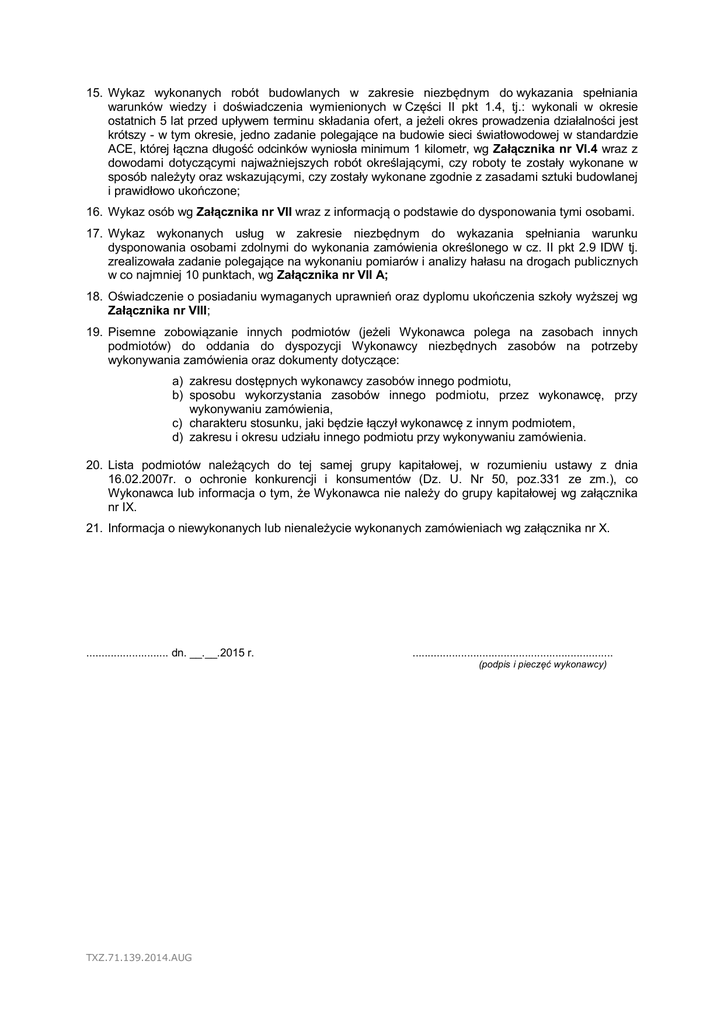 15. Wykaz wykonanych robót budowlanych w zakresie niezbędnym do wykazania spełniania warunków wiedzy i doświadczenia wymienionych w Części II pkt 1.4, tj.: wykonali w okresie ostatnich 5 lat przed upływem terminu składania ofert, a jeżeli okres prowadzenia działalności jest krótszy - w tym okresie, jedno zadanie polegające na budowie sieci światłowodowej w standardzie ACE, której łączna długość odcinków wyniosła minimum 1 kilometr, wg Załącznika nr VI.4 wraz z dowodami dotyczącymi najważniejszych robót określającymi, czy roboty te zostały wykonane w sposób należyty oraz wskazującymi, czy zostały wykonane zgodnie z zasadami sztuki budowlanej i prawidłowo ukończone; 16. Wykaz osób wg Załącznika nr VII wraz z informacją o podstawie do dysponowania tymi osobami. 17. Wykaz wykonanych usług w zakresie niezbędnym do wykazania spełniania warunku dysponowania osobami zdolnymi do wykonania zamówienia określonego w cz. II pkt 2.9 IDW tj. zrealizowała zadanie polegające na wykonaniu pomiarów i analizy hałasu na drogach publicznych w co najmniej 10 punktach, wg Załącznika nr VII A; 18. Oświadczenie o posiadaniu wymaganych uprawnień oraz dyplomu ukończenia szkoły wyższej wg Załącznika nr VIII; 19. Pisemne zobowiązanie innych podmiotów (jeżeli Wykonawca polega na zasobach innych podmiotów) do oddania do dyspozycji Wykonawcy niezbędnych zasobów na potrzeby wykonywania zamówienia oraz dokumenty dotyczące: a) zakresu dostępnych wykonawcy zasobów innego podmiotu, b) sposobu wykorzystania zasobów innego podmiotu, przez wykonawcę, przy wykonywaniu zamówienia, c) charakteru stosunku, jaki będzie łączył wykonawcę z innym podmiotem, d) zakresu i okresu udziału innego podmiotu przy wykonywaniu zamówienia. 20. Lista podmiotów należących do tej samej grupy kapitałowej, w rozumieniu ustawy z dnia 16.02.2007r. o ochronie konkurencji i konsumentów (Dz. U. Nr 50, poz.331 ze zm.), co Wykonawca lub informacja o tym, że Wykonawca nie należy do grupy kapitałowej wg załącznika nr IX. 21. Informacja o niewykonanych lub nienależycie wykonanych zamówieniach wg załącznika nr X. ........................... dn. __.__.2015 r. .................................................................. (podpis i pieczęć wykonawcy) TXZ.71.139.2014.AUG