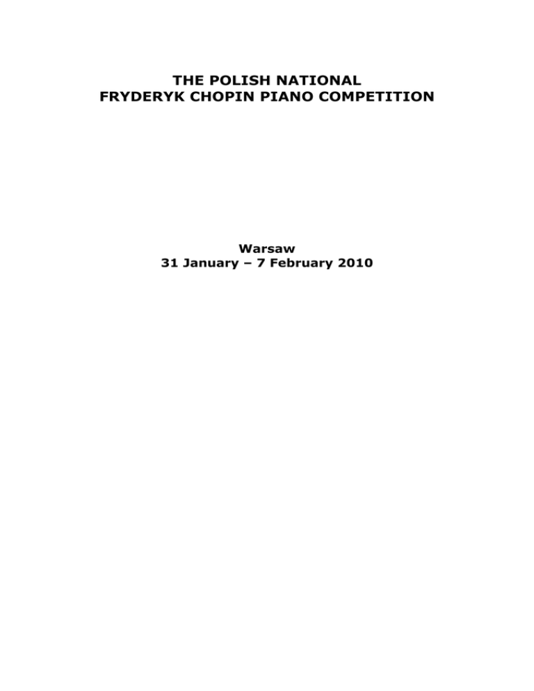 THE POLISH NATIONAL FRYDERYK CHOPIN PIANO COMPETITION Warsaw 31 January – 7 February 2010 THE FRYDERYK CHOPIN UNIVERSITY OF MUSIC 2 Okólnik Str. Henryk Melcer Hall STAGE I 31 January – 1 February 2010 STAGE II 2–3 February 2010 auditions begin at 10.00 and at 16.00 Rehearsals with the orchestra 4 February 2010 The Concert Hall THE FINAL 5–6 February 2010 auditions begin at 18.00 The Finalists will be accompanied by the Fryderyk Chopin University of Music Symphony Orchestra under the direction of Monika Wolińska THE PRIZE WINNERS’ CONCERT Sunday, 7 January 2010 at 18.00 RULES OF THE COMPETITION I 1. The Polish National Fryderyk Chopin Piano Competition, organised by the Fryderyk Chopin Institute, will be held in Warsaw from 31 January to 7 February 2010. 2. Auditions will be open to the public and will be held in three stages. The finalists (Stage III) will be accompanied by the Fryderyk Chopin University of Music Symphony Orchestra. II The Competition is open to pianists born between 1980-1993 who are Polish nationals or foreigners who are / were studying at Polish musical universities. III 1. The participation application form, enclosed with these Rules, should be completed legibly in block letters and mailed (postmarked) no later than 4 January 2010 to: Biuro Konkursów Chopinowskich Narodowy Instytut Fryderyka Chopina Pl. Piłsudskiego 9 00-078 Warszawa Poland Supplementary documents will include: a) short biographical note b) reference from the music school / department head (for students) or copy of the music school degree (for graduates) c) copy of document bearing the applicant’s date of birth d) document certifying that a foreign national is / was studying at a Polish musical university (for foreigners) e) record of entrance fee payment The entrance fee of 200 PLN should be paid into the bank account no. 84 1750 0009 0000 0000 0627 9139, indicating the Institute’s name and address (Narodowy Instytut Fryderyka Chopina, Pl. Piłsudskiego 9, 00-078 Warszawa), the applicant’s name and purpose of payment. 2. Applications sent after 4 January 2010 will not be accepted. 3. Applicants will be notified by phone or e-mail of their acceptance or rejection no later than 18 January 2010. The Competition Office will notify applicants of the audition dates during the week preceding the start of the Competition. 4. In the event of the applicant’s resignation the entrance fee will not be refunded. IV 1. Participants are required to register with the Competition Office at the set date. 2. Participants who are not Warsaw residents will not be reimbursed for the cost of their travel and stay in Warsaw. 3. Participants will make their own accommodation arrangements. The Competition Office will not be responsible for the booking of hotel or private accommodation in Warsaw. V 1. Auditions will be held in the alphabetical order of the participants’ names, beginning with the drawn letter. This order will in principle be followed throughout the Competition. 2. In principle not more than fifteen participants will be passed into the second stage and not more than eight into the Final. 3. For organisation and programme related reasons the Competition Office will have the right to change the sequence of a day’s auditions. A contestant may be allowed to perform outside the established sequence, at the end of the auditions, only in the event of his/her illness confirmed in writing by a doctor. Such altered order of auditions will be irrevocable until the end of the Competition. VI The Competition Programme will include the following works to be played from memory: Stage I a) A sonata by Joseph Haydn (a cyclic form in three movements) Two etudes by Fryderyk Chopin, one from each (a, b) group: C major op. 10 no. 1 C sharp minor op. 10 no. 4 G flat major op. 10 no. 5 F major op. 10 no. 8 C minor op. 10 no. 12 A minor op. 25 no. 11 b) A minor op. 10 no. 2 C major op. 10 no. 7 A flat major op. 10 no. 10 E flat major op. 10 no. 11 A minor op. 25 no. 4 E minor op. 25 no. 5 G sharp minor op. 25 no. 6 B minor op. 25 no. 10 One virtuoso etude by any composer (excluding Chopin) Performing time under 30 minutes Stage II Robert Schumann – a piece or pieces of the contestant’s own choosing Fryderyk Chopin – pieces of the contestant’s own choosing (other than those performed in stage I), including an obligatory Scherzo or Ballade Total performing time: 45–50 minutes Stage III – The Final A piano concerto chosen from the following: Fryderyk Chopin: I Piano Concerto E minor op. 11 II Piano Concerto F minor op. 21 Ludwig van Beethoven III Piano Concerto C minor op. 37 IV Piano Concerto G major op. 58 V Piano Concerto E flat major 73 Robert Schumann Piano Concerto A minor op. 54 In the application form the applicant will indicate the exact time of performing each piece. The pieces may be performed in any sequence except the etudes (stage I point 2) which have to be played one after the other. VII 1. The Director of the Fryderyk Chopin Institute will appoint Chairman and Members of the Jury as proposed by the Competition Director. 2. The names of the Jurors will be made public. 3. The Jury will work in accordance with the rules approved by the Director of the Fryderyk Chopin Institute. VIII 1. The Fryderyk Chopin Institute will make available pianos for all contestants to practise. 2. Participants will have the opportunity to test the piano in the Musical University’s concert hall. Participants will receive the date, time and place of test-playing the concert hall piano and of practising on other pianos in the week preceding the start of the Competition. 3. Contestants passed into the Final will have two rehearsals with the orchestra. IX 1. The Jury will submit the list of prize winners to the Competition Director for approval. 2. The following prizes will be awarded: 1st prize 2nd prize 3rd prize 4th prize 5th prize 6th prize Special prize of 3000 PLN for the best performance of a piece by Ch