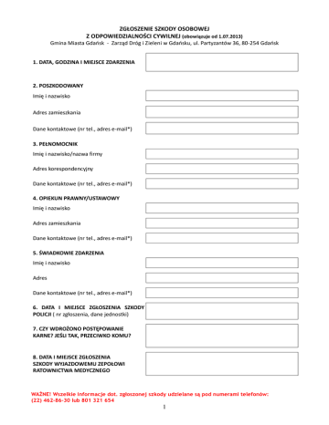 ZGŁOSZENIE SZKODY OSOBOWEJ Z ODPOWIEDZIALNOŚCI CYWILNEJ (obowiązuje od 1.07.2013) Gmina Miasta Gdańsk - Zarząd Dróg i Zieleni w Gdańsku, ul. Partyzantów 36, 80-254 Gdańsk 1. DATA, GODZINA I MIEJSCE ZDARZENIA 2. POSZKODOWANY Imię i nazwisko Adres zamieszkania Dane kontaktowe (nr tel., adres e-mail*) 3. PEŁNOMOCNIK Imię i nazwisko/nazwa firmy Adres korespondencyjny Dane kontaktowe (nr tel., adres e-mail*) 4. OPIEKUN PRAWNY/USTAWOWY Imię i nazwisko Adres zamieszkania Dane kontaktowe (nr tel., adres e-mail*) 5. ŚWIADKOWIE ZDARZENIA Imię i nazwisko Adres Dane kontaktowe (nr tel., adres e-mail*) 6. DATA I MIEJSCE ZGŁOSZENIA SZKODY POLICJI ( nr zgłoszenia, dane jednostki) 7. CZY WDROŻONO POSTĘPOWANIE KARNE? JEŚLI TAK, PRZECIWKO KOMU? 8. DATA I MIEJSCE ZGŁOSZENIA SZKODY WYJAZDOWEMU ZEPOŁOWI RATOWNICTWA MEDYCZNEGO WAŻNE! Wszelkie informacje dot. zgłoszonej szkody udzielane są pod numerami telefonów: (22) 462-86-30 lub 801 321 654 1 9. CZY DO SZKODY DOSZŁO PODCZAS ŚWIADCZENIA PRACY PRZEZ POSZKODWANEGO? JEŚLI TAK, CZY POWIADOMIONO O TYM FAKCIE, PRACODAWCĘ? CZY ZDARZENIE UZNANO ZA WYPADEK PRZY PRACY? 10. CZY DO SZKODY DOSZŁO W DRODZE DO PRACY LUB Z PRACY? JEŚLI TAK, CZY POWIADOMIONO O TYM FAKCIE, PRACODAWCĘ? CZY ZDARZENIE UZNANO ZA WYPADEK W DRODZE DO PRACY LUB Z PRACY ? 11. CZY SZKODA MIAŁA ZWIĄZEK WYPADKIEM KOMUNIKACYJNYM? 12. JAKIEGO RODZAJU SZKODY SPOWODOWAŁ WYPADEK (OSOBOWE, RZECZOWE)? 13. CZY WYPADEK SPOWODOWAŁ ŚMIERĆ? 14. CZY LECZENIE ZWIAZANE Z WYPADKIEM ZOSTAŁO ZAKOŃCZONE? JEŚLI TAK, KIEDY? TAK / NIE 15. SZACUNKOWA WARTOŚĆ ROSZCZENIA 16. CZY ZGŁOSZONO ROSZCZENI O ODSZKODOWANIE Z INNYCH UMÓW UBEZPIECZENIA TAK / NIE 17. CZY W RAMACH PROWADZONEJ DZIAŁALNOŚCI GOSPODARCZEJ MOŻE ZOSTAĆ ODLICZONY PODATEK VAT OD PRZEDMIOTU ROSZCZENIA? TAK / NIE 18. FORMA WYPŁATY ODSZKODOWANIA (proszę podać numer konta) * strony uzgadniają, iż korespondencja e-mail traktowana jest jako wiążąca WAŻNE! Wszelkie informacje dot. zgłoszonej szkody udzielane są pod numerami telefonów: (22) 462-86-30 lub 801 321 654 2 Dokładny opis przebiegu zdarzenia z określeniem okoliczności, przyczyny szkody: Szkic sytuacyjny miejsca zdarzenia – dokładne miejsce/punkt zdarzenia (adres - nr budynku, ulica, miejscowość) z uwzględnieniem szczegółów terenowych (np. odległość od najbliższego skrzyżowania, posesji, itp. z określeniem rozmiarów ubytku), dokumentacja zdjęciowa UWAGA! Dokumentacja fotograficzna ułatwi i przyspieszy rozpatrzenie zgłoszonej szkody. WAŻNE! Wszelkie informacje dot. zgłoszonej szkody udzielane są pod numerami telefonów: (22) 462-86-30 lub 801 321 654 3 Wymagane dokumenty do wniosku: 1. 2. 3. 4. 5. Kserokopia dokumentacji medycznej (dotyczącej zarówno leczenia w trybie stacjonarnym jak i ambulatoryjnym, wyniki wykonanych badań, RTG, USG, MRI, CT i in., skierowania na ewentualne zabiegi rehabilitacyjne, dokumentacja potwierdzająca rodzaj, ilość miejsce wykonanych zabiegów rehabilitacyjnych i in.). Dokument tożsamości Poszkodowanego (np. kserokopia dowodu osobistego). Materiały dowodowe potwierdzające okoliczności powstania szkody: oryginały oświadczeń świadków zdarzenia zawierające opis przebiegu zdarzenia wraz z kserokopią dowodu osobistego świadka zdarzenia, względnie zaświadczenia innych służb (np. Policja, Straż Miejska, Straż Pożarna, Wyjazdowy Zespół Ratownictwa Medycznego). Jeżeli wraz ze szkodą osobową zgłoszenie obejmuje również szkodę na mieniu, to w przypadku przystąpienia do naprawy uszkodzonego mienia przed zgłoszeniem roszczeń odszkodowawczych, zaleca się sporządzenie dokumentacji fotograficznej uszkodzonego mienia. Dokumenty stanowiące dowód zakresu poniesionej szkody i poniesionych kosztów naprawy uszkodzonego mienia, w tym oryginały faktur VAT lub rachunków za dokonane naprawy lub wymianę elementów składowych, zawierające wartość poszczególnych części oraz szczegółową specyfikację za dokonaną naprawę, opinie serwisowe określające przyczynę i zakres uszkodzeń. Inne dokumenty, np. dokumentacja fotograficzna stanu technicznego miejsca zdarzenia, dokumentacja potwierdzająca pierwotny zakup uszkodzonego mienia, dokumentacja dotycząca kosztów leczenia (np. faktury, rachunki za zakup produktów leczniczych i wyrobów medycznych). Wymagane załączniki stanową podstawę do rozpatrzenia roszczeń. W przypadku zaistnienia przesłanek powodujących brak możliwości ustalenia okoliczności wystąpienia zdarzenia lub ustalenia rozmiaru szkody wskazana lista może zostać rozszerzona o czym wnoszący roszczenie zostanie poinformowany pisemnie. Zobowiązuje się do dostarczenia brakującej dokumentacji w ciągu 14 dni. Niedostarczenie dokumentacji we wskazanym terminie będzie skutkowało odmową uznania roszczeń. Powrót do czynności likwidacyjnych nastąpi po przedłożeniu kompletu dokumentacji. Gmina Miasta Gdańsk nie ponosi odpowiedzialności za szkodę powstałą w wyniku przedłużenia czasu rozpatrzenia roszczeń z przyczyn leżących po stronie Poszkodowanego. Oświadczam, iż świadomy/a odpowiedzialności karnej i odszkodowawczej za składanie fałszywych wyjaśnień, zapoznałem/am się z określonymi zasadami wnoszenia roszczeń odszkodowawczych, powyższe informacje podałem/am zgodnie z prawdą i według najlepszej wiedzy. Jednocześnie przyjmuję do wiadomości, iż w przypadku ustalenia braku winy zarządcy drogi za zdarzenie, roszczenia odszkodowawcze nie zostaną uwzględnione. Wyrażam zgodę na przetwarzanie moich danych osobowych w celach rozpatrzenia roszczeń odszkodowawczych związanych ze zgłoszoną szkodą zgodnie z ustawą z dnia 29 sierpnia 1997 r. o ochronie danych osobowych (tj. Dz. U. z 2002 r. Nr 101 poz. 926 z późn. zm.) przez LCS - Loss Control Service Sp. z o. o., ul. Jagiellońska 78, 03-301 Warszawa, w zakresie, w jakim spółka wykonuje czynności likwidacyjne w imieniu Gminy Miasta Gdańsk, jak również przez inne 