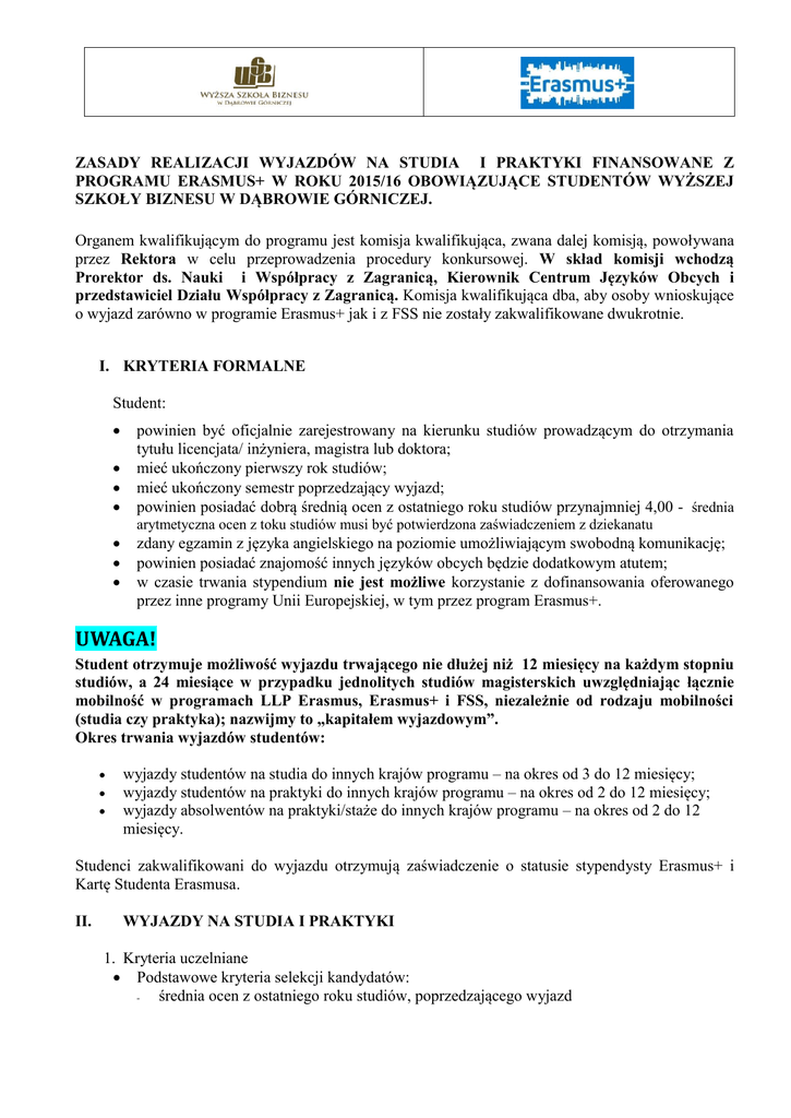 ZASADY REALIZACJI WYJAZDÓW NA STUDIA I PRAKTYKI FINANSOWANE Z PROGRAMU ERASMUS+ W ROKU 2015/16 OBOWIĄZUJĄCE STUDENTÓW WYŻSZEJ SZKOŁY BIZNESU W DĄBROWIE GÓRNICZEJ. Organem kwalifikującym do programu jest komisja kwalifikująca, zwana dalej komisją, powoływana przez Rektora w celu przeprowadzenia procedury konkursowej. W skład komisji wchodzą Prorektor ds. Nauki i Współpracy z Zagranicą, Kierownik Centrum Języków Obcych i przedstawiciel Działu Współpracy z Zagranicą. Komisja kwalifikująca dba, aby osoby wnioskujące o wyjazd zarówno w programie Erasmus+ jak i z FSS nie zostały zakwalifikowane dwukrotnie. I. KRYTERIA FORMALNE Student: powinien być oficjalnie zarejestrowany na kierunku studiów prowadzącym do otrzymania tytułu licencjata/ inżyniera, magistra lub doktora; mieć ukończony pierwszy rok studiów; mieć ukończony semestr poprzedzający wyjazd; powinien posiadać dobrą średnią ocen z ostatniego roku studiów przynajmniej 4,00 - średnia arytmetyczna ocen z toku studiów musi być potwierdzona zaświadczeniem z dziekanatu zdany egzamin z języka angielskiego na poziomie umożliwiającym swobodną komunikację; powinien posiadać znajomość innych języków obcych będzie dodatkowym atutem; w czasie trwania stypendium nie jest możliwe korzystanie z dofinansowania oferowanego przez inne programy Unii Europejskiej, w tym przez program Erasmus+. UWAGA! Student otrzymuje możliwość wyjazdu trwającego nie dłużej niż 12 miesięcy na każdym stopniu studiów, a 24 miesiące w przypadku jednolitych studiów magisterskich uwzględniając łącznie mobilność w programach LLP Erasmus, Erasmus+ i FSS, niezależnie od rodzaju mobilności (studia czy praktyka); nazwijmy to „kapitałem wyjazdowym”. Okres trwania wyjazdów studentów: wyjazdy studentów na studia do innych krajów programu – na okres od 3 do 12 miesięcy; wyjazdy studentów na praktyki do innych krajów programu – na okres od 2 do 12 miesięcy; wyjazdy absolwentów na praktyki/staże do innych krajów programu – na okres od 2 do 12 miesięcy. Studenci zakwalifikowani do wyjazdu otrzymują zaświadczenie o statusie stypendysty Erasmus+ i Kartę Studenta Erasmusa. II. WYJAZDY NA STUDIA I PRAKTYKI 1. Kryteria uczelniane Podstawowe kryteria selekcji kandydatów: - średnia ocen z ostatniego roku studiów, poprzedzającego wyjazd - znajomość angielskiego/wykładowego języka obcego. Kryteria pomocnicze przy ocenie studenta: - udział w projektach międzynarodowych, w tym pomoc przy organizacji pobytu zagranicznych studentów programu Erasmus+, - osiągnięcia naukowe i działalność na rzecz uczelni, Kryteria pomocnicze - priorytety: - - w przypadku, gdy dwoje lub więcej studentów uzyskało tę samą liczbę punktów w rekrutacji, pierwszeństwo wyjazdu z programu Erasmus+ przysługuje studentowi wyjeżdżającemu po raz pierwszy w jakimkolwiek programie, w przypadku, gdy dwoje lub więcej studentów uzyskało tę samą liczbę punktów w rekrutacji, pierwszeństwo wyjazdu z programu Erasmus+ przysługuje studentowi wyjeżdżającemu ze stypendium programu Erasmus+ po raz pierwszy, w przypadku, gdy dwoje lub więcej studentów uzyskało tę samą liczbę punktów w rekrutacji i wszyscy wyjeżdżają po raz pierwszy ze stypendium programu Erasmus+ lub wszyscy korzystali z tego stypendium tę samą liczbę razy, udział w funduszu rozpatrywany będzie indywidualnie w porozumieniu ze studentami, których ono dotyczy, jeżeli student składał wniosek o wyjazd zarówno w programie Erasmus+ i FSS, w pierwszej kolejności przyznane mu zostanie stypendium FSS, jednocześnie zwolnione zostanie jego miejsce na liście rankingowej w programie Erasmus+ . Formularz oceny Średnia ocen Punktacja 2 3 4 od 4.0 do 4.3 od 4.4 do 4.6 od 4.7 do 5.0 Znajomość wykładowego języka obcego (o kwalifikacji do danego poziomu skali decyduje liczba punktów z testu językowego) 50-75 pkt 2 76-86 pkt 3 87-100 pkt 4 Udział w programach/projektach międzynarodowych 0 1 Brak uczestnictwa Uczestnictwo Osiągnięcia naukowe/działalność na rzecz uczelni 0 1 Brak osiągnięć/ brak działalności Osiągnięcia/działalność Parametr Opis Średnia ocen średnia arytmetyczna ocen z toku studiów potwierdzona zaświadczeniem z dziekanatu Wartości przyjmowane przez parametr 2-4 Znajomość wykładowego języka obcego znajomość języka, w którym prowadzona jest większość zajęć w uczelni przyjmującej (w przypadku równej liczby zajęć w danych językach, decyduje znajomość języka wykładowego będącego jednocześnie językiem urzędowym danego kraju), potwierdzona poprzez stosowne certyfikaty lub test językowy 2-4 uczestnictwo w przedsięwzięciach o charakterze naukowym, Udział w edukacyjnym lub artystycznym w środowisku programach/ międzynarodowym (w tym pomoc przy organizacji pobytu projektach zagranicznych studentów programu Erasmus+), potwierdzone międzynarodowych zaświadczeniami lub opinią opiekuna naukowego 0-1 inicjowanie lub uczestnictwo w działaniach prowadzących do rozwoju lub promocji WSB (w tym pomoc przy organizacji Osiągnięcia pobytu zagranicznych studentów programu Erasmus+), naukowe/Działalnoś potwierdzone zaświadczeniami lub opinią organizatora; ć na rzecz uczelni osiągnięcia w dziedzinie nauki, kultury, sportu lub działalności społecznej, potwierdzone zaświadczeniami lub opinią opiekuna organizatora 0-1 MAKSYMALNA ŁĄCZNA PUNKTACJA 10 pkt 1. Wymagane dokumenty Student zainteresowany otrzymaniem stypendium składa do Działu Współpracy z Zagranicą następujące dokumenty: formularz zgłoszeniowy dostępny na stronie www.wsb.edu.pl/Erasmus+>Wyjazdy na studia/Wyjazdu na praktykę>FORMULARZ ZGŁOSZENIOWY zaświadczenie z dziekanatu o średniej ocen z całego roku studiów, wynik z testu z jęz.angielskiego, potwierdzający znajomość języka obcego, opcjonalnie - informacje dodatkowe (np.: opinia opiekuna roku, zaświadczenia z odbytych praktyk zawodowy