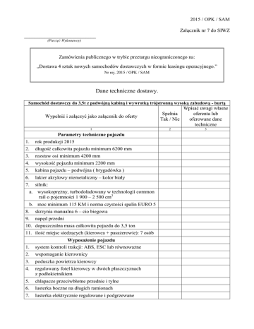2015 / OPK / SAM Załącznik nr 7 do SIWZ ____________________________ (Pieczęć Wykonawcy) Zamówienia publicznego w trybie przetargu nieograniczonego na: „Dostawa 4 sztuk nowych samochodów dostawczych w formie leasingu operacyjnego.” Nr rej. 2015 / OPK / SAM Dane techniczne dostawy. Samochód dostawczy do 3,5t z podwójną kabiną i wywrotką trójstronną wysoką zabudową - burtą Wypełnić i załączyć jako załącznik do oferty Spełnia Tak / Nie Wpisać uwagi własne oferenta lub oferowane dane techniczne 1 2 3 Parametry techniczne pojazdu 1. rok produkcji 2015 2. długość całkowita pojazdu minimum 6200 mm 3. rozstaw osi minimum 4200 mm 4. wysokość pojazdu minimum 2200 mm 5. kabina pojazdu – podwójna ( brygadówka ) 6. lakier akrylowy niemetaliczny – kolor biały 7. silnik: a. wysokoprężny, turbodoładowany w technologii common rail o pojemności 1 900 – 2 500 cm3 b. moc minimum 115 KM i norma czystości spalin EURO 5 8. skrzynia manualna 6 – cio biegowa 9. napęd przedni 10. dopuszczalna masa całkowita pojazdu do 3,5 ton 11. ilość miejsc siedzących (kierowca + pasażerowie): 7 osób Wyposażenie pojazdu 1. system kontroli trakcji: ABS, ESC lub równoważne 2. wspomaganie kierownicy 3. poduszka powietrza kierowcy 4. regulowany fotel kierowcy w dwóch płaszczyznach z podłokietnikiem 5. chlapacze przeciwbłotne przednie i tylne 6. lusterka boczne na długich ramionach 7. lusterka elektrycznie regulowane i podgrzewane 2015 / OPK / SAM 8. reflektory przednie o podwójnej optyce 9. boczne kierunkowskazy w lusterkach zewnętrznych 10. dwa światłą cofania 11. kołpaki kół 12. centralny zamek drzwi zdalnie sterowany falami radiowymi z funkcją blokady w czasie jazdy 13. koło zapasowe umieszczone pod podwoziem 14. system blokady zapłonu z kodem w kluczyku 15. zagłówki z przodu i tyłu pełne regulowane na wysokość 16. pasy przednie bezpieczeństwa 3-punktowe z ogranicznikiem napięcia 17. pasy tylne co najmniej 2-punktowe kanapy w II rzędzie 18. kolumna kierownicy składana w razie wypadku 19. stopień wejściowy w kabinie pokryty antypoślizgową matą 20. gumowe dywaniki podłogowe 21. komputer pokładowy, komunikaty wyświetlane w języku polskim 22. sygnał dźwiękowy pozostawionych włączonych świateł 23. kolumna kierownicy regulowana co najmniej na wysokość 24. szyby przednie sterowane elektrycznie 25. osłona przeciwsłoneczna dla kierowcy i pasażera 26. wykładzina kauczukowa w kabinie w miejscach przednich i tylnych 27. podsufitka w kabinie z lampką sufitową 28. ogrzewanie i wentylacja, nawiewy boczne i przednie regulowane, dmuchawa co najmniej 4-biegowa, funkcja obiegu zamkniętego, nadmuch na przednią szybę i boczne, klimatyzacja 29. zamykany schowek w części deski rozdzielczej, schowek w drzwiach kierowcy i pasażera, pólka w kabinie kierowcy, wysuwany uchwyt na dokumenty 30. fotel kierowcy z regulacją lędźwiową 31. kanapa dwumiejscowa dla pasażera z przodu ze schowkiem w siedzisku 32. tylna ławka 4-miejscowa, schowek pod ławką 33. zestaw audio: radio z funkcją cd i mp3 z bluetooth oraz nagłośnienie przestrzeni 34. logo zamawiającego z lewej oraz prawej strony pojazdu – do uzgodnienia wizualizacja reklamy wym. 1500/1000mm 35. gaśnica, trójkąt, apteczka, podnośnik, pełnowymiarowe koło zapasowe 2 2015 / OPK / SAM 36. popielniczka z zapalniczką na konsoli centralnej oraz uchwyt na telefon komórkowy z gniazdem 12V Warunki gwarancji 1. minimum 2 lata gwarancji na podzespoły mechaniczne bez limitu kilometrów 2. minimum 3 lata gwarancji na powłokę lakieru 3. minimum 12 lat gwarancji na brak korozji perforacyjnej od wewnątrz i na zewnątrz Wymagania dotyczące serwisu Dostępność serwisu – autoryzowana stacja serwisowa znajdująca się na terenie województwa łódzkiego, godziny otwarcia: od poniedziałku do piątku co najmniej w godzinach 8.00 – 16.00, w soboty co najmniej w godzinach 8.00-14.00. Rozpoczęcie naprawy nastąpi w terminie 24 godzin od momentu zgłoszenia Inne parametry lub wyposażenie (dodatkowe) Pojazd ma być wyposażony w dwa komplety opon (letnie i zimowe) wraz z felgami Parametry techniczne zabudowy 1. wymiary wywrotu o długości minimalnej 3100 mm 2. wymiary wywrotu o szerokości minimalnej 2100 mm 3. wymiary wywrotu o wysokości minimalnej 600 mm 4. osłona kabiny ze wzmocnionymi otworami do mocowania ładunku oraz z górną nakładką przeciwpoślizgową do przewozu długich ładunków 5. rama pośrednie wykonana z profili aluminiowych, skręcanych, profil obwodowy wykonany z anodowanego aluminium 6. burty wykonane z profili aluminiowych, składanych na wysokość 600mm, burty boczne w całości 7. zasilanie wywrotu pompa hydrauliczna napędzana silnikiem elektrycznym, sterowanie za pomocą pilota 8. ogranicznik kąta wywrotu 9. system zabezpieczeń przechyłu 10. zawiasy dolne burt bocznych + zawiasy górne i dolne burty tylnej 11. podłoga aluminiowa 12. dodatkowe mocowanie ładunku - minimum 6szt. 13. dodatkowa osłona lamp tylnich pojazdu 14. Zabezpieczenie powierzchni ładunkowej przez zwijaną plandekę umocowaną do stelażu przy kabinie, mocowanie przy rozłożeniu do burt 3 2015 / OPK / SAM Samochód dostawczy do 3,5t z podwójną kabiną i wywrotką trójstronną z niską zabudową + stelaż ażurowy Wpisać uwagi własne Spełnia oferenta lub Wypełnić i załączyć jako załącznik do oferty Tak / Nie oferowane dane techniczne 1 1. Parametry techniczne pojazdu rok produkcji 2015 2. długość całkowita pojazdu minimum 6200 mm 3. rozstaw osi minimum 4200 mm 4. wysokość pojazdu minimum 2200 mm 5. kabina pojazdu – podwójna ( brygadówka ) 6. lakier akrylowy niemetaliczny – kolor biały 7. silnik: 2 3 c. wysokoprężny, turbodoładowany w technologii common rail o pojemności 1 900 – 2 500 cm3 d. moc minimum 115 KM i norma czystości spalin EURO 5 8. skrzynia manualna 6 – cio biegowa 9. napęd przedni 10. dopuszczalna masa całkowita pojazdu do 3,5 to