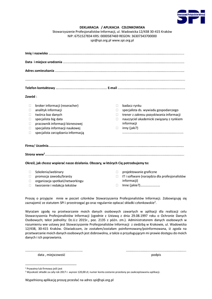 DEKLARACJA / APLIKACJA CZŁONKOWSKA Stowarzyszenie Profesjonalistów Informacji, ul. Wadowicka 12/438 30-415 Kraków NIP: 6751527834 KRS: 0000587469 REGON: 36307343700000 [email protected] www.spi.org.pl Imię i nazwisko ....................................................................................................................................................... Data i miejsce urodzenia ....................................................................................................................................... Adres zamieszkania ................................................................................................................................................ .................................................................................................................................................................................. Telefon kontaktowy ......................................................... E-mail ........................................................................... Zawód : broker informacji (reseracher) analityk informacji twórca baz danych specjalista big data pracownik informacji biznesowej specjalista informacji naukowej specjalista zarządzania informacją badacz rynku specjalista ds. wywiadu gospodarczego trener z zakresu pozyskiwania informacji nauczyciel akademicki związany z rynkiem informacji inny (jaki?) .................................................................... Firma/ Uczelnia....................................................................................................................................................... Strona www1........................................................................................................................................................... Określ, jak chcesz wspierać nasze działania. Obszary, w których Cię potrzebujemy to: Szkolenia/webinary promocja zawodu/branży organizacja spotkań/networkingu tworzenie i redakcja tekstów projektowanie graficzne IT i software (narzędzia dla profesjonalistów informacji) Inne (jakie?)…………………… Proszę o przyjęcie mnie w poczet członków Stowarzyszenia Profesjonalistów Informacji. Zobowiązuję się zaznajomić ze statutem SPI i przestrzegać go oraz regularnie opłacać składki członkowskie2. Wyrażam zgodę na przetwarzanie moich danych osobowych zawartych w aplikacji dla realizacji celu Stowarzyszenia Profesjonalistów Informacji (zgodnie z Ustawą z dnia 29.08.1997 roku o Ochronie Danych Osobowych; tekst jednolity: Dz.U.z 2015r., poz. 2135 z późn. zm.). Administratorem danych osobowych w rozumieniu ww ustawy jest Stowarzyszenie Profesjonalistów Informacji z siedzibą w Krakowie, ul. Wadowicka 12/438, 30-415 Kraków. Oświadczam, że zostałem/zostałam poinformowany/poinformowana, iż zgoda na przetwarzanie moich danych osobowych jest dobrowolna, a także o przysługującym mi prawie dostępu do moich danych i ich poprawiania. ................................................................ data , miejscowość 1 2 ................................................................... podpis Prywatna lub firmowa jeśli jest Wysokość składki za cały rok 2017 r. wynosi 120,00 zł; numer konta zostanie przesłany po zaakceptowaniu aplikacji. Wypełnioną aplikację proszę przesłać na adres [email protected]