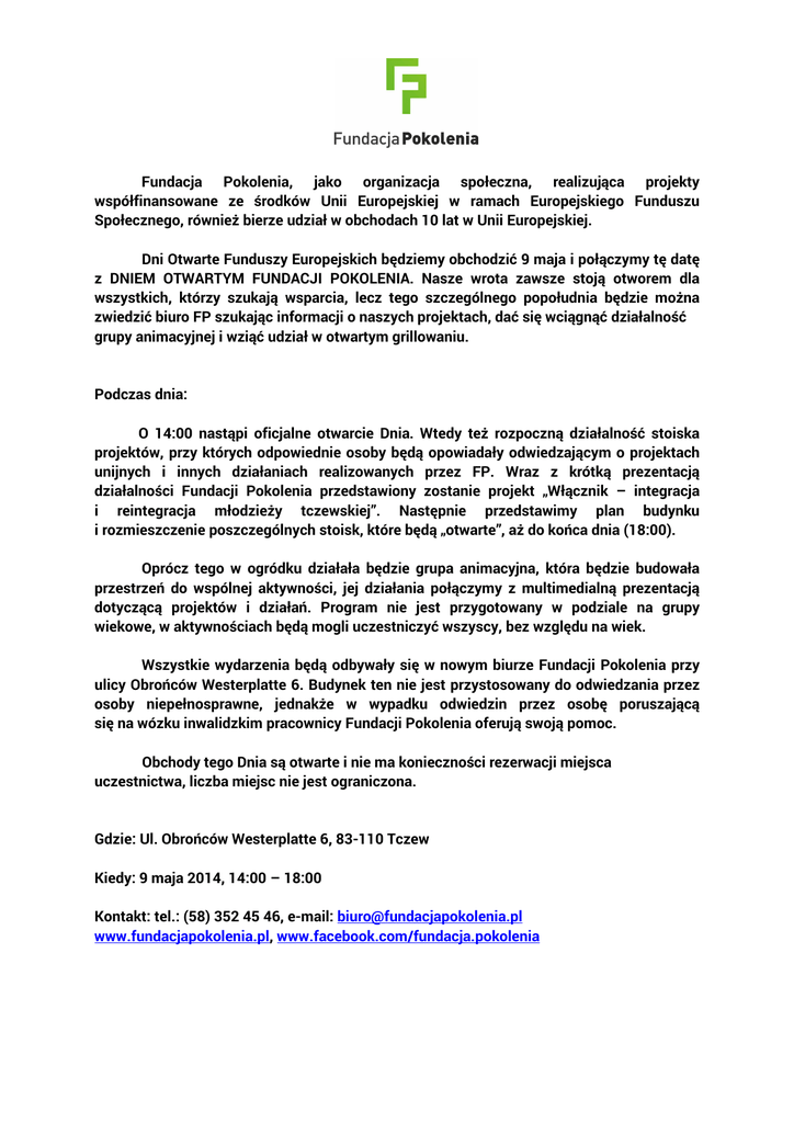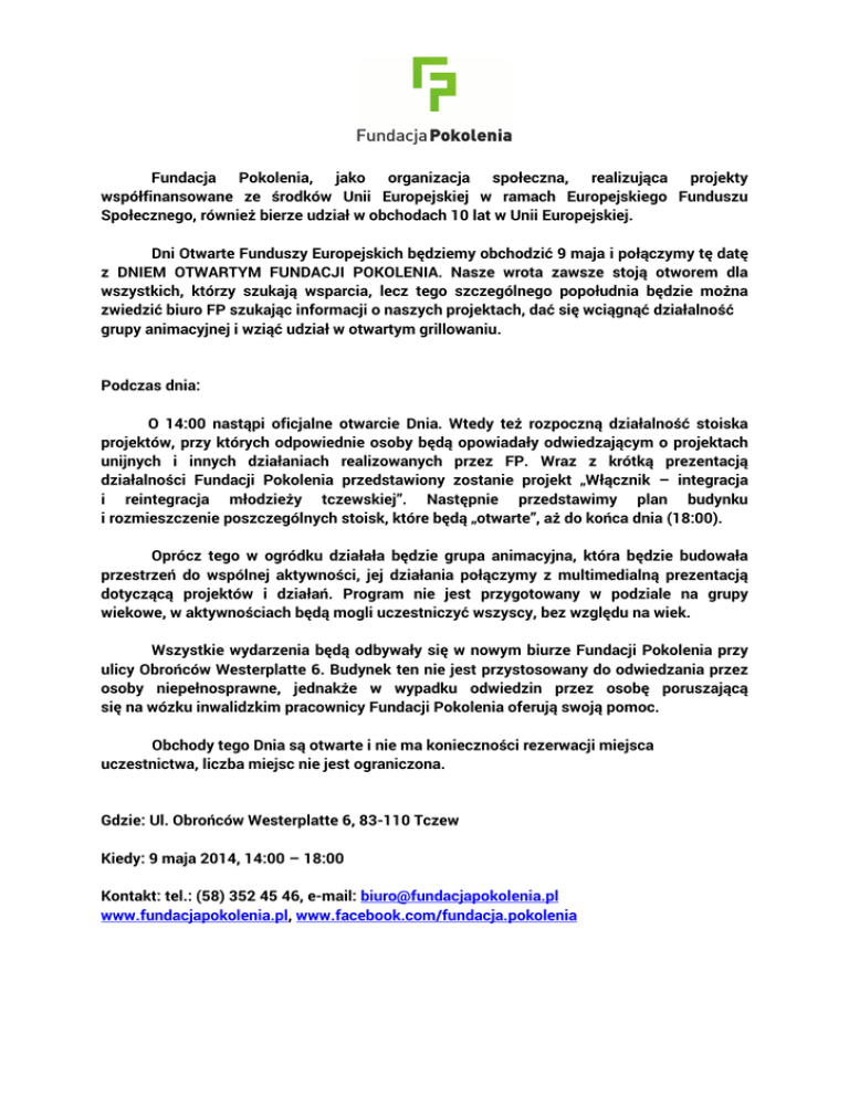 Fundacja Pokolenia, jako organizacja społeczna, realizująca projekty współfinansowane ze środków Unii Europejskiej w ramach Europejskiego Funduszu Społecznego, również bierze udział w obchodach 10 lat w Unii Europejskiej. Dni Otwarte Funduszy Europejskich będziemy obchodzić 9 maja i połączymy tę datę z DNIEM OTWARTYM FUNDACJI POKOLENIA. Nasze wrota zawsze stoją otworem dla wszystkich, którzy szukają wsparcia, lecz tego szczególnego popołudnia będzie można zwiedzić biuro FP szukając informacji o naszych projektach, dać się wciągnąć działalność grupy animacyjnej i wziąć udział w otwartym grillowaniu. Podczas dnia: O 14:00 nastąpi oficjalne otwarcie Dnia. Wtedy też rozpoczną działalność stoiska projektów, przy których odpowiednie osoby będą opowiadały odwiedzającym o projektach unijnych i innych działaniach realizowanych przez FP. Wraz z krótką prezentacją działalności Fundacji Pokolenia przedstawiony zostanie projekt „Włącznik – integracja i reintegracja młodzieży tczewskiej”. Następnie przedstawimy plan budynku i rozmieszczenie poszczególnych stoisk, które będą „otwarte”, aż do końca dnia (18:00). Oprócz tego w ogródku działała będzie grupa animacyjna, która będzie budowała przestrzeń do wspólnej aktywności, jej działania połączymy z multimedialną prezentacją dotyczącą projektów i działań. Program nie jest przygotowany w podziale na grupy wiekowe, w aktywnościach będą mogli uczestniczyć wszyscy, bez względu na wiek. Wszystkie wydarzenia będą odbywały się w nowym biurze Fundacji Pokolenia przy ulicy Obrońców Westerplatte 6. Budynek ten nie jest przystosowany do odwiedzania przez osoby niepełnosprawne, jednakże w wypadku odwiedzin przez osobę poruszającą się na wózku inwalidzkim pracownicy Fundacji Pokolenia oferują swoją pomoc. Obchody tego Dnia są otwarte i nie ma konieczności rezerwacji miejsca uczestnictwa, liczba miejsc nie jest ograniczona. Gdzie: Ul. Obrońców Westerplatte 6, 83-110 Tczew Kiedy: 9 maja 2014, 14:00 – 18:00 Kontakt: tel.: (58) 352 45 46, e-mail: [email protected] www.fundacjapokolenia.pl, www.facebook.com/fundacja.pokolenia