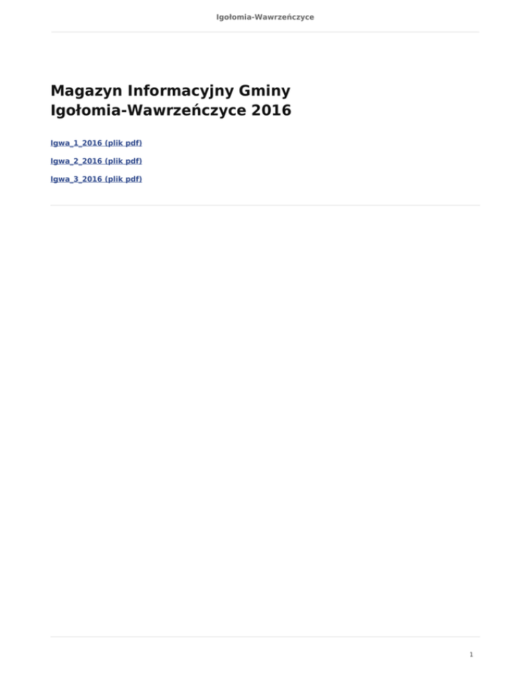 Igołomia-Wawrzeńczyce Magazyn Informacyjny Gminy Igołomia-Wawrzeńczyce 2016 Igwa_1_2016 (plik pdf) Igwa_2_2016 (plik pdf) Igwa_3_2016 (plik pdf) 1