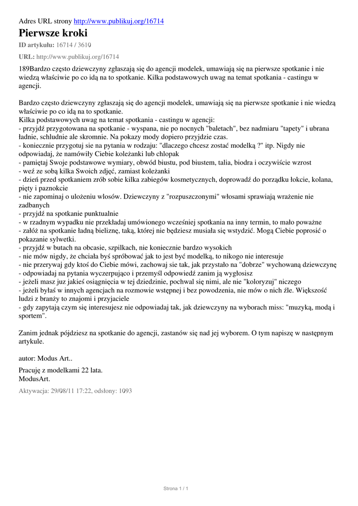 Adres URL strony http://www.publikuj.org/16714 Pierwsze kroki ID artykułu: 16714 / 3610 URL: http://www.publikuj.org/16714 189Bardzo często dziewczyny zgłaszają się do agencji modelek, umawiają się na pierwsze spotkanie i nie wiedzą właściwie po co idą na to spotkanie. Kilka podstawowych uwag na temat spotkania - castingu w agencji. Bardzo często dziewczyny zgłaszają się do agencji modelek, umawiają się na pierwsze spotkanie i nie wiedzą właściwie po co idą na to spotkanie. Kilka podstawowych uwag na temat spotkania - castingu w agencji: - przyjdź przygotowana na spotkanie - wyspana, nie po nocnych "baletach", bez nadmiaru "tapety" i ubrana ładnie, schludnie ale skromnie. Na pokazy mody dopiero przyjdzie czas. - koniecznie przygotuj sie na pytania w rodzaju: "dlaczego chcesz zostać modelką ?" itp. Nigdy nie odpowiadaj, że namówiły Ciebie koleżanki lub chlopak - pamiętaj Swoje podstawowe wymiary, obwód biustu, pod biustem, talia, biodra i oczywiście wzrost - weź ze sobą kilka Swoich zdjęć, zamiast koleżanki - dzień przed spotkaniem zrób sobie kilka zabiegów kosmetycznych, doprowadź do porządku łokcie, kolana, pięty i paznokcie - nie zapominaj o ulożeniu wlosów. Dziewczyny z "rozpuszczonymi" włosami sprawiają wrażenie nie zadbanych - przyjdź na spotkanie punktualnie - w rzadnym wypadku nie przekładaj umówionego wcześniej spotkania na inny termin, to mało poważne - załóż na spotkanie ładną bieliznę, taką, której nie będziesz musiała się wstydzić. Mogą Ciebie poprosić o pokazanie sylwetki. - przyjdź w butach na obcasie, szpilkach, nie koniecznie bardzo wysokich - nie mów nigdy, że chciała byś spróbować jak to jest być modelką, to nikogo nie interesuje - nie przerywaj gdy ktoś do Ciebie mówi, zachowaj sie tak, jak przystało na "dobrze" wychowaną dziewczynę - odpowiadaj na pytania wyczerpująco i przemyśl odpowiedź zanim ją wygłosisz - jeżeli masz juz jakieś osiągnięcia w tej dziedzinie, pochwal się nimi, ale nie "koloryzuj" niczego - jeżeli byłaś w innych agencjach na rozmowie wstępnej i bez powodzenia, nie mów o nich źle. Większość ludzi z branży to znajomi i przyjaciele - gdy zapytają czym się interesujesz nie odpowiadaj tak, jak dziewczyny na wyborach miss: "muzyką, modą i sportem". Zanim jednak pójdziesz na spotkanie do agencji, zastanów się nad jej wyborem. O tym napiszę w następnym artykule. autor: Modus Art.. Pracuję z modelkami 22 lata. ModusArt. Aktywacja: 29/08/11 17:22, odsłony: 1093 Strona 1 / 1