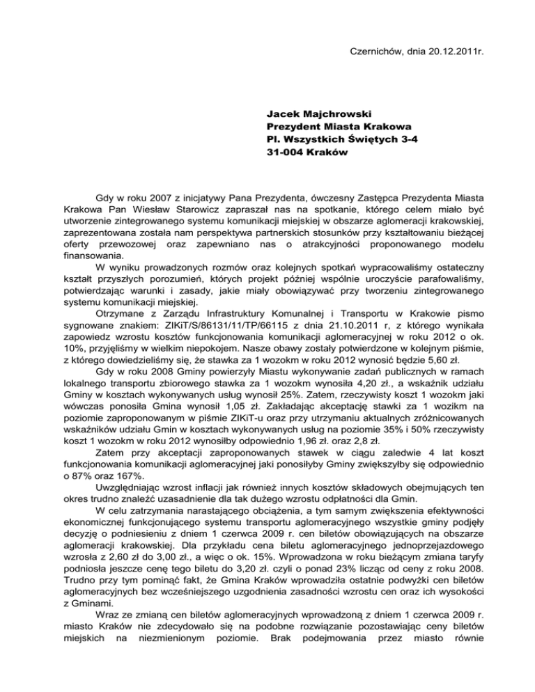 Czernichów, dnia 20.12.2011r. Jacek Majchrowski Prezydent Miasta Krakowa Pl. Wszystkich Świętych 3-4 31-004 Kraków Gdy w roku 2007 z inicjatywy Pana Prezydenta, ówczesny Zastępca Prezydenta Miasta Krakowa Pan Wiesław Starowicz zapraszał nas na spotkanie, którego celem miało być utworzenie zintegrowanego systemu komunikacji miejskiej w obszarze aglomeracji krakowskiej, zaprezentowana została nam perspektywa partnerskich stosunków przy kształtowaniu bieżącej oferty przewozowej oraz zapewniano nas o atrakcyjności proponowanego modelu finansowania. W wyniku prowadzonych rozmów oraz kolejnych spotkań wypracowaliśmy ostateczny kształt przyszłych porozumień, których projekt później wspólnie uroczyście parafowaliśmy, potwierdzając warunki i zasady, jakie miały obowiązywać przy tworzeniu zintegrowanego systemu komunikacji miejskiej. Otrzymane z Zarządu Infrastruktury Komunalnej i Transportu w Krakowie pismo sygnowane znakiem: ZIKiT/S/86131/11/TP/66115 z dnia 21.10.2011 r, z którego wynikała zapowiedz wzrostu kosztów funkcjonowania komunikacji aglomeracyjnej w roku 2012 o ok. 10%, przyjęliśmy w wielkim niepokojem. Nasze obawy zostały potwierdzone w kolejnym piśmie, z którego dowiedzieliśmy się, że stawka za 1 wozokm w roku 2012 wynosić będzie 5,60 zł. Gdy w roku 2008 Gminy powierzyły Miastu wykonywanie zadań publicznych w ramach lokalnego transportu zbiorowego stawka za 1 wozokm wynosiła 4,20 zł., a wskaźnik udziału Gminy w kosztach wykonywanych usług wynosił 25%. Zatem, rzeczywisty koszt 1 wozokm jaki wówczas ponosiła Gmina wynosił 1,05 zł. Zakładając akceptację stawki za 1 wozikm na poziomie zaproponowanym w piśmie ZIKiT-u oraz przy utrzymaniu aktualnych zróżnicowanych wskaźników udziału Gmin w kosztach wykonywanych usług na poziomie 35% i 50% rzeczywisty koszt 1 wozokm w roku 2012 wynosiłby odpowiednio 1,96 zł. oraz 2,8 zł. Zatem przy akceptacji zaproponowanych stawek w ciągu zaledwie 4 lat koszt funkcjonowania komunikacji aglomeracyjnej jaki ponosiłyby Gminy zwiększyłby się odpowiednio o 87% oraz 167%. Uwzględniając wzrost inflacji jak również innych kosztów składowych obejmujących ten okres trudno znaleźć uzasadnienie dla tak dużego wzrostu odpłatności dla Gmin. W celu zatrzymania narastającego obciążenia, a tym samym zwiększenia efektywności ekonomicznej funkcjonującego systemu transportu aglomeracyjnego wszystkie gminy podjęły decyzję o podniesieniu z dniem 1 czerwca 2009 r. cen biletów obowiązujących na obszarze aglomeracji krakowskiej. Dla przykładu cena biletu aglomeracyjnego jednoprzejazdowego wzrosła z 2,60 zł do 3,00 zł., a więc o ok. 15%. Wprowadzona w roku bieżącym zmiana taryfy podniosła jeszcze cenę tego biletu do 3,20 zł. czyli o ponad 23% licząc od ceny z roku 2008. Trudno przy tym pominąć fakt, że Gmina Kraków wprowadziła ostatnie podwyżki cen biletów aglomeracyjnych bez wcześniejszego uzgodnienia zasadności wzrostu cen oraz ich wysokości z Gminami. Wraz ze zmianą cen biletów aglomeracyjnych wprowadzoną z dniem 1 czerwca 2009 r. miasto Kraków nie zdecydowało się na podobne rozwiązanie pozostawiając ceny biletów miejskich na niezmienionym poziomie. Brak podejmowania przez miasto równie zdecydowanych działań sprawiło, że współczynnik rentowności komunikacji miejskiej a co za tym idzie również aglomeracyjnej systematycznie się pogarszał. Gminy dążąc nieustannie do zmniejszenia kosztów funkcjonowania sytemu oraz zwiększenia jego efektywności podjęły w mijającym roku dodatkowo działania w celu optymalizacji marszrut poszczególnych linii w tym likwidacji niektórych. Trudno szukać podobnych działań po stronie miasta. Mając powyższe na uwadze brak jest naszej akceptacji dla dalszego wzrostu kosztów ponoszonych przez Gminy i jej mieszkańców. Oczekujemy podjęcia przez Pana Prezydenta zdecydowanych działań, które doprowadzą do ustalenia kosztów wykonywanych usług na akceptowalnym i racjonalnym poziomie tzn. nie większym niż w roku 2011. W przeciwnym wypadku oczekujemy, aby w trybie postępowania o udzielenie zamówienia publicznego, a więc trybie konkurencyjnym zweryfikować koszty funkcjonowania transportu aglomeracyjnego na terenie Miast i Gmin, które przystąpiły do porozumień. W przypadku prowadzenia procedur przetargowych dotyczących realizacji Porozumienia oczekujemy, że Miasto zapewni udział przedstawicieli Gmin w komisjach przetargowych co gwarantuje § 1 ust. 8 podpisanych Porozumień Międzygminnych. Uwzględniając użyte w naszym piśmie argumenty oraz biorąc pod uwagę trwające aktualnie prace nad budżetami naszych Gmin na rok przyszły z czym wiąże się konieczność zarezerwowania środków na pokrycie kosztów funkcjonowania komunikacji aglomeracyjnej, prosimy o pilne podjęcie działań w celu zweryfikowania i urealnienia kosztów przekazanych nam przez ZIKiT. Do tego czasu odmawiamy podpisania otrzymanych aneksów do porozumień zawierających nie akceptowaną przez nas wysokość stawki za 1 wozokm. oraz utrzymujących zróżnicowane wskaźniki udziału Gmin w kosztach wykonywanych usług na poziomie 35% oraz pozbawionym uzasadnienia poziomie 50%. W tym miejscu pragniemy poruszyć jeszcze jedną kwestię sygnalizowaną wcześniej. W ostatnim czasie wielokrotnie dochodziły do nas informacje o kolejnych planowanych zmianach cen i opłat za usługi przewozowe, uprawnień do przejazdów ulgowych oraz przepisów taryfowych w komunikacji miejskiej w Krakowie realizowanej na obszarze Gminy Miejskiej Kraków oraz Miast i Gmin, które przystąpiły do porozumień międzygminnych w zakresie lokalnego transportu zbiorowego. W śród nich słusznie odrzucony przez Radę Miasta Krakowa w pierwszym czytaniu Projekt Prezydenta Miasta Krakowa wyrażony na druku nr 476 czy aktualnie procedowany druk nr 504. Trudno pominąć też powszechnie komentowane zapowiedzi kolejnych podwyżek w roku przyszłym. Ma