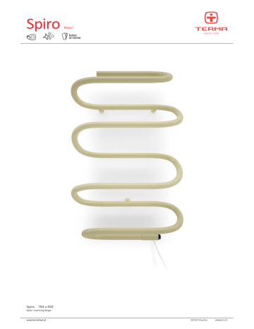 Spiro Cr klasa I kolor w cenie Spiro 794 x 450 kolor: morning beige www.termaheat.pl 20150715wolka strona 1 z 5 Spiro Cr klasa I kolor w cenie projekt: Darek Berus Podłączenia: U) Dostępne rozmiary: 566 x 450 ↕ 794 x 450 ↔ 1062 x 450 Dane techniczne: Wersja elektryczna z przewodem grzejnym. g v Kod Kod A B D E F ↕ ↔ [W] [mm] [mm] [mm] [kg] 566 450 110 240 227 170 4,30 WSSPI056045 794 450 165 240 455 170 5,50 WSSPI079045 1062 450 205 240 723 170 6,80 WSSPI106045 produktu konfiguracji s. 4 farba proszkowa powłoka galwaniczna 566 450 80 240 227 170 4,30 WSSPI056045 794 450 110 240 455 170 5,50 WSSPI079045 1062 450 130 240 723 170 6,80 WSSPI106045 www.termaheat.pl 20150715wolka strona 2 z 5 Spiro Cr klasa I kolor w cenie E7 142,5 B D 216 ÷ 224 D/2 E7 A E 142,5 B D 216 ÷ 224 15 F A E 15 F D/2 5 2 A – wysokość B – szerokość C1-C5 – rozstaw podłączeń D – rozstaw konsol w poziomie E – rozstaw konsol w pionie, F – odległość od osi dolnej konsoli do dolnej krawędzi kolektora Profil: 5 2 www.termaheat.pl 20150715wolka strona 3 z 5 Spiro Cr klasa I kolor w cenie W tabelach przy kartach technicznych produktów umieszczone są kody produktów, które dostarczają podstawowych informacji o produktach oraz częściowo wypełniony kod konfiguracji uzupełniający informacje o szczegółową specyfikację produktu. W celu realizacji zamówienia kody produktów należy uzupełnić o pełny kod konfiguracji. Kod konfiguracji należy umieścić po kodzie produktu. Poniżej przedstawiamy strukturę budowy kodu produktu oraz kodu konfiguracji. Budowa kodu konfiguracji grzejnika elektrycznego z przewodem grzewczym. WSPER136050 K916EXW KOD KARTOTEKI (umieszczony w tabeli przy produkcie) KOD KONFIGURACJI (uzupełniany ręcznie) Konfiguracja K 916 E1 W kod opakowania kod koloru kod podłączenia kod typu kabla K - karton Proszkowy podkład cynkowy C – kod proszkowego podkładu cynkowego uzupełniany jest w kodzie nietypowości. WLALE054030 K916SX C www.termaheat.pl kod nietypowości 20150715wolka strona 4 z 5 Spiro Cr klasa I kolor w cenie Legenda Cr Grzejnik dostępny także w wersji chromowanej. Grzejnik dostępny w wersji c.o. Grzejnik przystosowany do pracy jako grzejnik c.o. z podłączoną grzałką elektryczną. Grzejnik dostępny w wersji elektrycznej z przewodem grzejnym lub z czynnikiem grzewczym i grzałką. Produkt fabrycznie przetestowany i gotowy do użytku. Podstawowy wariant podłączenia grzejnika. Ikona wskazuje sposób zasilania oraz powrotu wody w danym podłączeniu oraz umiejscowienie wkładki termostatycznej oraz grzałki, jeśli istnieje możliwość ich zamontowania. Typ podłączenia opcjonalnego dla danego grzejnika. Moc grzejnika elektrycznego lub sugerowana moc grzałki przeznaczonej do grzejnika c.o. Waga. Pojemność. www.termaheat.pl 20150715wolka strona 5 z 5