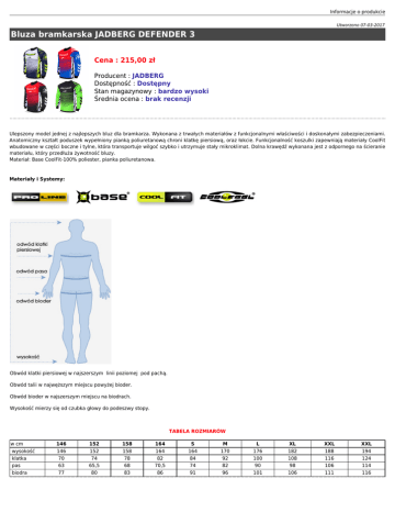 Informacje o produkcie Utworzono 07-03-2017 Bluza bramkarska JADBERG DEFENDER 3 Cena : 215,00 zł Producent : JADBERG Dostępność : Dostępny Stan magazynowy : bardzo wysoki Średnia ocena : brak recenzji Ulepszony model jednej z najlepszych bluz dla bramkarza. Wykonana z trwałych materiałów z funkcjonalnymi właściwości i doskonałymi zabezpieczeniami. Anatomiczny kształt poduszek wypełniony pianką poliuretanową chroni klatkę piersiową, oraz łokcie. Funkcjonalność koszulki zapewniają materiały CoolFit wbudowane w części boczne i tylne, która transportuje wilgoć szybko i utrzymuje stały mikroklimat. Dolna krawędź wykonana jest z odpornego na ścieranie materiału, który przedłuża żywotność bluzy. Materiał: Base CoolFit-100% poliester, pianka poliuretanowa. Materiały i Systemy: Obwód klatki piersiowej w najszerszym linii poziomej pod pachą. Obwód talii w najwęższym miejscu powyżej bioder. Obwód bioder w najszerszym miejscu na biodrach. Wysokość mierzy się od czubka głowy do podeszwy stopy. TABELA ROZMIARÓW w cm wysokość klatka pas biodra 146 146 70 63 77 152 152 74 65,5 80 158 158 78 68 83 164 164 82 70,5 86 S 164 84 74 91 M 170 92 82 96 L 176 100 90 101 XL 182 108 98 106 XXL 188 116 106 111 XXL 194 124 114 116 Dostępne opcje Bluza bramkarska JADBERG DEFENDER 3 Kolor: zielono/czarny, czerwono/czarny, czerwony/niebieski, biało/granatowy. Rozmiar: 120 cm, 130 cm, 140 cm, 150 cm, 160 cm, S (+24,00 zł), M (+24,00 zł), L (+24,00 zł), XL (+24,00 zł), XXL (+24,00 zł).