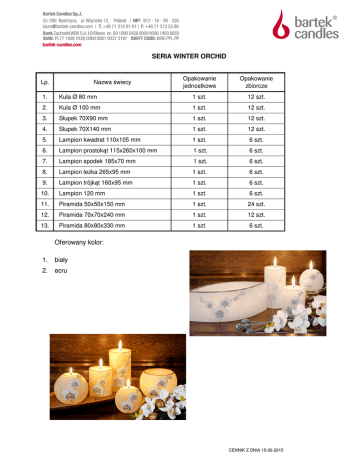 SERIA WINTER ORCHID Lp. Nazwa świecy Opakowanie jednostkowe Opakowanie zbiorcze 1. Kula Ø 80 mm 1 szt. 12 szt. 2. Kula Ø 100 mm 1 szt. 12 szt. 3. Słupek 70X90 mm 1 szt. 12 szt. 4. Słupek 70X140 mm 1 szt. 12 szt. 5. Lampion kwadrat 110x105 mm 1 szt. 6 szt. 6. Lampion prostokąt 115x260x100 mm 1 szt. 6 szt. 7. Lampion spodek 185x70 mm 1 szt. 6 szt. 8. Lampion łezka 265x95 mm 1 szt. 6 szt. 9. Lampion trójkąt 160x95 mm 1 szt. 6 szt. 10. Lampion 120 mm 1 szt. 6 szt. 11. Piramida 50x50x150 mm 1 szt. 24 szt. 12. Piramida 70x70x240 mm 1 szt. 12 szt. 13. Piramida 80x80x330 mm 1 szt. 6 szt. Oferowany kolor: 1. biały 2. ecru CENNIK Z DNIA 15-06-2015