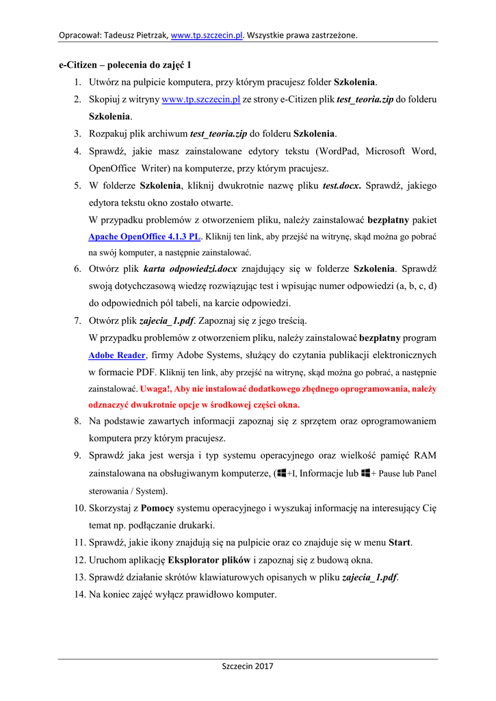Opracował: Tadeusz Pietrzak, www.tp.szczecin.pl. Wszystkie prawa zastrzeżone. e-Citizen – polecenia do zajęć 1 1. Utwórz na pulpicie komputera, przy którym pracujesz folder Szkolenia. 2. Skopiuj z witryny www.tp.szczecin.pl ze strony e-Citizen plik test_teoria.zip do folderu Szkolenia. 3. Rozpakuj plik archiwum test_teoria.zip do folderu Szkolenia. 4. Sprawdź, jakie masz zainstalowane edytory tekstu (WordPad, Microsoft Word, OpenOffice Writer) na komputerze, przy którym pracujesz. 5. W folderze Szkolenia, kliknij dwukrotnie nazwę pliku test.docx. Sprawdź, jakiego edytora tekstu okno zostało otwarte. W przypadku problemów z otworzeniem pliku, należy zainstalować bezpłatny pakiet Apache OpenOffice 4.1.3 PL. Kliknij ten link, aby przejść na witrynę, skąd można go pobrać na swój komputer, a następnie zainstalować. 6. Otwórz plik karta odpowiedzi.docx znajdujący się w folderze Szkolenia. Sprawdź swoją dotychczasową wiedzę rozwiązując test i wpisując numer odpowiedzi (a, b, c, d) do odpowiednich pól tabeli, na karcie odpowiedzi. 7. Otwórz plik zajecia_1.pdf. Zapoznaj się z jego treścią. W przypadku problemów z otworzeniem pliku, należy zainstalować bezpłatny program Adobe Reader, firmy Adobe Systems, służący do czytania publikacji elektronicznych w formacie PDF. Kliknij ten link, aby przejść na witrynę, skąd można go pobrać, a następnie zainstalować. Uwaga!, Aby nie instalować dodatkowego zbędnego oprogramowania, należy odznaczyć dwukrotnie opcje w środkowej części okna. 8. Na podstawie zawartych informacji zapoznaj się z sprzętem oraz oprogramowaniem komputera przy którym pracujesz. 9. Sprawdź jaka jest wersja i typ systemu operacyjnego oraz wielkość pamięć RAM zainstalowana na obsługiwanym komputerze, ( +I, Informacje lub + Pause lub Panel sterowania / System). 10. Skorzystaj z Pomocy systemu operacyjnego i wyszukaj informację na interesujący Cię temat np. podłączanie drukarki. 11. Sprawdź, jakie ikony znajdują się na pulpicie oraz co znajduje się w menu Start. 12. Uruchom aplikację Eksplorator plików i zapoznaj się z budową okna. 13. Sprawdź działanie skrótów klawiaturowych opisanych w pliku zajecia_1.pdf. 14. Na koniec zajęć wyłącz prawidłowo komputer. Szczecin 2017
