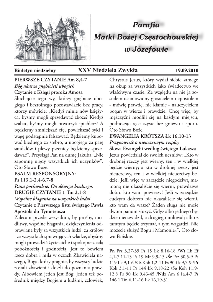 Parafia Matki Bożej Częstochowskiej w Józefowie Biuletyn niedzielny XXV Niedziela Zwykła PIERWSZE CZYTANIE Am 8,4-7 Bóg ukarze gnębicieli ubogich Czytanie z Księgi proroka Amosa Słuchajcie tego wy, którzy gnębicie ubogiego i bezrolnego pozostawiacie bez pracy, którzy mówicie: „Kiedyż minie nów księżyca, byśmy mogli sprzedawać zboże? Kiedyż szabat, byśmy mogli otworzyć spichlerz? A będziemy zmniejszać efę, powiększać syki i wagę podstępnie fałszować. Będziemy kupować biednego za srebro, a ubogiego za parę sandałów i plewy pszenicy będziemy sprzedawać”. Przysiągł Pan na dumę Jakuba: „Nie zapomnę nigdy wszystkich ich uczynków”. Oto Słowo Boże. PSALM RESPONSORYJNY: Ps 113,1-2.4-6.7-8 Pana pochwalcie, On dźwiga biednego. DRUGIE CZYTANIE 1 Tm 2,1-8 Wspólne błagania za wszystkich ludzi Czytanie z Pierwszego listu świętego Pawła Apostoła do Tymoteusza Zalecam przede wszystkim, by prośby, modlitwy, wspólne błagania, dziękczynienia odprawiane były za wszystkich ludzi: za królów i za wszystkich sprawujących władzę, abyśmy mogli prowadzić życie ciche i spokojne z całą pobożnością i godnością. Jest to bowiem rzecz dobra i miła w oczach Zbawiciela naszego, Boga, który pragnie, by wszyscy ludzie zostali zbawieni i doszli do poznania prawdy. Albowiem jeden jest Bóg, jeden też pośrednik między Bogiem a ludźmi, człowiek, 19.09.2010 Chrystus Jezus, który wydał siebie samego na okup za wszystkich jako świadectwo we właściwym czasie. Ze względu na nie ja zostałem ustanowiony głosicielem i apostołem - mówię prawdę, nie kłamię - nauczycielem pogan w wierze i prawdzie. Chcę więc, by mężczyźni modlili się na każdym miejscu, podnosząc ręce czyste bez gniewu i sporu. Oto Słowo Boże. EWANGELIA KRÓTSZA Łk 16,10-13 Przypowieść o nieuczciwym rządcy Słowa Ewangelii według świętego Łukasza Jezus powiedział do swoich uczniów: „Kto w drobnej rzeczy jest wierny, ten i w wielkiej będzie wierny; a kto w drobnej rzeczy jest nieuczciwy, ten i w wielkiej nieuczciwy będzie. Jeśli więc w zarządzie niegodziwą mamoną nie okazaliście się wierni, prawdziwe dobro kto wam powierzy? Jeśli w zarządzie cudzym dobrem nie okazaliście się wierni, kto wam da wasze? Żaden sługa nie może dwom panom służyć. Gdyż albo jednego będzie nienawidził, a drugiego miłował; albo z tamtym będzie trzymał, a tym wzgardzi. Nie możecie służyć Bogu i Mamonie«”. Oto słowo Pańskie. Pn Prz 3,27-35 Ps 15 Łk 8,16-18 /Wt Lb Ef 4,1-7.11-13 Ps 19 Mt 9,9-13 /Śr Prz 30,5-9 Ps 119 Łk 9,1-6 /Cz Koh 1,2-11 Ps 90 Łk 9,7-9 /Pt Koh 3,1-11 Ps 144 Łk 9,18-22 /So Koh 11,912,8 Ps 90 Łk 9,43-45 /Ndz Am 6,1a.4-7 Ps 146 1 Tm 6,11-16 Łk 16,19-31. INTENCJE MSZALNE Niedziela 19.09. – 25 n. zwykła 7:00 + Marka i Mariana Strzemińskich (Gr. 19) 8:30 + Helenę Rosłonek, Franciszka, Mariana i Leokadię Rosłonków, Jacka Mołotkiewicza, Genowefę Matyjasiak. 10:00 + Józefa i Józefę Golińskich, Marcina i Katarzynę Mazków. Inauguracja roku akademickiego WSGE 11:30 + Jana i Janinę Dzienniaków. 13:00 Za Parafian. 15:00 Msza wg mszału Jana XXIII – w int. dzieci przystępujących do I Komunii Świętej. 18:00 + Zofię i Kazimierza Dobskich. Poniedziałek 20.09. – Świętych męczenników Andrzeja Kim Taegon, prezbitera, Pawła Chong Hasang i Towarzyszy 6:30 + Marka i Mariana Strzemińskich (Gr. 20) 7:00 + Marka, Marię i Witolda Gawryjołków, Irenę i Lecha Gawryjołków. 7:00 + Jadwigę Bartczak (mies. po śm.). 7:00 + Janinę Girtler. 7:00 + Henryka Szostaka. 8:30 + Józefa Płuciennika. 18:00 Dz-bł. w 30 r. ślubu Marii i Sławomira z prośbą o bł. Boże dla Jubilatów i cr. Wtorek 21.09. – ŚW. MATEUSZA, APOSTOŁA I EWANGELISTY 6:30 + Marka i Mariana Strzemińskich (Gr. 21) 7:00 + Mariana Zajdlera (23 r. śm.). 7:00 + Józefa Pałkę (mies. po pog.). 7:00 + Krystiana Fornalczyka (4 mies. po śm.). 8:30 + Bohdana Pileckiego. 18:00 + Cecylię i Stanisława Pokorskich. 18:00 + Janinę Girtler. Środa 22.09. 6:30 + Marka i Mariana Strzemińskich (Gr. 22) 7:00 + Bronisława Malinowskiego (44 r. śm.) oraz cr. Malinowskich i Borkowskich. 7:00 + Jerzego Woźniaka (1 r. śm.) jego rodziców i brata. 7:00 + Janinę Girtler. 7:00 Dz-bł. w 87 r. urodzin Bronisławy Zajdler z prośbą o wszelkie łaski. 8:30 Dz-bł. w 1 r. urodzin Nikoli i jej rodziców. 18:00 Nowenna do MB Nieustającej Pomocy + Ewę Maciejewską (3 r. śm.). + Antoninę i Michała, Ryszarda i Tadeusza Molaków, Krzysztofa i Józefa Borzymowskich, Ryszarda i Włodzimierza Kowalewiczów. + Wacława Bogusza (13 r. śm.). + Krzysztofa, Henryka, Marię i Feliksa Pogorzelskich, Marię, Jana, Henryka, Stanisława Figurów, cr. Figurów. + Helenę (3 r. śm.) i Feliksa (3 mies. po śm.) Mazków. + Mieczysława Wojtasia (mies. po pog.). Czwartek 23.09. 6:30 + Marka i Mariana Strzemińskich (Gr. 23) 7:00 + Rozalię i Jakuba i cr. Chmielaków. 7:00 + Jana Kublika (7 r. śm.), Mariannę i Józefa Kublików. 7:00 + Henryka Szostaka. 8:30 Wg intencji Matki Bożej. 18:00 Dz.-bł. w 25 r. urodzin Katarzyny Jakubik. 18:00 + Janinę Gertler. Piątek 24.09. 6:30 7:00 + Marka i Mariana Strzemińskich (Gr. 24) 7:00 + Michała Traczyka. 7:00 + Janinę Giertler. 8:30 + Leokadię Wandę Kołodziej (mies. po pog.). 18:00 + Janinę (2 r. śm.) i Franciszka (20 r. śm.) Bogdalskich. Sobota 25.09. - Bł. Władysława z Gielniowa, prezbitera 6:30 + Janinę (7 r. śm.) i Stanisława Pytlów. 7:00 + Marka i Mariana Strzemińskich (Gr. 25) 7:00 + Wiesława Chułerańskiego (19 r. śm.) oraz r-ców Jana i Halinę. 7:00 + Mieczysława Miturę i cr. Czarneskich. 8:30 + Lucjana, Irenę i Lucjana Warchołów, Jana i Wiktorię Pawłowskich. 15:00 Ślub: Tomasz Daniszewski – Aneta Petrykowska. 16:30 Ślub: Marcin Dziubak – Emilia Krupa. 18:00 Dz.-bł. w 24 r. ślubu Joanny i Konrada z prośbą bł. dla Jubilatów i dzieci. Niedziela 26.09. – 26 n. zwykła 7:00 + Marka i Mariana 