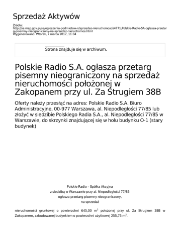 Sprzedaż Aktywów Źródło: http://se.msp.gov.pl/se/ogloszenia-podmiotow-n/sprzedaz-nieruchomosci/4771,Polskie-Radio-SA-oglasza-przetar g-pisemny-nieograniczony-na-sprzedaz-nieruchomos.html Wygenerowano: Wtorek, 7 marca 2017, 11:04 Strona znajduje się w archiwum. Polskie Radio S.A. ogłasza przetarg pisemny nieograniczony na sprzedaż nieruchomości położonej w Zakopanem przy ul. Za Strugiem 38B Oferty należy przesłąć na adres: Polskie Radio S.A. Biuro Administracyjne, 00-977 Warszawa, al. Niepodległości 77/85 lub złożyć w siedzibie Polskiego Radia S.A., al. Niepodległości 77/85 w Warszawie, do skrzynki znajdującej się w holu budynku O-1 (stary budynek) Polskie Radio – Spółka Akcyjna z siedzibą w Warszawie przy al. Niepodległości 77/85 ogłasza przetarg pisemny nieograniczony, na sprzedaż nieruchomości gruntowej o powierzchni 645,00 m2 położonej przy ul. Za Strugiem 38B w Zakopanem, zabudowanej budynkiem o powierzchni użytkowej 255,75 m2. Cena wywoławcza przedmiotu przetargu wynosi 643 000,- zł 1. Postępowanie przetargowe zostanie przeprowadzone w formie przetargu pisemnego nieograniczonego. 2. Termin składania ofert: ❍ przesłanych listownie na adres Biura Administracyjnego Polskiego Radia S.A. upływa dnia 6 listopada 2013 roku; ❍ złożonych w siedzibie Polskiego Radia S.A. upływa dnia 7 listopada 2013 roku, do godziny 14.00. 3. Ofertę wraz z wymaganymi dokumentami z dopiskiem ”Przetarg pisemny - zbycie nieruchomości Polskiego Radia S.A. w Zakopanem przy ul. Za Strugiem 38B” należy: ❍ przesłać listem poleconym za potwierdzeniem odbioru na adres: Polskie Radio S.A. Biuro Administracyjne, 00-977 Warszawa, al. Niepodległości 77/85; ❍ bądź złożyć w zaklejonej kopercie w siedzibie Polskiego Radia S.A., al. Niepodległości 77/85 w Warszawie, do skrzynki znajdującej się w holu budynku O-1 (stary budynek) i oznaczonej ”Przetarg pisemny - zbycie nieruchomości Polskiego Radia S.A. w Zakopanem”. 4. Otwarcie ofert odbędzie się w dniu 7 listopada 2013 roku, o godzinie 14.30 w siedzibie Polskiego Radia S.A. w Warszawie przy al. Niepodległości 77/85 - sala konferencyjna (pok. nr 302). 5. Warunkiem przystąpienia do przetargu jest wpłacenie do dnia 6 listopada 2013 roku wadium w gotówce w wysokości 15 000,- zł (słownie: piętnaście tysięcy), na rachunek Polskiego Radia S.A. prowadzony w Pekao S.A. nr 47 1240 5918 1111 0010 3740 7871, przy czym jako termin wpłaty rozumiany jest termin uznania wpłaty na rachunku Polskiego Radia S.A. 6. Wadium wpłacone przez uczestnika przetargu, który wygrał przetarg, zalicza się na poczet ceny nabycia nieruchomości. 7. W przypadku nieuiszczenia przez nabywcę ceny nabycia nieruchomości, bądź niezgłoszenia się w celu zawarcia aktu notarialnego, nabywca traci prawo do złożonego wadium oraz prawa wynikające z wygranego przetargu. 8. Przed przystąpieniem do przetargu należy zapoznać się ze szczegółowymi warunkami sprzedaży określonymi w „Regulaminie przetargu na sprzedaż nieruchomości”, znajdującym się w siedzibie Sprzedającego lub na stronie internetowej Polskiego Radia S.A. www.prsa.pl 9. Przedmiot przetargu można oglądać po wcześniejszym ustaleniu terminu wizyty z Biurem Administracyjnym Polskiego Radia S.A. pod nr tel.: (22) 645 9604 i (22) 645 5121, fax. (22) 645 5916, e-mail: [email protected] Polskie Radio S.A. zastrzega sobie prawo odstąpienia od przetargu w każdym czasie bez podania przyczyny. Opublikowane przez: Aleksandra Sierpińska Ostatnia zmiana: 16.10.2013 Aleksandra Autor: Polskie Radio S.A. Sierpińska Rejestr zmian