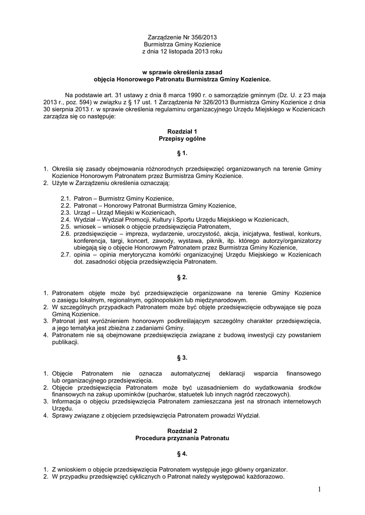 Zarządzenie Nr 356/2013 Burmistrza Gminy Kozienice z dnia 12 listopada 2013 roku w sprawie określenia zasad objęcia Honorowego Patronatu Burmistrza Gminy Kozienice. Na podstawie art. 31 ustawy z dnia 8 marca 1990 r. o samorządzie gminnym (Dz. U. z 23 maja 2013 r., poz. 594) w związku z § 17 ust. 1 Zarządzenia Nr 326/2013 Burmistrza Gminy Kozienice z dnia 30 sierpnia 2013 r. w sprawie określenia regulaminu organizacyjnego Urzędu Miejskiego w Kozienicach zarządza się co następuje: Rozdział 1 Przepisy ogólne § 1. 1. Określa się zasady obejmowania różnorodnych przedsięwzięć organizowanych na terenie Gminy Kozienice Honorowym Patronatem przez Burmistrza Gminy Kozienice. 2. Użyte w Zarządzeniu określenia oznaczają: Patron – Burmistrz Gminy Kozienice, Patronat – Honorowy Patronat Burmistrza Gminy Kozienice, Urząd – Urząd Miejski w Kozienicach, Wydział – Wydział Promocji, Kultury i Sportu Urzędu Miejskiego w Kozienicach, wniosek – wniosek o objęcie przedsięwzięcia Patronatem, przedsięwzięcie – impreza, wydarzenie, uroczystość, akcja, inicjatywa, festiwal, konkurs, konferencja, targi, koncert, zawody, wystawa, piknik, itp. którego autorzy/organizatorzy ubiegają się o objęcie Honorowym Patronatem przez Burmistrza Gminy Kozienice, 2.7. opinia – opinia merytoryczna komórki organizacyjnej Urzędu Miejskiego w Kozienicach dot. zasadności objęcia przedsięwzięcia Patronatem. 2.1. 2.2. 2.3. 2.4. 2.5. 2.6. § 2. 1. Patronatem objęte może być przedsięwzięcie organizowane na terenie Gminy Kozienice o zasięgu lokalnym, regionalnym, ogólnopolskim lub międzynarodowym. 2. W szczególnych przypadkach Patronatem może być objęte przedsięwzięcie odbywające się poza Gminą Kozienice. 3. Patronat jest wyróżnieniem honorowym podkreślającym szczególny charakter przedsięwzięcia, a jego tematyka jest zbieżna z zadaniami Gminy. 4. Patronatem nie są obejmowane przedsięwzięcia związane z budową inwestycji czy powstaniem publikacji. § 3. 1. Objęcie Patronatem nie oznacza automatycznej deklaracji wsparcia finansowego lub organizacyjnego przedsięwzięcia. 2. Objęcie przedsięwzięcia Patronatem może być uzasadnieniem do wydatkowania środków finansowych na zakup upominków (pucharów, statuetek lub innych nagród rzeczowych). 3. Informacja o objęciu przedsięwzięcia Patronatem zamieszczana jest na stronach internetowych Urzędu. 4. Sprawy związane z objęciem przedsięwzięcia Patronatem prowadzi Wydział. Rozdział 2 Procedura przyznania Patronatu § 4. 1. Z wnioskiem o objęcie przedsięwzięcia Patronatem występuje jego główny organizator. 2. W przypadku przedsięwzięć cyklicznych o Patronat należy występować każdorazowo. 1 3. Wniosek wraz z załącznikami powinien zostać złożony nie później niż na 21 dni kalendarzowych przed planowaną datą organizacji przedsięwzięcia. Wniosek złożony po tym terminie może nie zostać rozpatrzony. 4. W uzasadnionych przypadkach Burmistrz Gminy Kozienice może uwzględnić wnioski złożone po przekroczeniu terminu określonego w § 4 pkt.3. § 5. 1. Do złożenia wniosku o objęcie przedsięwzięcia Patronatem wykorzystać należy wzór formularza do pobrania ze strony internetowej www.kozienice.pl lub otrzymać w Wydziale. Formularz wniosku stanowi załącznik nr 1 do niniejszego Zarządzenia. 2. Wniosek można złożyć: 2.1. osobiście w sekretariacie Urzędu Miejskiego w Kozienicach (pok. nr 111), ul. Parkowa 5, 26-900 Kozienice, 2.2. za pośrednictwem poczty na adres Urzędu Miejskiego w Kozienicach (pok. nr 111), ul. Parkowa 5, 26-900 Kozienice, 2.3. faxem: 48 614 20 48, 2.4. drogą mailową na adres: [email protected], § 6. 1. Burmistrz Gminy Kozienice po otrzymaniu wniosku może wystąpić o wydanie opinii do merytorycznej komórki organizacyjnej Urzędu Miejskiego w Kozienicach w sprawie zasadności objęcia Patronatem organizowanego przedsięwzięcia. Formularz opinii stanowi załącznik nr 2 do niniejszego Zarządzenia. 2. Opinia powinna zawierać w szczególności informacje na temat zasadności osobistego udziału Burmistrza w przedsięwzięciu oraz ewentualnego wsparcia przedsięwzięcia i źródeł jego finansowania. 3. Merytoryczna komórka organizacyjna wydaje opinię w ciągu 3 dni roboczych od dnia otrzymania wniosku. 4. Organizator może zostać poproszony o złożenie dodatkowych wyjaśnień w sprawie planowanego przedsięwzięcia w ciągu 7 dni roboczych od daty wpłynięcia wniosku o Patronat. W takim przypadku termin, o którym mowa w pkt. 3 niniejszego § 6 liczony jest od dnia otrzymania dodatkowych wyjaśnień od organizatora. § 7. 1. Po zapoznaniu się z opinią przygotowaną przez merytoryczną komórkę organizacyjną Urzędu Miejskiego w Kozienicach, dotyczącą złożonego wniosku o Patronat, Burmistrz podejmuje decyzję o objęciu przedsięwzięcia Patronatem bądź odmawia objęcia przedsięwzięcia Patronatem. 2. O decyzji, o której mowa w § 7 pkt. 1, organizator powiadamiany jest pisemnie. 3. Odmowa objęcia przedsięwzięcia Patronatem jest ostateczna. Wnioskodawcy nie przysługuje tryb odwoławczy. Rozdział 3 Korzystanie z Patronatu § 8. 1. Organizator przedsięwzięcia, które objęte zostało Patronatem zobowiązany jest do: a) zamieszczenia informacji o Patronacie na swojej stronie internetowej (ew. stronach internetowej współorganizatorów) oraz na wszelkich materiałach promocyjnych, reklamowych i informacyjnych, b) zamieszczenia herbu Gminy Kozienice wraz z podpisem „Gmina Kozienice” oraz informacjami teleadresowymi gminy na wszelkich materiałach promocyjnych, reklamowych i informacyjnych zgodnie ze wskazówkami zamieszczonymi w piśmie informującym o objęciu przedsięwzięcia Honorowym Patronatem Burmistrza Gminy Kozienice, c) poinformowania współorganizatorów, uczestników dziennikarzy prasowych, radia, TV i portali internetowych o przyznanym wyróżnieniu w postaci objęcia przedsięwzięcia Patronatem, 2 d) 