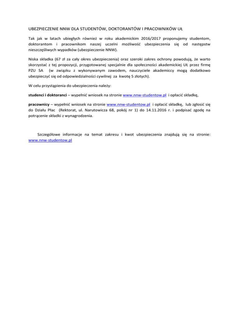 UBEZPIECZENIE NNW DLA STUDENTÓW, DOKTORANTÓW I PRACOWNIKÓW UŁ Tak jak w latach ubiegłych również w roku akademickim 2016/2017 proponujemy studentom, doktorantom i pracownikom naszej uczelni możliwość ubezpieczenia się od następstw nieszczęśliwych wypadków (ubezpieczenie NNW). Niska składka (67 zł za cały okres ubezpieczenia) oraz szeroki zakres ochrony powodują, że warto skorzystać z tej propozycji, przygotowanej specjalnie dla społeczności akademickiej UŁ przez firmę PZU SA (w związku z wykonywanym zawodem, nauczyciele akademiccy mogą dodatkowo ubezpieczyć się od odpowiedzialności cywilnej za kwotę 5 złotych). W celu przystąpienia do ubezpieczenia należy: studenci i doktoranci – wypełnić wniosek na stronie www.nnw-studentow.pl i opłacić składkę, pracownicy – wypełnić wniosek na stronie www.nnw-studentow.pl i opłacić składkę, lub zgłosić się do Działu Płac (Rektorat, ul. Narutowicza 68, pokój nr 1) do 14.11.2016 r. i podpisać zgodę na potrącenie składki z wynagrodzenia. Szczegółowe informacje na temat zakresu i kwot ubezpieczenia znajdują się na stronie: www.nnw-studentow.pl
