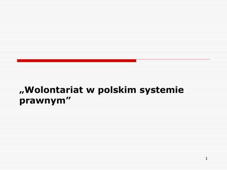 „Wolontariat w polskim systemie prawnym” 1 Regulacje dotyczące wolontariatu Ustawa z dnia 24 kwietnia 2003 r. o działalności pożytku publicznego i o wolontariacie z późniejszymi zmianami (Dz. U. Nr 96, poz. 873 ze. zm.) Nowelizacja ustawy – 2010 4 nowe zapisy 2 Dział III ustawy Kto to jest wolontariusz? Kto może korzystać ze świadczeń wolontariusza? Jakie kwalifikacje powinien posiadać wolontariusz? Porozumienie o współpracy – umowa z wolontariuszem Ubezpieczenia wolontariusza Obowiązki wobec wolontariusza Co możemy zaoferować wolontariuszowi? Wolontariat zagraniczny Jak księgować koszty związane z wolontariuszami? 3 Wolontariusz Wolontariusz – osoba fizyczna, która ochotniczo bez wynagrodzenia wykonuje świadczenia na zasadach określonych w ustawie o działalności pożytku publicznego i o wolontariacie. Wolontariat - dobrowolne, świadome i bezpłatne działanie na rzecz innych, wykraczające poza więzi koleżeńsko – przyjacielsko - rodzinne 4 Do kogo stosują się unormowania dotyczące wolontariatu obywateli polskich, cudzoziemców przebywających legalnie na terytorium RP Jednak jeżeli Polska zawarła z innym państwem lub organizacją międzynarodową umowę, która inaczej reguluje kwestie związane z angażowaniem wolontariuszy, stosuję się wówczas zapisy tejże umowy 5 Kto może być wolontariuszem? Wolontariuszem jest każda osoba fizyczna, która ochotniczo (dobrowolnie) i bez wynagrodzenia wykonuje świadczenia na rzecz uprawnionych organizacji i instytucji: osoba pełnoletnia oraz niepełnoletnia za zgodą opiekunów prawnych cudzoziemiec przebywający legalnie na terytorium RP, osoba bezrobotna* 6 Kto może być wolontariuszem? Art. 11. W ustawie z dnia 20 kwietnia 2004 r. o promocji zatrudnienia i instytucjach rynku pracy (Dz. U. z 2008 r. Nr 69, poz. 415, z późn. zm.7)) wprowadza się następujące zmiany: 1) w art. 2 ust. 2 otrzymuje brzmienie: „2. Nie stanowi przeszkody do nabycia oraz posiadania statusu bezrobotnego: 1) wykonywanie przez wolontariuszy świadczeń odpowiadających świadczeniu pracy na zasadach określonych w przepisach o Ustawy ODPPioW jeżeli wolontariusz przedstawi właściwemu powiatowemu urzędowi pracy porozumienie z korzystającym; 7 Kto może korzystać ze świadczeń wolontariusza? Organizacje pozarządowe Organy administracji publicznej (np. urzędy, ministerstwa) i jednostki organizacyjne podległe organom administracji publicznej (np. szpitale, ośrodki pomocy społecznej itp.) Kościelne osoby prawne i jednostki organizacyjne Stowarzyszenia jednostek samorządu terytorialnego Kluby sportowe Spółki i spółki z o.o. które nie działają dla zysku i cały „zysk” przeznaczają na działalność statutową Spółdzielnie socjalne …z wyłączeniem prowadzonej przez nie działalności gospodarczej!!! 8 Przykład: Wolontariusze wyrazili gotowość do świadczenia pomocy w urzędzie miejskim w Białymstoku. Trzech ochotników pomagać będzie w tworzeniu serwisu internetowego urzędu oraz w przygotowywaniu materiałów promocyjnych o mieście. Jeden z wolontariuszy wyraził gotowość pomocy w drukarni będącej w dyspozycji urzędu miejskiego. Ze względu na konkurencyjne ceny, drukarnia uzyskała duże zamówienie od lokalnego przedsiębiorcy na druk folderu reklamowego. 9 Jakie kwalifikacje powinien posiadać wolontariusz? Powinien posiadać kwalifikacje i spełniać wymagania odpowiednie do rodzaju i zakresu wykonywanych świadczeń, jeżeli obowiązek ich posiadania i spełniania stosownych wymagań wynika z odrębnych przepisów, np. kierowca – prawo jazdy kucharz – badania SANEPID-u wychowawca kolonijny – kurs wychowawcy kolonijnego . 10 Świadczenie wolontariusza jest świadczeniem odpowiadającym świadczeniu pracy wolontariusz nie jest pracownikiem bo za wykonywane świadczenia nie pobiera wynagrodzenia, okres wykonywania świadczeń wolontarystycznych nie wpływa na uprawnienia pracownicze (urlop wypoczynkowy, zaopatrzenie emerytalne) 11 Świadczenie wolontariusza jest świadczeniem odpowiadającym świadczeniu pracy stosunek prawny łączący korzystającego z wolontariuszem nie jest stosunkiem pracy, tylko stosunkiem cywilnoprawnym, do spraw nie uregulowanych w porozumieniu wolontariackim i ustawie o działalności pożytku publicznego i o wolontariacie stosuje się przepisy kodeksu cywilnego 12 Porozumienie o współpracy – umowa z wolontariuszem W porozumieniu należy określić: zakres prac, sposób i miejsce ich wykonywania, czas współpracy, warunki rozwiązania porozumienia 13 Forma porozumienia Uzależniona jest od okresu wykonywania przez wolontariusza świadczeń na rzecz korzystającego: jeżeli porozumienie będzie zawierane na okres krótszy niż 30 dni, korzystający nie będzie zobowiązany potwierdzać na piśmie treści porozumienia, chyba że wolontariusz wyrazi taką wolę, obowiązek sporządzenia porozumienia na piśmie powstaje gdy świadczenie wolontariusza będzie wykonywane przez okres dłuższy niż 30 dni Okres 30 dni traktowany jest jako 30 dni kalendarzowych liczonych od pierwszego dnia w którym wolontariusz wykonywał świadczenie. 14 Przykład: Tomek przeszedł pomyślnie rekrutację wolontariuszy, którzy zostaną zaangażowani do współpracy z Domowym Hospicjum Dziecięcym. Tomek porozumiał się, że będzie odwiedzał chorego Pawełka w jego domu dwa razy w tygodniu, począwszy od 4 marca. W czasie odwiedzin będzie uczył Pawełka obsługi komputera i korzystania z Internetu. 15 Gdzie należy zgłaszać porozumienie? porozumienia wolontariackiego nie trzeba nigdzie zgłaszać, należy je przechowywać w dokumentacji organizacji 16 Obowiązki korzystającego wobec wolontariusza pokrywać, na dotyczących pracowników zasadach, koszty podróży służbowych i diet, wolontariusz może, w formie pisemnej pod rygorem nieważności, zwolnić korzystającego w całości lub w części z obowiązków pokrywania kosztów podróży służbowych i d