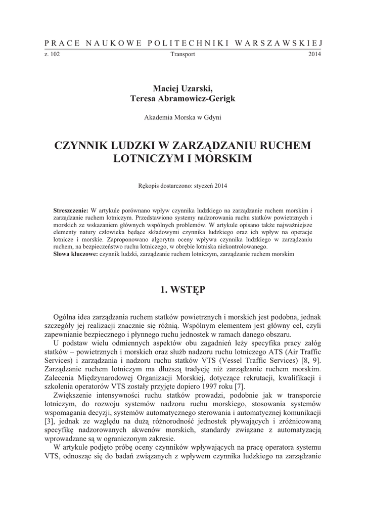 PRACE NAUKOWE POLITECHNIKI WARSZAWSKIEJ z. 102 Transport 2014 Maciej Uzarski, Teresa Abramowicz-Gerigk Akademia Morska w Gdyni CZYNNIK LUDZKI W ZARZ+DZANIU RUCHEM LOTNICZYM I MORSKIM RHkopis dostarczono: styczeK 2014 Streszczenie: W artykule porównano wpOyw czynnika ludzkiego na zarzQdzanie ruchem morskim i zarzQdzanie ruchem lotniczym. Przedstawiono systemy nadzorowania ruchu statków powietrznych i morskich ze wskazaniem gOównych wspólnych problemów. W artykule opisano takTe najwaTniejsze elementy natury czOowieka bHdQce skOadowymi czynnika ludzkiego oraz ich wpOyw na operacje lotnicze i morskie. Zaproponowano algorytm oceny wpOywu czynnika ludzkiego w zarzQdzaniu ruchem, na bezpieczeKstwo ruchu lotniczego, w obrHbie lotniska niekontrolowanego. S0owa kluczowe: czynnik ludzki, zarzQdzanie ruchem lotniczym, zarzQdzanie ruchem morskim 1. WST3P Ogólna idea zarzQdzania ruchem statków powietrznych i morskich jest podobna, jednak szczegóOy jej realizacji znacznie siH róTniQ. Wspólnym elementem jest gOówny cel, czyli zapewnianie bezpiecznego i pOynnego ruchu jednostek w ramach danego obszaru. U podstaw wielu odmiennych aspektów obu zagadnieK leTy specyfika pracy zaOóg statków – powietrznych i morskich oraz sOuTb nadzoru ruchu lotniczego ATS (Air Traffic Services) i zarzQdzania i nadzoru ruchu statków VTS (Vessel Traffic Services) [8, 9]. ZarzQdzanie ruchem lotniczym ma dOuTszQ tradycjH niT zarzQdzanie ruchem morskim. Zalecenia MiHdzynarodowej Organizacji Morskiej, dotyczQce rekrutacji, kwalifikacji i szkolenia operatorów VTS zostaOy przyjHte dopiero 1997 roku [7]. ZwiHkszenie intensywnobci ruchu statków prowadzi, podobnie jak w transporcie lotniczym, do rozwoju systemów nadzoru ruchu morskiego, stosowania systemów wspomagania decyzji, systemów automatycznego sterowania i automatycznej komunikacji [3], jednak ze wzglHdu na duTQ róTnorodnobd jednostek pOywajQcych i zróTnicowanQ specyfikH nadzorowanych akwenów morskich, standardy zwiQzane z automatyzacjQ wprowadzane sQ w ograniczonym zakresie. W artykule podjHto próbH oceny czynników wpOywajQcych na pracH operatora systemu VTS, odnoszQc siH do badaK zwiQzanych z wpOywem czynnika ludzkiego na zarzQdzanie ! 160 Maciej Uzarski, Teresa Abramowicz-Gerigk ruchem powietrznym, obserwacji autora (Uzarski M.) oraz badaK ankietowych, jakie przeprowadzono w wybranych stacjach VTS na bwiecie. Zaproponowano uproszczony algorytm oceny wpOywu czynnika ludzkiego, wystHpujQcego w zarzQdzaniu ruchem, na bezpieczeKstwo w obrHbie lotniska niekontrolowanego, uTytkowanego gOównie przez samoloty lotnictwa ogólnego. 2. SYSTEMY ZARZ+DZANIA RUCHEM LOTNICZYM I MORSKIM W odróTnieniu od transportu lotniczego, obszary odpowiedzialnobci VTS obejmujQ jedynie akweny niebezpieczne pod wzglHdem nawigacyjnym i o najwiHkszym natHTeniu ruchu. Systemy zarzQdzania ruchem morskim róTniQ siH pomiHdzy sobQ w zaleTnobci od struktury organizacyjnej portu oraz podziaOu kompetencji pomiHdzy instytucje dziaOajQce na terenie portu i administracjH morskQ. ZasadniczQ róTnicQ jest równieT odpowiedzialnobd ponoszona przez kontrolerów lub operatorów wspomnianych wyTej jednostek. Zapewniana jest sOuTba informacyjna lub doradcza, a odpowiedzialnobd za bezpieczne prowadzenie statku morskiego ponosi w caOobci kapitan. Zakres pomocy dostHpnej dla pilotów statków powietrznych zaleTy od klasy przestrzeni powietrznej, w której siH znajdujQ. Podczas lotów w przestrzeni kontrolowanej, w zdecydowanej wiHkszobci przypadków za bezpieczeKstwo samolotów odpowiada Kontroler Ruchu Lotniczego, mimo iT tu takTe Kapitan (Pilot – dowódca) podejmuje ostateczne decyzje w zakresie bezpieczeKstwa lotu. SOuTby nadzoru ruchu lotniczego, wedOug Organizacji MiHdzynarodowego Lotnictwa Cywilnego ICAO (International Civil Aviation Organisation), stanowiQ: wspomniana powyTej SOuTba Informacji, SOuTba Doradcza, sOuTba Kontroli Ruchu Lotniczego oraz SOuTba Alarmowa. Proces integracji systemów nadzoru morskiego wciQT postHpuje [2]. Na forum miHdzynarodowym, w ramach prac MiHdzynarodowej Organizacji Morskiej, Komisji Europejskiej i Europejskiej Agencji Kosmicznej rozwijane sQ koncepcje e-navigation, e-maritime oraz MITS (ang. Maritime Intelligent Transportation System), w ramach których dQTy siH do integracji systemów bezpieczeKstwa, informacyjnych i komunikacyjnych [1]. Zgodnie z wieloletnim planem przyjHtym w 2010 r. prace Komisji Europejskiej zmierzajQ do stworzenia wspólnego mechanizmu wymiany informacji dla obszarów morskich Unii Europejskiej CISE (Common Information Sharing Environment), który umoTliwia wymianH informacji o ryzyku i zagroTeniach pomiHdzy organami odpowiedzialnymi za bezpiecznQ TeglugH i kontrolH ryboOówstwa [12]. Rozwój systemów informacyjnych wspomaga pracH operatorów nadzoru ruchu, a jednoczebnie zwiHksza wymagania dotyczQce ich kompetencji i zdolnobci. Zarówno w transporcie lotniczym, jak i transporcie morskim, najwaTniejszym elementem systemów nadzoru wciQT pozostaje czOowiek [13]. ! Czynnik ludzki w zarzQdzaniu ruchem lotniczym i morskim 161 3. NATURA CZ7OWIEKA I JEJ WP7YW NA ZARZ+DZANIE RUCHEM Czynnik ludzki jest to jeden z najbardziej zOoTonych elementów, wpOywajQcych na bezpieczeKstwo Teglugi. ZaleTy on od elementów skOadajQcych siH na naturH czOowieka (rysunek 1). ROZUMIENIE! SYTUACJI PODEJMOWANIE RYZYKA KOMUNIKACJA CZ"OWIEK POPE1NIANIE! B18DÓW I POMY1EK ROZWÓJ CZYNNIKI PSYCHOFIZYCZNE WSPÓ1PRACA! PODEJMOWANIE! DECYZJI Rys. 1. Elementy natury czOowieka Opracowano na podstawie [6] Do najwaTniejszych elementów skOadajQcych siH na naturH czOowieka, wymienionych na rysunku 1 naleTQ: w0a9ciwe rozumienie sytuacji: WOabciwe rozumienie sytuacji jest utrudnione niepewnobciQ, dwuznacznobciQ oraz zOoTonobciQ i nadmiarem informacji dostHpnych wspóOczebnie sOuTbom ruchu oraz zaOogom statków. CzOowiek podbwiadomie wybiera otrzymywane informacje, biorQc pod uwagH wOasne potrzeby, posiadane pojHcie o danej sytuacji, dobwiadczenia z przeszOobci, cel czy dane mo