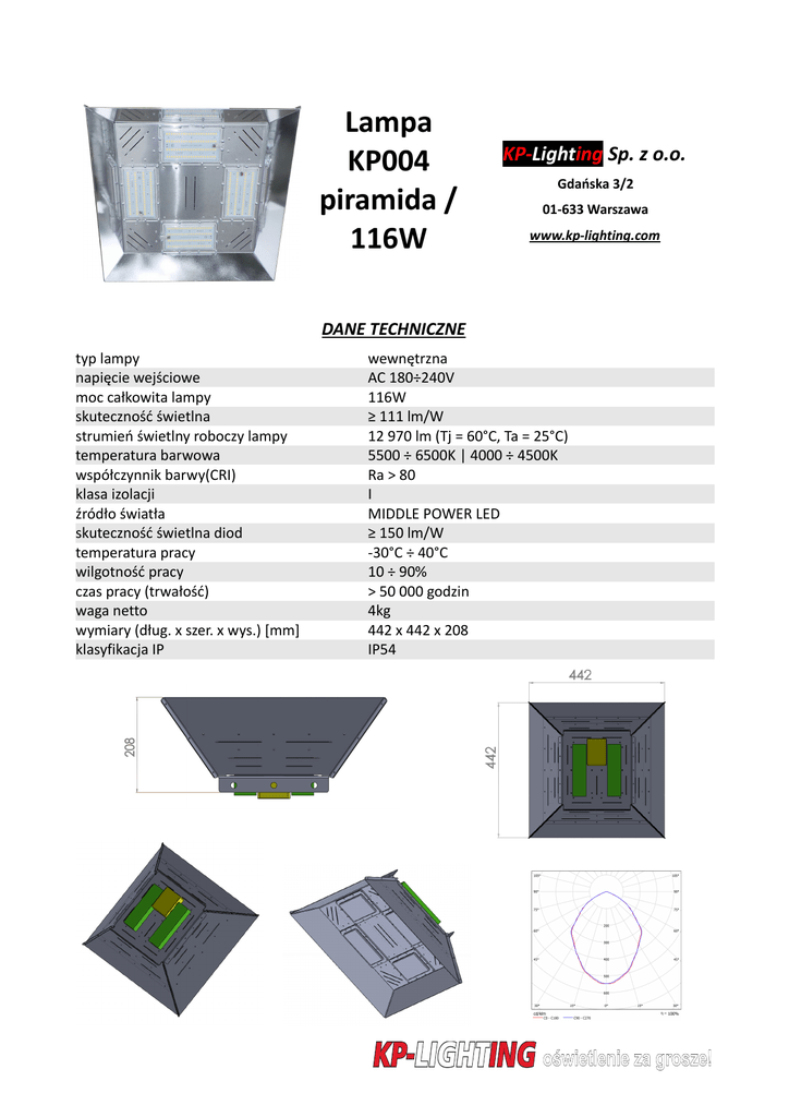 Lampa KP004 piramida / 116W KP-Lighting Sp. z o.o. Gdańska 3/2 01-633 Warszawa www.kp-lighting.com DANE TECHNICZNE typ lampy napięcie wejściowe moc całkowita lampy skuteczność świetlna strumień świetlny roboczy lampy temperatura barwowa współczynnik barwy(CRI) klasa izolacji źródło światła skuteczność świetlna diod temperatura pracy wilgotność pracy czas pracy (trwałość) waga netto wymiary (dług. x szer. x wys.) [mm] klasyfikacja IP wewnętrzna AC 180÷240V 116W ≥ 111 lm/W 12 970 lm (Tj = 60°C, Ta = 25°C) 5500 ÷ 6500K | 4000 ÷ 4500K Ra > 80 I MIDDLE POWER LED ≥ 150 lm/W -30°C ÷ 40°C 10 ÷ 90% > 50 000 godzin 4kg 442 x 442 x 208 IP54
