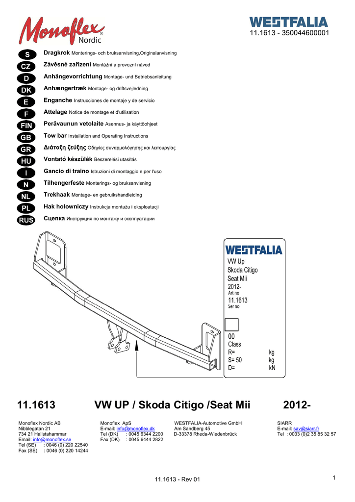 11.1613 - 350044600001 Dragkrok Monterings- och bruksanvisning,Originalanvisning Závěsné zařízení Montážní a provozní návod Anhängevorrichtung Montage- und Betriebsanleitung Anhængertræk Montage- og driftsvejledning Enganche Instrucciones de montaje y de servicio Attelage Notice de montage et d'utilisation Perävaunun vetolaite Asennus- ja käyttöohjeet Tow bar Installation and Operating Instructions ∆ιάταξη ζεύξης Οδηγίες συναρμολόγησης και λειτουργίας Vontató készülék Beszerelési utasítás Gancio di traino Istruzioni di montaggio e per l'uso Tilhengerfeste Monterings- og bruksanvisning Trekhaak Montage- en gebruikshandleiding Hak holowniczy Instrukcja montażu i eksploatacji Сцепка Инструкция по монтажу и эксплуатации 11.1613 Monoflex Nordic AB Nibblegatan 21 734 21 Hallstahammar Email: [email protected] Tel (SE) : 0046 (0) 220 22540 Fax (SE) : 0046 (0) 220 14244 VW UP / Skoda Citigo /Seat Mii Monoflex ApS E-mail: [email protected] Tel (DK) : 0045 6344 2200 Fax (DK) : 0045 6444 2822 WESTFALIA-Automotive GmbH Am Sandberg 45 D-33378 Rheda-Wiedenbrück 11.1613 - Rev 01 2012SIARR E-mail: [email protected] Tel : 0033 (0)2 35 85 32 57 1 2 11.1613 - Rev 01 11.1613 - Rev 01 3 01 02 03 4 11.1613 - Rev 01 04 05 VW-45mm Skoda-40mm Seat-40mm VW-55mm Skoda-55mm Seat-55mm 06 11.1613 - Rev 01 5 07a 60mm 50mm 07b 08 6 11.1613 - Rev 01 09 M8 24Nm M12 83Nm 10 11 Not approved for trailer / caravan use 11.1613 - Rev 01 7