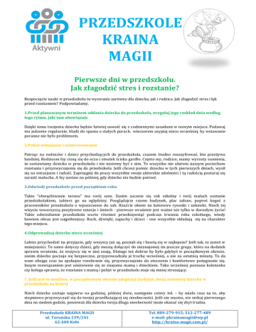PRZEDSZKOLE KRAINA MAGII Pierwsze dni w przedszkolu. Jak złagodzić stres i rozstanie? Rozpoczęcie nauki w przedszkolu to wyzwanie zarówno dla dziecka, jak i rodzica. Jak złagodzić stres i lęk przed rozstaniem? Podpowiadamy. 1.Przed planowanym terminem oddania dziecka do przedszkola, ureguluj jego rozkład dnia według tego rytmu, jaki tam obowiązuje Dzięki temu twojemu dziecku będzie łatwiej oswoić się z codziennymi zasadami w nowym miejscu. Podawaj mu jedzenie regularnie, kładź do spania o stałych porach, wieczorem usypiaj nieco wcześniej, by wstawanie poranne nie było problemem. 2.Pokaż entuzjazm i zainteresowanie Patrząc na rodziców i dzieci przychodzących do przedszkola, czasem trudno rozszyfrować, kto przeżywa bardziej. Rodzicom łzy cisną się do oczu i smutek ściska gardło. Często my, rodzice, mamy wyrzuty sumienia, że zostawiamy dziecko w przedszkolu i nie możemy być z nim. To wszystko nie ułatwia naszym pociechom rozstania i przyzwyczajenia się do przedszkola. Jeśli chcesz pomóc dziecku w tych pierwszych dniach, wysil się na entuzjazm i radość. Zaprzęgnij do pracy wszystkie swoje aktorskie zdolności i tą radością postaraj się zarazić malucha. A łzy zostaw na później, gdy dziecko nie będzie patrzeć. 3.Odwiedź przedszkole przed początkiem roku Takie "obwąchiwanie terenu" ma swój sens. Zanim zacznie się rok szkolny i twój maluch zostanie przedszkolakiem, zabierz go na oględziny. Pooglądajcie razem budynek, plac zabaw, poproś kogoś z pracowników przedszkola o wpuszczenie do sali. Rzućcie okiem na kolorowe rysunki i zabawki. Niech tej wizycie towarzyszą pozytywne emocje i śmiech - pierwsze wrażenie jest ważne nie tylko w dorosłym życiu! Takie odwiedzenie przedszkola warto również przedsięwziąć podczas trwania roku szkolnego, wtedy bowiem obraz jest najpełniejszy. Ruch, dźwięki, zapachy i dzieci - one wszystkie składają się na charakter tego miejsca. 4.Odprowadzaj dziecko nieco wcześniej. Lubisz przychodzić na przyjęcie, gdy wszyscy już są, poznali się i bawią się w najlepsze? Jeśli tak, to jesteś w mniejszości. To samo dotyczy dzieci, gdy muszą dołączyć do nieznajomej im jeszcze grupy, która na dodatek sprawia wrażenie, że wszyscy się w niej znają. Dlatego też dobrze by było gdybyś w początkowym okresie, zanim dziecko poczuje się bezpieczne, przyprowadzała je trochę wcześniej, a nie na ostatnią minutę. To da wam obojgu czas na spokojne rozebranie się, przyzwyczajenie do otoczenia i komfortowe pożegnanie się. Innym rozwiązaniem jest umówienie się ze znajoma mamą i dzieckiem. Taka wcześniej poznana koleżanka czy kolega sprawia, że rozstanie z mamą i pobyt w przedszkolu staje się mniej stresujący. 5. Jeśli jest to możliwe, w początkowym okresie adaptacji (tydzień, dwa) zostawiaj dziecko w przedszkolu na krócej Niech dziecko zostaje najpierw na godzinę, później dwie, następnie cztery itd. – by miało czas na to, aby stopniowo przyzwyczaić się do twojej przedłużającej się nieobecności. Jeśli nie musisz, nie znikaj pierwszego dnia na siedem godzin, ponieważ dla dziecka twoja długa nieobecność może okazać się zbyt trudna. Przedszkole KRAINA MAGII ul. Toruńska 239/241 62-600 Koło Tel. 889-279-915; 512-277-489 e-mail: [email protected] http://kraina-magii.com.pl/ PRZEDSZKOLE KRAINA MAGII UWAGA! Nie spóźniajcie się z odbieraniem dziecka. Jeśli obiecaliście, że przyjdziecie po obiedzie dotrzymajcie słowa 6.Pożegnanie powinno być jak najkrótsze Przyprowadź maluszka do przedszkola, rozbierz i wprowadź na salę, oddając pod opiekę pani wychowawczyni. Ważne, by rozstanie odbyło się szybko i sprawnie. Każde dodatkowe pożegnanie, ponowne przytulenie sprawia, że dziecko koncentruje się na swoich emocjach, płaczu i coraz trudniej jest mu się uspokoić. Czas na wspólne utulanie wykorzystajcie w domu. Przedłużanie chwili pożegnania nie służy ani dziecku, ani żadnemu z opiekunów. Pożegnanie nawet ze łzami w oczach jest lepsze niż brak pożegnania, które podkopuje wiarę i poczucie bezpieczeństwa dziecka! Dlatego też nie wymiguj się od niego, nie przemykaj cichcem gdzieś pod ścianą. Pamiętaj jedynie o tym, by nie żegnać się zbyt długo i wylewnie, bo taki scenariusz może zakończyć się tym, że wrócicie razem do domu i nici z przedszkola. Podczas pożegnania życz dziecku miło spędzonego czasu i dobrej zabawy - niech kojarzy przedszkole z nimi właśnie i wie, ze zostawiasz go w dobrych rękach. Nie zapomnij o "Kocham Cię" i "Do zobaczenia po podwieczorku/obiedzie!". Te krótkie informacje dadzą dziecku znać o tym, co dla niego w tej nowej sytuacji najważniejsze: że zostaje w bezpiecznym miejscu, gdzie miło spędzi czas, że je kochasz i że wrócisz po nie już wkrótce I najważniejsze: NIE OKŁAMUJCIE swoich dzieci. Nie mówcie, że czekacie na korytarzu, że pójdziecie tylko do sklepu i za kilka minut wrócicie. 8. Jeśli dziecko weszło już na salę, nie zaglądaj by zobaczyć co robi, jak się bawi, czy płacze Dziecko zrobiło duży krok naprzód i opanowało swój smutek – jest gotowe do zabawy, stało się częścią grupy. Najgorsze, co możesz zrobić to pokazać się znowu w otwartych drzwiach. Dla dziecka jesteś i będziesz najważniejszy/a i na ciebie będzie czekało. Gdy cię zobaczy, na pewno przybiegnie i obojętnie, czy wyjdziesz szybko czy zostaniesz, dziecko będzie musiało znowu zmierzyć się ze swoimi uczuciami. Lecz tym razem zajmie mu to więcej czasu, a każde następne otwarcie drzwi będzie przyjęte przez nie z nadzieją, że znów cię w nich zobaczy. Jeżeli chcesz dowiedzieć się jak sobie radzi w przedszkolu, zadzwoń i zapytaj. Na pewno uzyskasz taką informację. 9. Aby dziecku było łatwiej zostaw mu coś, co do ciebie należy i z tobą się kojarzy Dziecku będzie raźniej, jeśli weźmie z domu ukochanego misia lub zabawkę, wsuń mu do kieszeni malutkiego 