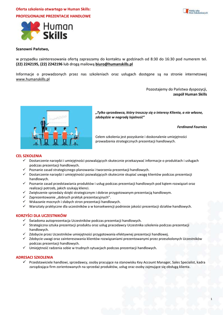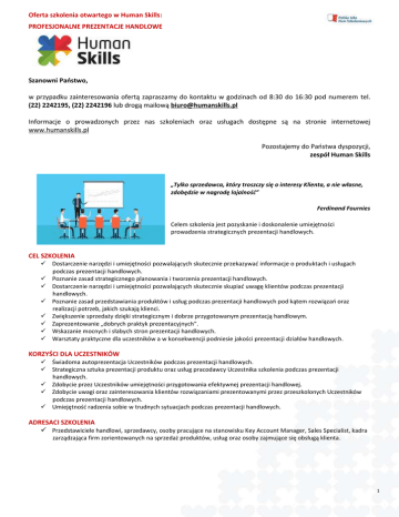 Oferta szkolenia otwartego w Human Skills: PROFESJONALNE PREZENTACJE HANDLOWE Szanowni Państwo, w przypadku zainteresowania ofertą zapraszamy do kontaktu w godzinach od 8:30 do 16:30 pod numerem tel. (22) 2242195, (22) 2242196 lub drogą mailową [email protected] Informacje o prowadzonych przez nas szkoleniach oraz usługach dostępne są na stronie internetowej www.humanskills.pl Pozostajemy do Państwa dyspozycji, zespół Human Skills „Tylko sprzedawca, który troszczy się o interesy Klienta, a nie własne, zdobędzie w nagrodę lojalność” Ferdinand Fournies Celem szkolenia jest pozyskanie i doskonalenie umiejętności prowadzenia strategicznych prezentacji handlowych. CEL SZKOLENIA Dostarczenie narzędzi i umiejętności pozwalających skutecznie przekazywać informacje o produktach i usługach podczas prezentacji handlowych. Poznanie zasad strategicznego planowania i tworzenia prezentacji handlowych. Dostarczenie narzędzi i umiejętności pozwalających skutecznie skupiać uwagę klientów podczas prezentacji handlowych. Poznanie zasad przedstawiania produktów i usług podczas prezentacji handlowych pod kątem rozwiązań oraz realizacji potrzeb, jakich szukają klienci. Zwiększenie sprzedaży dzięki strategicznym i dobrze przygotowanym prezentacją handlowym. Zaprezentowanie „dobrych praktyk prezentacyjnych”. Wskazanie mocnych i słabych stron prezentacji handlowych. Warsztaty praktyczne dla uczestników a w konsekwencji podniesie jakości prezentacji działów handlowych. KORZYŚCI DLA UCZESTNIKÓW Świadoma autoprezentacja Uczestników podczas prezentacji handlowych. Strategiczna sztuka prezentacji produktu oraz usług pracodawcy Uczestnika szkolenia podczas prezentacji handlowych. Zdobycie przez Uczestników umiejętności przygotowania efektywnej prezentacji handlowej. Zdobycie uwagi oraz zainteresowania klientów rozwiązaniami prezentowanymi przez przeszkolonych Uczestników podczas prezentacji handlowych. Umiejętność radzenia sobie w trudnych sytuacjach podczas prezentacji handlowych. ADRESACI SZKOLENIA Przedstawiciele handlowi, sprzedawcy, osoby pracujące na stanowisku Key Account Manager, Sales Specialist, kadra zarządzająca firm zorientowanych na sprzedaż produktów, usług oraz osoby zajmujące się obsługą klienta. 1 Oferta szkolenia otwartego w Human Skills: PROFESJONALNE PREZENTACJE HANDLOWE PROGRAM SZKOLENIA DZIEŃ I 09:00-09:15 Rozpoczęcie szkolenie. Omówienie celów szkolenia oraz potrzeb uczestników. 09:15-11:00 MODUŁ I PREZENTACJE HANDLOWE – PRZYGOTOWANIE STRATEGICZNE 1. Jak się przygotować do prezentacji handlowej? 2. Jak zrealizować realne i mierzalne cele firmy podczas prezentacji handlowej? 3. Jak przygotować action plan? 4. Jak budować strukturę dla prezentacji handlowej? Przykłady struktur. 5. Jak przygotować profesjonalne prezentacje handlowe? 6. Jak zbierać i przygotować informacje do umieszczenia w prezentacji handlowej? 7. Jak podkreślać cele prezentacji handlowej? Przykłady. 8. Jakie dodatkowe narzędzia i sprzęt (Power Point, flipachart, film, obraz, wskaźnik) warto wykorzystać podczas profesjonalnej prezentacji handlowej? Omówienie. 9. Co powinno się znaleźć w części merytorycznej prezentacji handlowej? Przykłady. 11:00-11:10 Przerwa 11:10-13:00 MODUŁ II PREZENTACJE HANDLOWE – PREZENTER/KOMUNIKATOR ORAZ KLIENCI/AUDYTORIUM 1. Jakie są najważniejsze kompetencje sprzedawcy i jak je wykazać? Metoda STAR/PAR. 2. Jak budować wiarygodność i spójność? Zasady nowoczesnego komunikatora. 3. Jak nastawiać się pozytywnie do przeprowadzenia prezentacji? Korzyści bycia sprzedawcą. 4. Dlaczego klienci kupują? Siła słowa dlaczego. 5. Dlaczego klienci najpierw kupują wzrokiem i emocjami a potem racjonalizują zakup? Siła mózgu pierwotnego. 6. Jak przygotować się wizerunkowo do prezentacji handlowej? Omówienie mowy ciała oraz zasad dress codu. Przykłady. 7. Jaki dobrać styl prezentacji do grupy odbiorców? Praktyczna psychologia osobowości. 8. Jak skupiać uwagę klientów? Przykłady. 9. Jak budować kontakt z odbiorcami prezentacji handlowej? Zasady koła komunikacji. Przykłady. 13:00-13:40 Przerwa na obiad 13:40-15:00 MODUŁ III PREZENTACJE HANDLOWE – PRAKTYKA/PRACA Z KAMERĄ 1. Prezentacje Uczestników szkolenia zgodnie z wylosowanym tematem. 15:00-15:10 Przerwa 15:10-15:40 MODUŁ IV PREZENTACJE HANDLOWE PRAKTYKA 1. Omówienie nagrań oraz sugestie dla uczestników. 15:40- 16:00 Podsumowanie pierwszego dnia szkolenia. 2 Oferta szkolenia otwartego w Human Skills: PROFESJONALNE PREZENTACJE HANDLOWE DZIEŃ II 09:00-09:15 Rozpoczęcie szkolenia. Omówienie efektów pierwszego dnia szkolenia. 09:15-11:00 MODUŁ I PREZENTACJE HANDLOWE – TRUDNE SYTUACJE 1. Jak dobierać informacje w argumentacji podczas prezentacji handlowej? Ćwiczenie z trudnym audytorium. 2. Jak pobudzać uwagę i zainteresowania audytorium prezentacją handlową? 3. Jak przewidywać trudne sytuacje podczas prezentacji handlowej? 4. Jak radzić sobie w trudnych sytuacjach podczas prezentacji handlowej? 5. Jak radzić sobie ze stresem i tremą podczas prezentacji handlowej? 6. Jak radzić sobie z krytyką podczas prezentacji handlowej? 11:00-11:10 Przerwa 11:10-13:00 MODUŁ II PREZENTACJE HANDLOWE – PREZENTACJE, PRACA Z KAMERĄ. 1. Prezentacje Uczestników szkolenia zgodnie z wylosowanym tematem uwzględniając trudne sytuacje. 13:00-13:40 Przerwa na obiad 13:40-15:00 MODUŁ III PREZENTACJE HANDLOWE – STRATEGIA 1. Jak zakończyć prezentację handlową? 2. Jak wprowadzać w praktykę doświadczenia po każdej prezentacji handlowej? 3. Jak uczyć się dzięki klientom prowadzić jeszcze bardziej profesjonalne prezentacje handlowe? 15:00-15:10 Przerwa 15:10-15:40 MODUŁ IV PREZENTACJE HANDLOWE – PLANOWANIE STRATEGICZNE 1. Indywidualny plan rozwoju- Uczestnicy szkolenia pracują nad osobistą check-listą poszkoleniową. 15:40- 16:00 Podsumowanie szkolenia. Ewaluacja. METODA SZKOLENIOWA Szkolenie prowadzone zgod