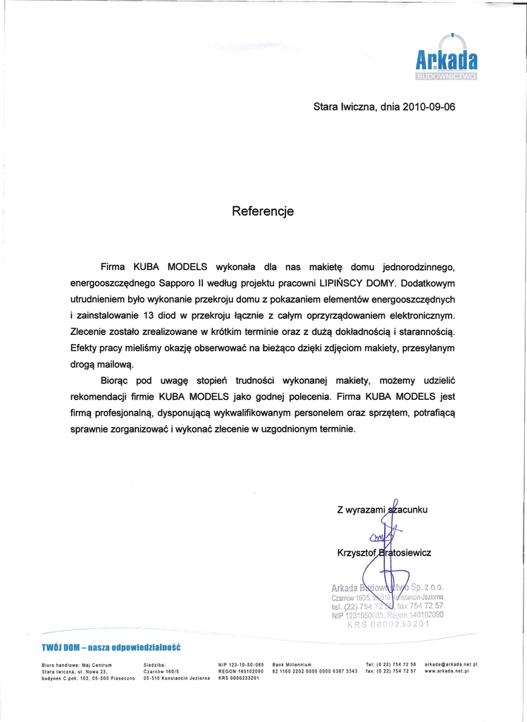 Aekada Stara lwiczna, dnia 2010-09-06 Referencje Firma KUBA MODELS wykonała dla nas makietę domu jednorodzinnego, energooszczędnego Sapporo II według projektu pracowni LIPIŃSCY DOMY, Dodatkowym utrudnieniem było wykonanie przekroju domu z pokazaniem elementów energooszczędnych i zainstalowanie 13 diod w przekroju łącznie z całym oprzyrządowaniem elektronicznym, Zlecenie zostało zrealizowane w krótkim terminie oraz z dużą dokładnością i starannością. Efekty pracy mieliśmy okazję obserwować na bieżąco dzięki zdjęciom makiety, przesyłanym drogą mailową. Biorąc pod uwagę stopień trudności wykonanej makiety, możemy udzielić rekomendacji firmie KUBA MODELS jako godnej polecenia. Firma KUBA MODELS jest firmą profesjonalną, dysponującą wykwalifikowanym personelem oraz sprzętem, potrafiącą sprawnie zorganizować i wykonać zlecenie w uzgodnionym terminie. ---- --- ---- TWOJ DOM - nasza odpowiedzialność Siedziba: Czarnów 160/5 Biuro handlowe: Maj Centrum Stara lwiczna, ul. Nowa 23, budynek C pak. 102,05-500 Piaseczno 05-510 Konstancin Jeziorna ------ NIP 123-10-50-085 Bank Millennium Tel: (O 22) 754 72 56 [email protected] REGON 140102090 82116022020000000063873343 lax: (O 22) 754 12 57 www.arkada.net.pl KRS 0000233201