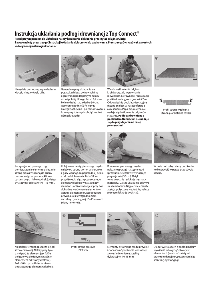 Instrukcja układania podłogi drewnianej z Top Connect® Przed przystąpieniem do układania należy koniecznie dokładnie przeczytać całą instrukcję! Zawsze należy przestrzegać instrukcji układania dołączonej do opakowania. Przestrzegać wskazówek zawartych w dołączonej instrukcji układania! Narzędzia pomocne przy układaniu: Klocek, kliny, ołówek, piła. Zaczynając od prawego rogu pomieszczenia elementy układa się stroną pióra zwróconą do ściany oraz mocując za pomocą klinów dystansowych lub rozpórek (odstęp dylatacyjny od ściany 10 – 15 mm). Na końcu element opuszcza się od strony czołowej. Należy przy tym pamiętać, że element jest ściśle połączony z ułożonym wcześniej elementem od strony czołowej. Po krótkim przyciśnięciu ukosu poprzecznego element wskakuje. Generalnie przy układaniu na posadzkach bezspoinowych i na ogrzewaniu podłogowym należy rozłożyć folię PE o grubości 0,2 mm. Folię układać na zakładkę 30 cm. Następnie podnieść folię przy krawędziach ścian i po zamontowaniu listew przyściennych obciąć wzdłuż górnej krawędzi. W celu wytłumienia odgłosu kroków oraz do wyrównania niewielkich nierówności rozkłada się podkład izolacyjny o grubości 2 m. Odpowiednie podkłady izolacyjne można znaleźć w naszej ofercie z akcesoriami. Papa bitumiczna nie nadaje się do tłumienia odgłosów stąpania. Podłoga drewniana z podkładem tłumiącym nie nadaje się do przyklejania na całej powierzchni. Kolejne elementy pierwszego rzędu należy od strony górnej w kierunku z góry wcisnąć do poprzedniej deski, aż do zablokowania. Po krótkim przyciśnięciu złącza poprzecznego element wskakuje w sąsiadujący element. Bardzo ważne jest przy tym dokładne wyrównanie elementów. Ostatni element pierwszego rzędu przycina się z uwzględnieniem szczeliny dylatacyjnej 10–15 mm od ściany i montuje. Końcówką pierwszego rzędu należy rozpocząć następny rząd (przesunięcie czołowe wynoszące przynajmniej 50 cm). Dzięki temu znacznie redukuje się straty materiału. Dalsze układanie odbywa się elementami. Najpierw elementy zostają połączone wzdłużnie, należy przy tym lekko je docisnąć. Profil strona czołowa Blokada Elementy ostatniego rzędu przyciąć i dopasować po stronie wzdłużnej z uwzględnieniem szczeliny dylatacyjnej 10-15 mm. Profil strona wzdłużna Strona pióra/strona rowka W razie potrzeby należy pod koniec lekko przybić warstwę przy użyciu klocka. Dla rur wystających z podłogi należy wywiercić lub wyciąć otwory w elementach (wielkość zależy od przekroju danej rury; uwzględniając szczelinę dylatacyjną). W celu zachowania szczeliny dylatacyjnej w otworach drzwiowych zawsze należy stosować odpowiedni profil. Obowiązuje to także wtedy, gdy w sąsiednim pomieszczeniu będzie układana taka sama podłoga. W takim przypadku należy zastosować odpowiedni profil przejściowy dla zachowania szczeliny dylatacyjnej. W szynie należy zachować szczelinę dylatacyjną 5 mm. Ościeżnica drzwiowa musi zostać przycięta drobną piłą na grubość panelu podłogowego, aby zapewnić podłodze drewnianej możliwość dylatacji. Po ułożeniu koniecznie usunąć kliny dystansowe. Listwy przyścienne (montowane bez lub z systemem zatrzasków) przymocowaćdo ściany – gotowe. Odblokowywanie Top Connect: Elementy można równolegle rozsunąć względem siebie. Wskazówki ogólne Przed przystąpieniem do układania należy koniecznie dokładnie przeczytać całą instrukcję! Czynności przed przystąpieniem do układania parkietu: Paczki można otwierać dopiero bezpośrednio przed przystąpieniem do układania. W miesiącach zimowych panele w zamkniętym, oryginalnym opakowaniu należy przystosować do temperatury układania ok. 18 °C. Ważne: Przed przystąpieniem do układania parkietu sprawdzić elementy w świetle dziennym z uwagi na widoczne wady lub uszkodzenia oraz kolor i strukturę. W celu uzyskania równomiernego obrazu na ułożonej powierzchni zaleca się jednoczesne układanie z kilku paczek. Po ułożeniu roszczenia reklamacyjne tego typu są wykluczone. Elastyczne i tekstylne okładziny muszą zostać całkowicie usunięte. Kierunek układania: Kierunek układania jest najczęściej orientowany względem głównego źródła światła w pomieszczeniu, np. okno tarasowe. Elementy należy układać wzdłużnie do kierunku padania światła. Proporcje pomieszczenia można podkreślić przez zręczny wybór kierunku układania. Małe pomieszczenia wydają się większe w wyniku zastosowania jasnych gatunków drewna. W przypadku układania bez przyklejania do podłoża długość lub szerokość układanej podłogi nie powinna przekraczać 10 m. W pomieszczeniach o długości lub szerokości przekraczającej 10 m należy zamontować profile dylatacyjne. -W wąskich korytarzach należy zawsze układać w kierunku wzdłużnym. -W przypadku pomieszczeń w kształcie litery T, L lub U za pomocą odpowiednich profili należy podzielić podłogę na pojedyncze powierzchnie stosownie do kształtu pomieszczenia. W pomieszczeniach przemysłowych i publicznych zalecamy przyklejanie parkietu na całej powierzchni. Specjalną instrukcję układania z przyklejaniem na całej powierzchni można otrzymać u naszego przedstawiciela. Podłoga drewniana z podkładem tłumiącym nie nadaje się do przyklejania na całej powierzchni. Przygotowanie podłoża: Podłoże musi być równe, suche i stabilne. Przestrzegać odpowiedniej normy DIN. Odpowiednie są np. posadzka cementowa, asfalt lany, płyty wiórowe V100, starsze okładziny podłogowe, jak np. okładziny ceramiczne i z włókniny igłowanej. Sprawdzenie wilgotności: Podłoże należy fachowo sprawdzić pod względem gotowości do układania przy pomocy odpowiedniego przyrządu pomiarowego CM. Wartość graniczna wilgotności bez ogrzewania podłogowego: Cement, warstwa cementu ≤ 2,0 CM (masa) %; siarczan wapni