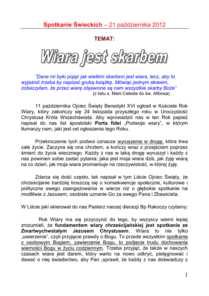 Spotkanie Świeckich – 21 października 2012 TEMAT: ”Dane mi było pojąć jak wielkim skarbem jest wiara, lecz, aby to wyjaśnić trzeba by napisać grubą książkę. Mówiąc jednym słowem, zobaczyłam, że przez wiarę objawione są nam wszystkie skarby Boże” (z listu s. Marii Celeste do św. Alfonsa). 11 października Ojciec Święty Benedykt XVI ogłosił w Kościele Rok Wiary, który zakończy się 24 listopada przyszłego roku w Uroczystość Chrystusa Króla Wszechświata. Aby wprowadzić nas w ten Rok papież napisał do nas list apostolski Porta fidei „Podwoje wiary”, w którym tłumaczy nam, jaki jest cel ogłoszenia tego Roku. Przekroczenie tych podwoi oznacza wyruszenie w drogę, która trwa całe życie. Zaczyna się ona chrztem, a kończy wraz z przejściem poprzez śmierć do życia wiecznego. Każdy z nas w taką drogę wyruszył i każdy z nas powinien sobie zadać pytania: jaka jest moja wiara dziś, jak żyję wiarą na co dzień, jak moja wiara promieniuje na rzeczywistość, w której żyję. Zdarza się dość często, tak napisał w tym Liście Ojciec Święty, że chrześcijanie bardziej troszczą się o konsekwencje społeczne, kulturowe i polityczne swego zaangażowania w wierze niż o głębokie spotkanie na modlitwie z Jezusem, osobiste uznanie Go za swego Pana i Zbawiciela. W Liście jaki skierował do nas Pasterz naszej diecezji Bp Rakoczy czytamy: Rok Wiary ma się przyczynić do tego, by wszyscy wierni lepiej zrozumieli, że fundamentem wiary chrześcijańskiej jest spotkanie ze Zmartwychwstałym Jezusem Chrystusem. Wiara to nie tylko „uwierzenie”, czyli przyjęcie prawdy o Bogu. To przede wszystkim spotkanie z osobowym Bogiem, zawierzenie Bogu, to podjęcie trudu dochowania wierności Bogu w życiu codziennym. Trzeba przyjąć, że także w naszych czasach wiara jest darem, który warto na nowo odkryć, pielęgnować i dawać o niej świadectwo, aby Pan „sprawił, że każdy z nas doświadczy z 1 radością, jak pięknie jest być chrześcijaninem” i jak wielkim skarbem jest wiara. Maria Celeste w swoich pismach bardzo często mówi o wierze, używa też różnych porównań, określeń wiary, ale przede wszystkim sama w swoim życiu pokazuje nam jak przeżywała wiarę, widać to szczególnie pośród przeciwności, których jak wiemy nie brakowało w jej historii. Zacznijmy od etapu pierwszego w życiu wiary od Chrztu św. Zbliża się dzień urodzin Matki Celeste – 31 października. Wkrótce będziemy świętować kolejną rocznicę jej przyjścia na świat. Pierwszego listopada 1696 roku została ochrzczona. Po latach wspomina ten moment jako nadzwyczajne wydarzenie – „wzniosłe i wielkie” Wiara otrzymana na Chrzcie świętym „Rozważaj miłość moją do ciebie: powołałem cię do życia w łasce...(mówi Pan do Marii Celeste). Tutaj wlałem w ciebie wiarę, w której na nowo zostałaś stworzona: jest to stworzenie mistyczne, wzniosłe i wielkie - nigdy nie pojęłaś dostatecznie godności, do której cię wiara wyniosła. Wiedz, że właśnie przez wiarę twoja dusza łączy się z moją Boskością.” Wiara łączy nas z Bogiem, przez wiarę poślubiamy Go i stajemy się Jego dziećmi. „Chrzest jest najpiękniejszym i najwspanialszym darem Boga... Nazywamy go darem, łaską, namaszczeniem, oświeceniem, szatą niezniszczalności, obmyciem odradzającym, pieczęcią i wszystkim, co może być najcenniejsze. Darem – ponieważ jest udzielany tym, którzy nic nie przynoszą; łaską – ponieważ jest dawany nawet tym, którzy zawinili; chrztem – ponieważ grzech zostaje pogrzebany w wodzie; namaszczeniem – ponieważ jest święty i królewski (a królów się namaszcza); oświeceniem – ponieważ jest jaśniejącym światłem; szatą – ponieważ zakrywa nasz wstyd; obmyciem – ponieważ oczyszcza; pieczęcią – ponieważ strzeże nas i jest znakiem panowania Boga” (św. Grzegorz z Nazjanzu). 2 Dzięki przyjęciu tego Sakramentu stajemy się nowym stworzeniem, a Maria Celeste napisze: stworzeniem mistycznym, ponieważ uzdalnia nas ten sakrament do życia w łasce... Dziękujemy Ci, Mario Celeste za to przypomnienie; za podkreślenie wagi Chrztu świętego w naszym życiu wiary. W nim przyoblekamy się w Chrystusa i stajemy się Nim samym. Stajemy się stworzeniami zdolnymi do najgłębszej relacji ze Stworzycielem. W Roku Wiary będzie możliwość uzyskania odpustu, między innymi będzie go można uzyskać nawiedzając miejsca własnego chrztu i odnawiając przyrzeczenia chrzcielne. Myślę, że to dla nas cenna wiadomość. Zapytajmy się więc siebie samych: czy pamiętam i świętuję dzień mojego Chrztu Świętego? Czy mam świadomość, jaką godnością obdarzył mnie Bóg w tym sakramencie i jak bardzo jestem uprzywilejowany? W Katechizmie Kościoła Katolickiego czytamy: Chrzest jest sakramentem wiary... Wiara wymagana do chrztu nie jest wiarą doskonałą i dojrzałą, ale zaczątkiem, który ma się rozwijać. Zadać katechumenowi pytanie: «Czy chcesz przyjąć chrzest?» znaczy zapytać go zarazem: «Czy chcesz zostać świętym?». (Jan Paweł II NMI) Wiara jest światłem „Tam, gdzie nie ma wiary nie ma światła. Nie widzi się tego, co wieczne, bo ziemia oślepia. Wyrzekaj się nieustannie tego, co zmysłowe, widzialne, poznawalne, by w każdej chwili wpatrywać się w Jezusa. Wtedy wiara nie będzie ciemnością, lecz lśniącą drogą prowadzącą do nieba”(Maria Celeste, Rozmowy z Jezusem). Jezus mówi do Marii Celeste, że Jego Ojciec postawił Go w świecie, aby był światłem ludzi i objawił im odwieczne prawdy wiary. Dlatego Jezus powiedział w Ewangelii, że jest Światłością świata i nikt nie przychodzi do Ojca inaczej jak tylko przez Niego. Ziemia może oślepić, pokusy mogą sprowadzić człowieka na manowce, ludzka słabość wypacza prostotę spojrzenia, odziera je z 3 nadprzyrodzoności. Wtedy wiara nie pociąga, nie jest już światłem, nie przynosi radoś