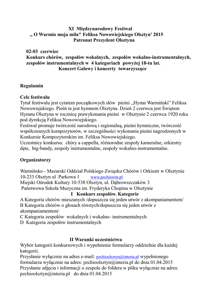 XI Międzynarodowy Festiwal ,, O Warmio moja miła" Feliksa Nowowiejskiego Olsztyn' 2015 Patronat Prezydent Olsztyna 02-03 czerwiec Konkurs chórów, zespołów wokalnych, zespołów wokalno-instrumentalnych, zespołów instrumentalnych w 4 kategoriach powyżej 18-tu lat. Koncert Galowy i koncerty towarzyszące Regulamin Cele festiwalu Tytuł festiwalu jest cytatem początkowych słów pieśni ,,Hymn Warmiński” Feliksa Nowowiejskiego. Pieśń ta jest hymnem Olsztyna. Dzień 2 czerwca jest Świętem Hymnu Olsztyna w rocznicę prawykonania pieśni w Olsztynie 2 czerwca 1920 roku pod dyrekcją Feliksa Nowowiejskiego. Festiwal promuje twórczość narodową i regionalną, pieśni hymniczne, twórczość współczesnych kompozytorów, w szczególności wykonania pieśni nagrodzonych w Konkursie Kompozytorskim im. Feliksa Nowowiejskiego. Uczestnicy konkursu: chóry a cappella, różnorodne zespoły kameralne, orkiestry dęte, big-bandy, zespoły instrumentalne, zespoły wokalno-instrumentalne. Organizatorzy Warmińsko - Mazurski Oddział Polskiego Związku Chórów i Orkiestr w Olsztynie 10-233 Olsztyn ul .Parkowa 1 www.pzchiowm.pl Miejski Ośrodek Kultury 10-538 Olsztyn, ul. Dąbrowszczaków 3 Państwowa Szkoła Muzyczna im. Fryderyka Chopina w Olsztynie I Konkurs zespołów. Kategorie A Kategoria chórów mieszanych /dopuszcza się jeden utwór z akompaniamentem/ B Kategoria chórów o głosach równych/dopuszcza się jeden utwór z akompaniamentem/ C Kategoria zespołów wokalnych i wokalno- instrumentalnych D Kategoria zespołów instrumentalnych II Warunki uczestnictwa Wybór kategorii konkursowych i wypełnienie formularzy oddzielnie dla każdej kategorii. Przysłanie wyłącznie na adres e-mail: [email protected] wypełnionego formularza wyłącznie na adres: [email protected] do dnia 01.04.2015 Przysłanie zdjęcia i informacji o zespole do foldera w pliku wyłącznie na adres: [email protected] do dnia 01.04.2015 Przysłanie wpłaty rejestracyjnej. Opłata 1 kategorii 200 PLN, 50 EURO do dnia 01.04.2015 na konto nr 11 8857 0002 3014 0187 2124 0001 Warmińsko - Mazurski Oddział Polskiego Związku Chórów i Orkiestr 10-233 Olsztyn ul. Parkowa 1 tytuł wpłaty „rejestracja na XI festiwal” Zdobywcy Grand Prix mogą brać ponownie udział w konkursie po upływie 2 lat. Konkurs zespołów odbędzie się 3 czerwca. W dniach 2- 3 czerwca odbędą się koncerty w plenerze , w salach koncertowych i w kościołach. III Kryteria konkursowe Czas trwania prezentacji konkursowej: minimum 10 minut, maximum 20 minut. Pieśń obowiązkowa ,, Hymn Warmiński” Feliksa Nowowiejskiego ( nuty na stronie www.pzchiowm.pl) - utwory dowolne, w tym pieśni nagrodzone w Konkursie Kompozytorskim im. Feliksa Nowowiejskiego ( nuty na stronie www.pzchiowm.pl) Kryteria punktowane: intonacja, dobór repertuaru, technika wokalna, instrumentalna, oryginalność interpretacji i wykonania, ogólny wyraz artystyczny. Suma punktacji max 100 pkt. IV Ocena Komisja Konkursowa powołana przez Zarząd Warmińsko-Mazurskiego Oddziału Polskiego Związku Chórów i Orkiestr dokonuje oceny i przyznaje nagrody w konkursie zespołów. Decyzja Komisji Konkursowej jest ostateczna i niepodważalna. V Nagrody konkursowe Grand Prix Prezydenta Olsztyna. Dyplom. Statuetka i Nagroda 3000 PLN. Złoty Dyplom i Nagroda Specjalna 1000 zł za najlepsze wykonanie pieśni „ Hymn Warmiński” Feliksa Nowowiejskiego, wersja wokalna, nuty dostępne na stronie www.pzchiowm.pl Złoty Dyplom i Nagroda Specjalna 1000 zł za wykonanie pieśni z Konkursu Kompozytorskiego im. Feliksa Nowowiejskiego , wykaz nut na stronie www.pzchiowm.pl Złoty Dyplom i Nagroda Specjalna 1000 zł za najlepszą aranżację i wykonanie pieśni „ Hymn Warmiński” Feliksa Nowowiejskiego w wersji instrumentalnej. Dyplomy w kategoriach A,B,C,D : Złote 91-100 pkt, Srebrne 81-90 pkt , Brązowe 71-80 pkt Dyplomy za udział : 50-70 pkt. Puchary, nagrody rzeczowe ufundowane przez sponsorów za debiut, prawykonanie. VI Sprawy organizacyjne Zespoły zgłoszone do konkursu przyjeżdżają na własny koszt. Zespoły występują z własnymi instrumentami. Opiekę wychowawczą nad uczestnikami zespołów dziecięcych i młodzieżowych zapewniają instytucje delegujące. Organizator nie ponosi odpowiedzialności za mienie i wypadki losowe uczestników. Opłata rekrutacyjna nie podlega zwrotom. Dane w karcie zgłoszenia należy wypełniać wg podanego wzoru, bez skrótów w imionach i nazwiskach. Plik ze zdjęciem i tekst o zespole nie przysłany w terminie nie będzie zamieszczony w folderze. VII Ustalenia końcowe Organizatorzy Festiwalu zastrzegają sobie prawo do fotografowania, nagrywania, filmowania i publikowania informacji tylko osobom upoważnionym. Zapraszamy – Organizatorzy! Formularz zgłoszenia do udziału w konkursie przesłać do dnia 1.04.2015 XI Międzynarodowy Festiwal ,, O Warmio moja miła" Feliksa Nowowiejskiego Olsztyn 02.06 - 03. 06. 2015. Nazwa własna i rodzaj zespołu / mieszany, żeński, męski big-band, orkiestra dęta, wokalny, wokalno-instrumentalny, itp./ Uczestnicy dorośli powyżej 18 lat. ….................................................................................................................................... Kategoria konkursowa ….........../ A, B, C, D/ Imię i nazwisko dyrygenta.............................. e-mail...... tel. Adres siedziby zespołu …........................... Adres strony internetowej .......................... Osoby do kontaktu Imię i nazwisko ….................................................... e-mail ............................................. tel. ................................ Prawykonanie. Debiut ( wpisać jeśli dotyczy) ….................................................................................................. Rejestracja. Wpłata rejestracyjna za jedną kategorię 200 PLN lub 50 EURO do dnia 01.04.2015 na konto nr 11 8857 0002 3014 0187 2124 0001 Warmińsko - Mazurski Oddzia