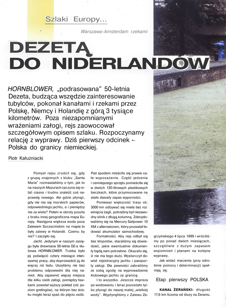 Szlaki Europy... Warszawa-Amsterdam rzekami DEZETĄ DO NIDERLANDÓW HORNBLOWER, „podrasowana" 50-letnia Dezeta, budząca wszędzie zainteresowanie tubylców, pokonał kanałami i rzekami przez Polskę, Niemcy i Holandię z górą 3 tysiące kilometrów. Poza niezapomnianymi wrażeniami załogi, rejs zaowocował szczegółowym opisem szlaku. Rozpoczynamy relację z wyprawy. Dziś pierwszy odcinek Polska do granicy niemieckiej. Piotr Kałużniacki Pomysł rejsu zrodził się, gdy z grupą znajomych z klubu „Santa Maria" rozmawialiśmy o tym, jak to na naszych Mazurach zaczyna się robić ciasno i trudno znaleźć coś naprawdę nowego. Ale gdzie płynąć, gdy nie ma się morskich papierów, odpowiedniego jachtu, a i pieniędzy nie za wiele? Potem w obroty poszła z braku innej geograficzna mapa Europy. Następna większa woda poza Zalewem Szczecińskim na rnapie to były zalewy w Holandii. Czemu by nie? l zaczęło się. Jacht. Jedynym w naszym zasięgu była drewniana 50-letnia DZ-a klubowa HORNBLOWER. Trzeba było jej poświęcić cztery miesiące intensywnej pracy, aby doprowadzić ją do więcej niż ładu. Uszyliśmy nie bez problemu odpowiedni dla niej namiot. Aby zapewnić więcej miejsca dla kilku osób załogi, pomiędzy ławkami powstał wyższy pokład (niż poziom gretingów), na którym bez ścisku mogło teraz spać do pięciu osób. Pod spodem mieściło się prawie całe wyposażenie. Część jedzenia i cenniejszego sprzętu pomieściła się w dwóch 120-litrowych plastikowych beczkach, które przymocowane na stałe dawały zapas wyporności. Ponieważ większość trasy ok. 3000 km odbywać się miała bez roz winięcia żagli, potrzebny był niezawodny silnik z długą kolumną. Zdecydowaliśmy się na Mercury Sailpower 10 KM z alternatorem, który pozwalał ładować akumulator samochodowy. Formalności. Aby rejs odbył się bez kłopotów, staraliśmy się dowiedzieć, jakie ewentualnie dokumenty będą nam potrzebne. Okazało się, iż nie ma tego dużo. Wystarczył dowód rejestracyjny jachtu i paszporty załogi. Dla pewności zabraliśmy ze sobą zgodę na wyprowadzenie klubowego jachtu za granicę. l to wszystko. Jeszcze impreza po wodowaniu i teraz pozostało tylko płynąć do naszej małej „wielkiej wody". Wypłynęliśmy z Zalewu Ze- grzyńskiego 4 lipca 1999 i wróciliśmy po ponad dwóch miesiącach, s z c z ę ś l i w i e z dużym zapasem wspomnień i planami na kolejne wyprawy. Jak widać marzenia (przy odrobinie pomocy i determinacji) spełniają się. Etap pierwszy POLSKA KANAŁ ŻERAŃSKI: długość 17,6 km liczona od śluzy na Żeraniu. Śluza na Kanale Bydgoskim Łączy Zalew Zegrzyński, skąd wypływamy, z Wisłą na wysokości elektrociepłowni. Na drodze kanału znajdują się liczne mosty o prześwicie min. 4 m, w pobliżu 9 i 11 km nieoznakowane mielizny (0,5 m). Możliwość postoju przed śluzą żerańską, po lewej stronie w zakolu przy przystani wioślarskiej AZS. Stacja benzynowa w odległości 1 km drogą na północ przy ul. Jagiellońskiej. Śluza czynna jest codziennie od 7.00-19.00, oplata poniedziałek-pią- tek: 4,60 zł, inne dni i święta 9,20 zt, dla uczniowi studentów zniżka 50%. Za śluzą zaraz po wypłynięciu na Wisłę można zatrzymać się w tak zwanym zimowisku. Jest to głęboka zatoka poza zasięgiem prądu, jednak nie ma tu żadnej infrastruktury - za pozwoleniem korzystamy z wody przy budynkach śluzy. WISŁA: Km 521 - ujście Kanału Żerańskiego. W lewo pod prąd niespełna 10 km do centrum Warszawy. W oddali widać most im. Grota-Roweckiego. My kierujemy się w prawo. Jeszcze przez 5-7 km na lewym brzegu widać budynki Żoliborza, na prawym os. Tarchomin. Zanieczyszczenie wody jest tu tak duże, iż przy 30-stopniowym upale trudno oddychać, poprawa następuje dopiero w okolicy Modlina. Zaraz za Warszawą rzeka zaczyna tworzyć wiele wysp, szlak oznaczony dobrze (głównie bakeny, ale także tyki), W niektórych śluzach kanału różnica poziomów wody sięga 12 m Ceglane mosty kolejowe na Brdzie w Bydgoszczy. Choć zaniedbane, przypominają czasy świetności Kanału Bydgoskiegc jednakże przed Nowym Dworem, aż do Wyszogrodu prawie w ogóle bądź błędnie. Niezbędne jest uważne śledzenie powierzchni wody, zwłaszcza przy niskim stanie. Km (554) - ujście Bugo-Narwi. Szczególnie należy uważać na odcinku od pierwszego niebieskiego mostu drogowego w- okolicy Nowego Dworu przez około 5 km ze względu na liczne łachy i wąskie spławne koryta. Tuż przed dopływem na prawym brzegu twierdza Modlin, a dokładnie ruiny jednej z jej części. Tu kręcono część zdjęć do filmu A. Wajdy „Pan Tadeusz". Jeżeli chcemy pozwiedzać, dobrze stanąć przed ruinami na p.b. lub w dopływie Wisły. Km 557 - p.b. Zakroczym Km579-p.b. Czerwińsk n. Wisłą. Znajduje się tu zespół kościelny dawnego opactwa z XII w. Brak przystani, przy piaszczystym brzegu jest jednak dosyć głęboko, aby do niego dobić, nawet przy niskim stanie wody. Rynek w odległości 50 m, jest tu kilka sklepów. W wodę najlepiej zaopatrzyć się u strażaków, którzy mają własną studnię głębinową. Km 586,7 - w tym miejscu znajdował się działający jeszcze przed rokiem most wyszogrodzki, najdłuższy (1,5 km, 57 przęseł) drewniany most w Europie. Teraz pozostało po nim tylko główne stalowe przęsło. Km 587,8 - nowy żelbetowy most. Zadziwia swoimi rozmiarami nawet jak na wiślany - ponad 1,5 km długości, około 20 m wysokości. Pomiędzy mostami siedziba Nadzoru Wodnego. Od tej pory do Płocka zaczynamy slalom między licznymi kępami i mieliznami, jakie tworzy tu rzeka. Malownicze rozległe wyspy są dogodnym miejscem na nocleg czy biwak. Km 633,5 - Płock, p.b. przystań klubu ż-eglarskiego „Morka", obchodzącego ostatnio XXXV-lecie. Dogodne miejsce na dłuższy postój. Ceny dosyć przystępne: 1 zł dobicie, 2 zł+0,50 zł/osoba/doba, prysznic 5 zł, toalety w cenie. Obok portu bar piwno-przekąskowy.