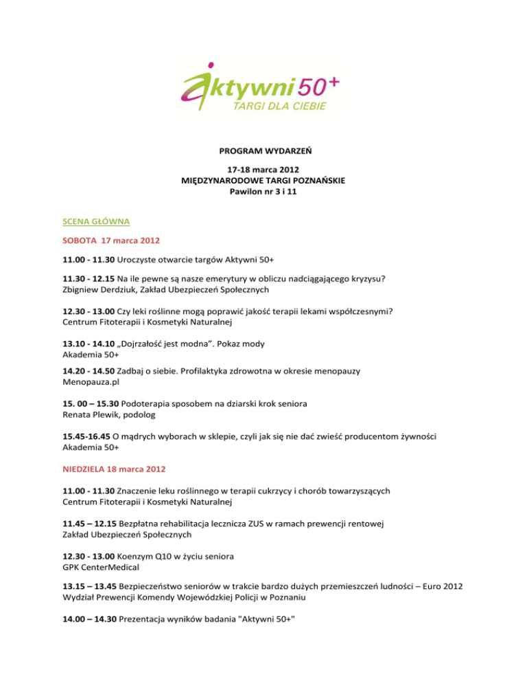 PROGRAM WYDARZEŃ 17-18 marca 2012 MIĘDZYNARODOWE TARGI POZNAŃSKIE Pawilon nr 3 i 11 SCENA GŁÓWNA SOBOTA 17 marca 2012 11.00 - 11.30 Uroczyste otwarcie targów Aktywni 50+ 11.30 - 12.15 Na ile pewne są nasze emerytury w obliczu nadciągającego kryzysu? Zbigniew Derdziuk, Zakład Ubezpieczeń Społecznych 12.30 - 13.00 Czy leki roślinne mogą poprawić jakość terapii lekami współczesnymi? Centrum Fitoterapii i Kosmetyki Naturalnej 13.10 - 14.10 „Dojrzałość jest modna”. Pokaz mody Akademia 50+ 14.20 - 14.50 Zadbaj o siebie. Profilaktyka zdrowotna w okresie menopauzy Menopauza.pl 15. 00 – 15.30 Podoterapia sposobem na dziarski krok seniora Renata Plewik, podolog 15.45-16.45 O mądrych wyborach w sklepie, czyli jak się nie dać zwieść producentom żywności Akademia 50+ NIEDZIELA 18 marca 2012 11.00 - 11.30 Znaczenie leku roślinnego w terapii cukrzycy i chorób towarzyszących Centrum Fitoterapii i Kosmetyki Naturalnej 11.45 – 12.15 Bezpłatna rehabilitacja lecznicza ZUS w ramach prewencji rentowej Zakład Ubezpieczeń Społecznych 12.30 - 13.00 Koenzym Q10 w życiu seniora GPK CenterMedical 13.15 – 13.45 Bezpieczeństwo seniorów w trakcie bardzo dużych przemieszczeń ludności – Euro 2012 Wydział Prewencji Komendy Wojewódzkiej Policji w Poznaniu 14.00 – 14.30 Prezentacja wyników badania "Aktywni 50+" Obserwatorium Integracji Społecznej, Regionalny Ośrodek Polityki Społecznej w Poznaniu 14.45 – 15.15 Dlaczego należy bać się osteoporozy? Stowarzyszenie Osób Po Endoprotezoplastyce Biodra „Bioderko” 15.30 – 16.00 Klienci wymagający szczególnej opieki w gabinecie podologicznym Renata Plewik, podolog SPORT SOBOTA 17 marca 2012 11.45 - 12.30 Samoobrona 50+ Akademia 50+/Akademia Sztuk Walki 12.45 - 13.40 Elementy formy tai chi dla osób 50+ Poznańskie Stowarzyszenie Tai Chi 13.55 - 14.50 Nordic Walking Marsz po Zdrowie 15. 00 - 16.00 „Dodać życia do lat”. Tańce integracyjne w kręgu Polskie Stowarzyszenie Pedagogów i Animatorów KLANZA Oddział w Poznaniu 16.10 - 16.40 Pokaz tańca narodowego i regionalnego oraz nauka kroków Stowarzyszenie Kulturalne „Trzeciego Wieku” NIEDZIELA 18 marca 2012 10.30 - 11.45 Elementy formy tai chi dla osób 50+ Poznańskie Stowarzyszenie Tai Chi 12.00 - 13.20 „Dodać życia do lat”. Tańce integracyjne w kręgu Polskie Stowarzyszenie Pedagogów i Animatorów KLANZA Oddział w Poznaniu 13.55 - 14.40 Nordic Walking Polskie Stowarzyszenie Nordic Walking 14.50 - 15.20 Gimnastyka grupowa 50+ Dom Pomocy Społecznej ul. Ugory 15.30 – 16.30 Warsztaty tańców regionalnych Dom Dziennego Pobytu Zgromadzenia Sióstr Franciszkanek Rodziny Maryi w Szamotułach SCENA NORDIC WALKING Organizator Marsz po Zdrowie i Polskie Stowarzyszenie NORDIC WALKING SOBOTA 17 marca 2012 11.45 Nordic walking a trekking. Wędrówki po nizinach czy górach, czyli jakie wybrać kije? 12.45 Wpływ treningu nordic walking na bóle w dolnym odcinku kręgosłupa i wydolność krążeniowooddechową 13.45 Nordic walking, czyli sposób na zrzucenie kilku kilogramów 14.45 Nordic walking a rywalizacja. O Międzynarodowych Mistrzostwach Polski NW 15.45 Wpływ treningu nordic walking na procesy starzenia się człowieka Po każdej prelekcji darmowe szkolenie z instruktorami NIEDZIELA 18 marca 2012 10.30 Wpływ treningu nordic walking na procesy starzenia się człowieka 11.30 Nordic walking a rywalizacja. O Międzynarodowych Mistrzostwach Polski NW 12.30 Nordic walking, czyli sposób na zrzucenie kilku kilogramów 13.30 Wpływ treningu nordic walking na bóle w dolnym odcinku kręgosłupa i wydolność krążeniowooddechową 14.30 Nordic walking a trekking. Wędrówki po nizinach czy górach, czyli jakie wybrać kije? 15.30 Nordic walking – porady treningowe u instruktorów i fizjoterapeutów Po każdej prelekcji darmowe szkolenie z instruktorami SPEED BADMINTON PARK SOBOTA 17 marca 2012 10.00 - 17.00 Speedminton® Show Prezentacja sprzętu do gry, pokazy gry, konkurs „Zagraj z nami” 11.00 - 16.00 Akademia Speedbadminton.pl – pokazy gry, bezpłatna nauka 11.00 – 15.30 XVII Speedminton® Cup PL NIEDZIELA 18 marca 2012 10.00 - 17.00 Speedminton® Show Prezentacja sprzętu do gry, pokazy gry, konkurs „Zagraj z nami” 11.00 - 16.00 Akademia Speedbadminton.pl – pokazy gry, bezpłatna nauka 11.00 - 15.30 AKTYWNI 50+ Speedminton® Cup WARSZTATY. SALA 1. SOBOTA 17 marca 2012 11.45 - 13.00 Warsztat filcowania „Wiosna, ach to ty!” Fundacja „Pozytywna” 13.15 - 14.30 Zdobienie techniką decoupage Stowarzyszenie Klub Nauczycieli Miasta Poznania 14.45 - 16.00 Wolontariat 50+ Centrum Inicjatyw Senioralnych NIEDZIELA 18 marca 2012 10.30 - 11.00 Kwiaty cięte i rośliny w naszym domu Stowarzyszenie mali bracia Ubogich 11.15 - 12.15 Malowanie wielkanocnych odlewów gipsowych Dom Pomocy Społecznej ul. Ugory 12.30 - 13.45 Szkolenie „Naprawmy To!” Projekt: Polska Osoby chętne do udziału w szkoleniu prosimy o wcześniejszą rezerwację miejsca, tel. 662 622 414 lub [email protected] 14.15 - 15.15 „Dbaj o siebie – wykonaj cytologię”. Warsztat profilaktyczny Stowarzyszenie Kobiet z Problemami Onkologiczno-Ginekologicznymi „Magnolia” /Szamocin 15.30 – 16.45 Warsztat technik krawieckich i rękodzielniczych Stowarzyszenie Szkoła „Barki” WARSZTATY. SALA 2 SOBOTA 17 marca 2012 11.45 - 12.45 Czas wolny a sztuka wypoczynku Kolegium Pracowników Służb Społecznych 13.00 - 14.15 Co jeść aby żyć zdrowo i długo? Fundacja „Światło” 14.30 - 15.20 Warsztaty śmiechoterapii – sesja śmiechu Fundacja „Dr Clown” 15.35 -16.45 Odkryj swoje piękno. Jak wygląd wpływa na samopoczucie Fundacja „Światło” NIEDZIELA 18 marca 2012 10.30 - 11.45 „Wychodź z pieczary nie czuj się stary” Stowarzyszenie Wielkopolskich Doradców Kariery „WiDoK” 12.00 - 13.30 Warsztat „Jak cię widzą tak cię piszą?” Stowarzyszenie Wzajemnej Pomocy „Flandria” 13.45 - 15.00 Warsztaty zapamiętywania dla osób 50+ Usłu