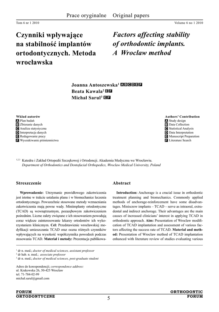 Prace oryginalne Original papers Tom 6 nr 1 2010 Volume 6 no 1 2010 Factors affecting stability of orthodontic implants. A Wroclaw method Czynniki wpływające na stabilność implantów ortodontycznych. Metoda wrocławska Joanna Antoszewska 1 Beata Kawala2 E F Michał Sarul 3 E F A B C D E F Wkład autorów – Plan badań A – Zbieranie danych B – Analiza statystyczna C – Interpretacja danych D E– Redagowanie pracy F– Wyszukiwanie piśmiennictwa Authors’ Contribution – Study design A – Data Collection B – Statistical Analysis C – Data Interpretation D E– Manuscript Preparation F– Literature Search Katedra i Zakład Ortopedii Szczękowej i Ortodoncji. Akademia Medyczna we Wrocławiu. Department of Orthodontics and Dentofacial Orthopedics, Wroclaw Medical University, Poland 1,2,3 Streszczenie Abstract Wprowadzenie: Utrzymanie prawidłowego zakotwiczenia jest istotne w trakcie ustalaniu planu i w biomechanice leczenia ortodontycznego. Powszechnie stosowane metody wzmacniania zakotwiczenia mają pewne wady. Miniimplanty ortodontyczne (TCAD) są wewnątrzustnym, pozazębowym zakotwiczeniem pośrednim. Liczne zalety związane z ich stosowaniem powodują coraz większe zainteresowanie lekarzy ortodontów ich wykorzystaniem klinicznym. Cel: Przedstawienie wrocławskiej modyfikacji umieszczania TCAD oraz ocena różnych czynników wpływających na wysokość współczynnika powodzeń podczas stosowania TCAD. Materiał i metody: Prezentacja publikowa- Introduction: Anchorage is a crucial issue in orthodontic treatment planning and biomechanics. Commonly applied methods of anchorage-reinforcement have some disadvantages. Miniscrew implants – TCAD – serve as intraoral, extradental and indirect anchorage. Their advantages are the main causes of increased clinicians’ interest in applying TCAD in orthodontic approach. Aim: Presentation of Wroclaw modification of TCAD implantation and assessment of various factors affecting the success rate of TCAD. Material and method: Presentation of Wroclaw method of TCAD implantation enhanced with literature review of studies evaluating various dr n. med.; doctor of medical sciences, assistant professor dr hab. n. med.; associate professor 3 dr n. med.; doctor of medical sciences, post-graduate student 1 2 Adres do korespondencji; correspondence address: ul. Krakowska 26, 50-425 Wrocław tel. 71-784-02-99 [email protected] Forum Orthodontic Ortodontyczneforum 5 Prace oryginalne Original papers Tom 6 nr 1 2010 Volume 6 no 1 2010 nych wyników badań wrocławskiej modyfikacji umieszczania TCAD, wzbogacona o przegląd literatury dotyczący różnych aspektów stosowania TCAD, wpływających na wysokosc odsetka powodzeń. Poszukiwanie publikacji zostało przeprowadzone na podstawie bazy PubMed oraz uzupełnione o inne opracowania dotyczące problemu zakotwiczenia i zastosowania zakotwiczenia szkieletowego w terapii ortodontycznej. Wyniki: Wrocławska modyfikacja implantacji TCAD umożliwia uzyskanie 93% powodzeń. Modyfikacja ta, opracowana na podstawie doświadczeń własnych oraz publikowanych badań. pozwoliła wyłonić i skutecznie kontrolować następujące czynniki zwiększające prawdopodobieństwo powodzenia implantacji TCAD: sposób wykonania i dokładność procedury – nacięcie śluzówki i nachylenie nawiercanego kanału, oburęczność operatora, właściwy wybór regionu implantacji, długość i średnica TCAD, pośrednie poziome obciążenie TCAD i właściwa dbałość pacjenta o higienę jamy ustnej. Wnioski: Właściwe postępowanie i motywacja pacjenta mogą zwiększyć odsetek powodzeń implantacji do ponad 90%, czyniąc z TCAD wartościowe narzędzie wyraźnie poprawiające wyniki leczenia jak i zwiększające zakres możliwości terapeutycznych. (Forum Ortod. 2010; 6: 5 - 14). Nadesłano: 27.01.2010 Przyjęto do druku: 9.03.2010 aspects of TCAD application, affecting success rate of the implantation. The search was based on PubMed and completed with other publications concerning problem of anchorage and use of skeletal anchorage in orthodontic treatment. Results: Wroclaw modification of TCAD implantation enables to gain 93% success rate. This modification, developed on the basis of presented experience as well as on outcomes of published studies enabled establishing and efficient management of factors promoting success of TCAD insertion: manner and accuracy of procedure – stab incision and properly angulated pre-drilling, ambidextrousity of the operator, proper selection of implantation area, length and diameter of TCAD, indirect, horizontal TCAD loading and patient’s compliance of hygienic regime. Conclusions: Proper proceeding and patients’ motivation may enlarge the succes rate to more than 90% making TCAD valuable device apparently improving treatment results as well as enhancing possibilities of orthodontic treatment. (Orthod. Forum 2010; 6: 5 - 14). Received: 27.01.2010 Accepted: 9.03.2010 Key words: anchorage orthodontic implants procedure TCAD Słowa kluczowe: implanty ortodontyczne procedura TCAD zakotwiczenie Wstęp Introduction Utrzymanie prawidłowego zakotwiczenia jest istotnym problemem w ustalaniu planu leczenia ortodontycznego i jego biomechanice. Zakotwiczenie jest definiowane jako opór zębów na nieplanowane przesunięcie. Powszechnie stosowane metody wzmacniania zakotwiczenia mają pewne wady. Przeważnie nie eliminują w pełni niebezpieczeństwa niepożądanego przesunięcia zębów, powodują różne skutki uboczne, a skuteczność zakotwiczenia może być w znacznym stopniu zależna od współpracy pacjenta. Miniimplanty ortodontyczne, wprowadzone przez Kanomi i Costę (1) wydają się być obiecującym sposobem rozwiązania tych problemów. Miniimplanty ortodontyczne – Temporary Cortical Anchorage Devices (TCAD) – są wewnątrzustnym, pozazębowym zakotwiczeniem pośrednim. Oczywiste zalety, takie jak: możliwość natychmiastowego obciążenia, brak konieczności osseointegrac