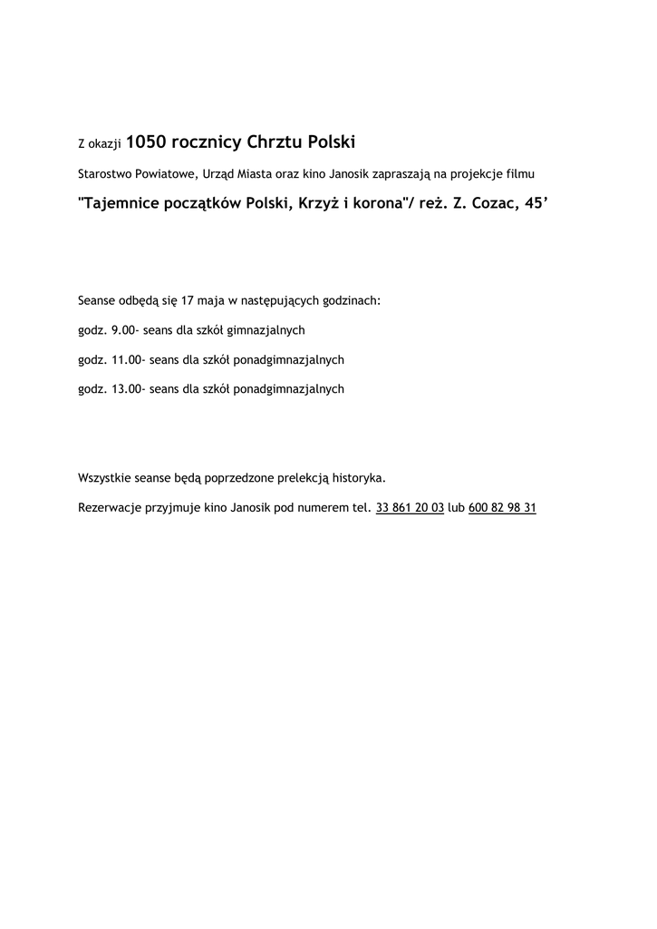 Z okazji 1050 rocznicy Chrztu Polski Starostwo Powiatowe, Urząd Miasta oraz kino Janosik zapraszają na projekcje filmu "Tajemnice początków Polski, Krzyż i korona"/ reż. Z. Cozac, 45’ Seanse odbędą się 17 maja w następujących godzinach: godz. 9.00- seans dla szkół gimnazjalnych godz. 11.00- seans dla szkół ponadgimnazjalnych godz. 13.00- seans dla szkół ponadgimnazjalnych Wszystkie seanse będą poprzedzone prelekcją historyka. Rezerwacje przyjmuje kino Janosik pod numerem tel. 33 861 20 03 lub 600 82 98 31 Opis serii: Z okazji Chrztu Polski została wyprodukowana seria fabularyzowanych filmów dokumentalnych pt. „TAJEMNICE POCZĄTKÓW POLSKI”. Jest to projekt autorski scenarzysty, reżysera i producenta filmów dokumentalnych Zdzisława Cozaca, zrealizowany w koprodukcji z TVP Historia, przy wsparciu finansowym Ministerstwa Nauki i Szkolnictwa Wyższego. Konsultantami naukowymi filmów są wybitni polscy historycy i archeolodzy. Seria „TAJEMNICE POCZĄTKÓW POLSKI” prezentuje najnowsze ustalenia naukowców związane z chrystianizacją naszych ziem i początkami Polski. Filmy serii mają nie tylko fascynującą tematykę, ale też atrakcyjną formę: wirtualne rekonstrukcje dawnych grodów przeplatają się z animowanymi mapami oraz inscenizacjami wydarzeń z czasów Mieszka I i Bolesława Chrobrego. Dzięki temu są bardzo dobrze odbierane przez młodych widzów. Filmy serii uzyskały znakomite recenzje krytyków i zdobyły liczne nagrody na festiwalach w kraju i za granicą (m.in. w Hiszpanii i w USA), w tym Złotego Kopernika w kolejnych edycjach Festiwalu Filmów Edukacyjnych EDUKINO (2013 i 2014). Kolejne tytuły serii „TAJEMNICE POCZĄTKÓW POLSKI” miały swe premiery w TVP, jednak obejrzenie ich na dużym ekranie pozwala na pełny odbiór bogatej warstwy obrazu i dźwięku. Malarskie wizje twórców filmu stwarzają uczniom niepowtarzalną możliwość wzbogacenia wiedzy i rozwinięcia wyobrażeń o ważnych wydarzeniach związanych z początkami Polski, ukształtowanych na lekcjach historii.(mat. dystrybutora)