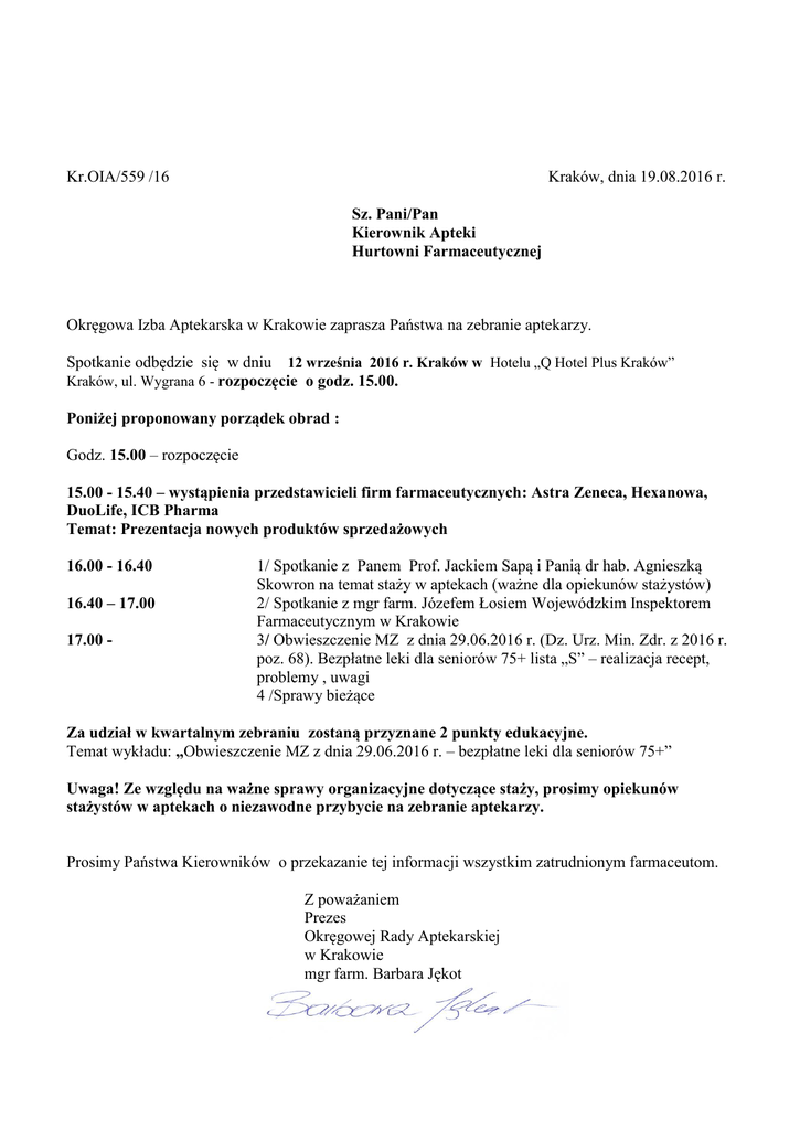 Kraków, dnia 19.08.2016 r. Kr.OIA/559 /16 Sz. Pani/Pan Kierownik Apteki Hurtowni Farmaceutycznej Okręgowa Izba Aptekarska w Krakowie zaprasza Państwa na zebranie aptekarzy. Spotkanie odbędzie się w dniu 12 września 2016 r. Kraków w Hotelu „Q Hotel Plus Kraków” Kraków, ul. Wygrana 6 - rozpoczęcie o godz. 15.00. Poniżej proponowany porządek obrad : Godz. 15.00 – rozpoczęcie 15.00 - 15.40 – wystąpienia przedstawicieli firm farmaceutycznych: Astra Zeneca, Hexanowa, DuoLife, ICB Pharma Temat: Prezentacja nowych produktów sprzedażowych 16.00 - 16.40 16.40 – 17.00 17.00 - 1/ Spotkanie z Panem Prof. Jackiem Sapą i Panią dr hab. Agnieszką Skowron na temat staży w aptekach (ważne dla opiekunów stażystów) 2/ Spotkanie z mgr farm. Józefem Łosiem Wojewódzkim Inspektorem Farmaceutycznym w Krakowie 3/ Obwieszczenie MZ z dnia 29.06.2016 r. (Dz. Urz. Min. Zdr. z 2016 r. poz. 68). Bezpłatne leki dla seniorów 75+ lista „S” – realizacja recept, problemy , uwagi 4 /Sprawy bieżące Za udział w kwartalnym zebraniu zostaną przyznane 2 punkty edukacyjne. Temat wykładu: „Obwieszczenie MZ z dnia 29.06.2016 r. – bezpłatne leki dla seniorów 75+” Uwaga! Ze względu na ważne sprawy organizacyjne dotyczące staży, prosimy opiekunów stażystów w aptekach o niezawodne przybycie na zebranie aptekarzy. Prosimy Państwa Kierowników o przekazanie tej informacji wszystkim zatrudnionym farmaceutom. Z poważaniem Prezes Okręgowej Rady Aptekarskiej w Krakowie mgr farm. Barbara Jękot
