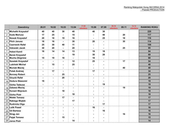 Ranking Małopolski Gong INCORSA 2014 - Pistolet PRODUCTION Zawodnicy 26.01 16.02 16.03 13.04 1 Michalik Krzysztof 40 40 30 2 Duda Mariusz 17 25 3 Nowak Krzysztof 20 18 4 Pilch Janusz 18 5 Czarnecki Rafał 6 Gdowski Jacek 25 17.05 odwołane 05.10 odwołane 09.11 14.12 odwołane 15.06 07.09 RANKING ROKU 40 40 30 - 15 - 40 20 117 19 16 - 25 18 116 16 - 30 20 - 30 30 40 11 - - 30 20 - 20 - - 7 Hobot Kamil 8 Bereś Krzysztof 16 14 14 13 19 18 94 - - - 19 30 20 69 9 Mucha Zbigniew 15 19 16 - 18 - 68 10 Szostek Krzysztof - - - 12 25 - 11 Lubiński Michał - 15 - 25 - - 12 Muniak Maciej - - - - - - 13 Polak Andrzej - 17 - - 17 - 34 14 Borowy Robert - - 25 - - - 25 15 Girycki Rafał - - 20 - - - 20 16 Hodura Sławomir 17 Górka Tadeusz 18 Zabawa Maciej 19 - - - - - 19 - - - - - 19 19 - - - - - - 19 Korzeń Wojciech - - 18 - - - 18 20 Górka Piotr 21 Wołek Tomasz - - - 18 - - 18 - - 17 - - - 17 22 Rabiega Wojtek - - - 17 - - 17 23 Rudnicka Olga - - - - - 17 17 24 Lalik Paweł - - - - 16 - 16 25 Gil Bartosz 26 Strąg Jan - - - - - 16 16 - - - - - - 27 Pająk Tomasz - - 15 - - - 15 28 Jaros Piotr - - - 14 - - 14 220 114 106 25 17 95 54 40 40 19 16 40 19 16 Ranking Małopolski Gong INCORSA 2014 - Pistolet PRODUCTION 29 Frycz Maciek - - 13 - - - 13 30 Kulikowski Michał - - - 10 - - 10 31 Ołubiec Piotr - - - - - - 0 Do RANKINGU ROKU liczonych jest 8 najlepszych wyników z 10 zawodów, jeśli odbędzie się mniej niż 8 zawodów w roku, liczone są wtedy wszystkie zawody. Regulamin zawodów na rok 2014 (ZSD Zielonki) Cel zawodów Celem zawodów jest doskonalenie umiejętności strzeleckich poprzez rywalizację sportową. 1 Broń Zawodnicy dopuszczani są do pojedynków na podstawie rodzaju i kalibru broni zgodnie z obowiązującymi przepisami IPSC na dany rok. Dopuszczalne są pistolety lub rewolwery w kalibrze od 9mm PARA (.38) do 11.43mm. Nie są dopuszczalne uchwyty (rękojeści ) ortopedyczne. 2 Do rywalizacji dopuszczeni są zawodnicy posiadający Patent Strzelecki i Licencję Zawodniczą. Dopuszcza się zawodników w klasach PRODUCTION, STANDARD, OPEN i REWOLWER. 3 Amunicja Zabronione jest używanie amunicji zapalającej, przeciwpancernej i innej specjalnego przeznaczenia. PRODUCTION; w magazynkach może znajdować się nie więcej niż 15 naboi. Nie jest dozwolone doładowywanie 16 naboju do lufy. STANDARD; zgodnie z przepisami IPSC na dany rok OPEN; zgodnie z przepisami IPSC na dany rok. 4 Przebieg Zawody rozgrywa się systemem „każdy z każdym”. Dwóch zawodników stoi równolegle do siebie w boksach startowych, przodem w kierunku celów. Na polecenie sędziego prowadzącego zawodnicy ładują broń i umieszczają ją w kaburze. Ranking Małopolski Gong INCORSA 2014 - Pistolet PRODUCTION PRODUCTION; pistolety kurkowe muszą mieć spuszczony kurek przed włożeniem do kabury. Jeżeli pistolet posiada system zwalniania kurka musi on być użyty. Pierwszy strzał oddaje się z samo-napięcia o ile przebieg zawodów nie wymusza innej kondycji broni. STANDARD i OPEN; broń musi być zabezpieczona przed włożeniu do kabury Po sygnale startowym każdy zawodnik ostrzeliwuje swoją grupę celów w jak najszybszym czasie. Po ostrzelaniu pierwszego( cel musi upaść) a najpóźniej przed ostrzelaniem ostatniego własnego stojącego celu, zawodnik musi dokonać wymiany magazynka. Pojedynek wygrywa zawodnik, którego skrajny wewnętrzny cel zostanie pierwszy przewrócony, pod warunkiem, że wszystkie inne cele już zostały przewrócone. W przypadku omyłkowego (lub celowego) ostrzelania skrajnego wewnętrznego celu, przed przewróceniem innych celów, następuje dyskwalifikacja z pojedynku, a zwycięstwo przyznaje się drugiemu zawodnikowi. Jeżeli zawodnik nie dopełni przepisowej wymiany magazynka, powoduje to także przyznanie zwycięstwa przeciwnikowi. 5 Komendy Wszelkie komendy i plecenia wydaje sędzia prowadzący (Range Officer). 6 Strzały próbne i sprzęt Strzały próbne są niedopuszczalne. Zawodnik winien być wyposażony w pas, kaburę spełniającą wymogi przepisów IPSC, zapasowe magazynki, okulary ochronne i ochraniacze słuchu. Mierzenie do celów trzymając w ręce jakikolwiek przedmiot ułatwiający celowanie jest NIEDOZWOLONE i skutkować może nałożeniem kary regulaminowej. 7 Problemy z bronią i amunicją Za wszelkiego rodzaju problemy z bronią i amunicją odpowiada zawodnik bez możliwości powtórzenia pojedynku. 8 Wyniki Za wygrany pojedynek zawodnik otrzymuje 1 punkt. Zawody wygrywa zawodnik o największej ilości zdobytych punktów. W przypadku równej ilości punktów, odbywa się niezbędna ilość dogrywek między zawodnikami mającymi taką samą ilość zwycięstw. 9 Kary i upomnienia Zgodnie z aktualnymi przepisami IPSC. W przypadku komentarzy ze strony zawodników nie biorących udziału w pojedynku sędzia zawodów może udzielić kary regulaminowej w postaci upomnienia. W przypadku powtarzającego się przeszkadzania innym zawodnikom podczas pojedynku może być zastosowana kara wykluczenia z zawodów. Ranking Małopolski Gong INCORSA 2014 - Pistolet PRODUCTION 10 Dyskwalifikacja Za naruszenie zasad bezpieczeństwa na strzelnicy, a w szczególności za: a. Kierowanie wylotu lufy broni w kierunku innym niż bezpieczny b. Utratę kontroli nad bronią czyli utratę kontaktu fizycznego z bronią mającą podłączony magazynek lub nabój w komorze nabojowej c. Uczestnictwo w zawodach pod wpływem alkoholu lub innych środków odurzających d. Niesportowe zachowanie zawodnik będzie zdyskwalifikowany z zawodów. O dyskwalifikacji decyduje sędzia główny zawodów.
