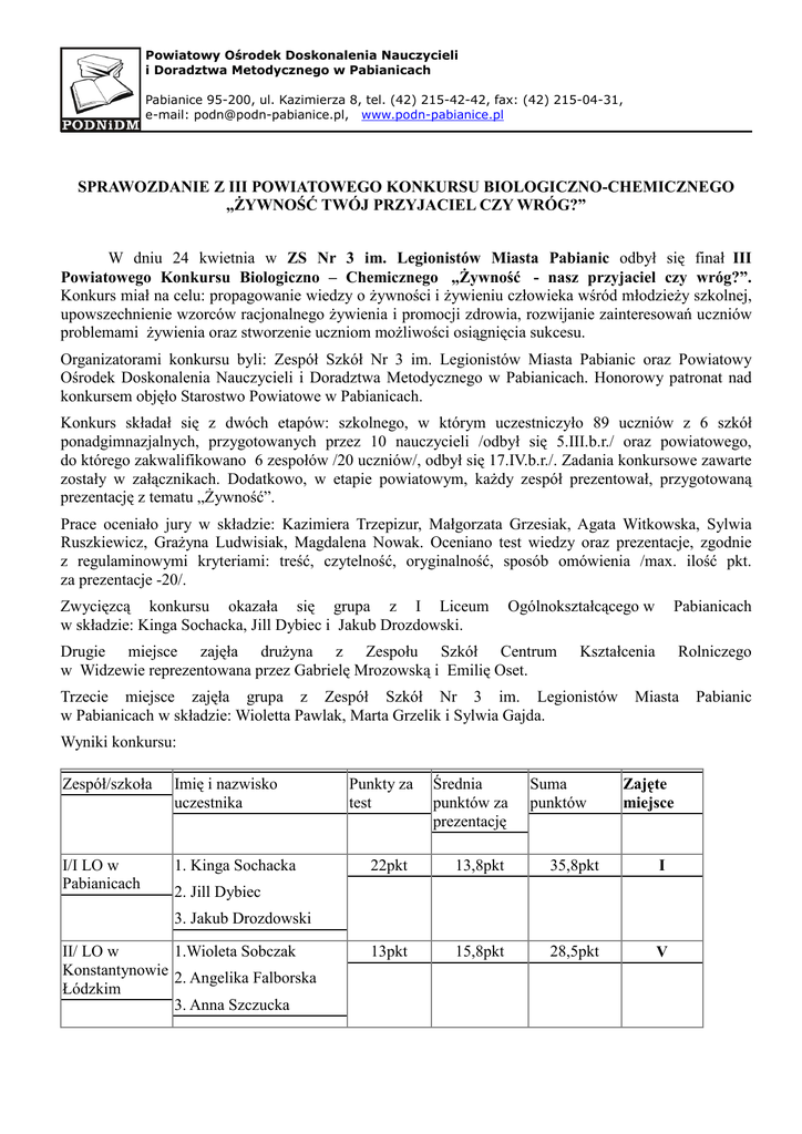 Powiatowy Ośrodek Doskonalenia Nauczycieli i Doradztwa Metodycznego w Pabianicach Pabianice 95-200, ul. Kazimierza 8, tel. (42) 215-42-42, fax: (42) 215-04-31, e-mail: [email protected], www.podn-pabianice.pl SPRAWOZDANIE Z III POWIATOWEGO KONKURSU BIOLOGICZNO-CHEMICZNEGO „ŻYWNOŚĆ TWÓJ PRZYJACIEL CZY WRÓG?” W dniu 24 kwietnia w ZS Nr 3 im. Legionistów Miasta Pabianic odbył się finał III Powiatowego Konkursu Biologiczno – Chemicznego „Żywność - nasz przyjaciel czy wróg?”. Konkurs miał na celu: propagowanie wiedzy o żywności i żywieniu człowieka wśród młodzieży szkolnej, upowszechnienie wzorców racjonalnego żywienia i promocji zdrowia, rozwijanie zainteresowań uczniów problemami żywienia oraz stworzenie uczniom możliwości osiągnięcia sukcesu. Organizatorami konkursu byli: Zespół Szkół Nr 3 im. Legionistów Miasta Pabianic oraz Powiatowy Ośrodek Doskonalenia Nauczycieli i Doradztwa Metodycznego w Pabianicach. Honorowy patronat nad konkursem objęło Starostwo Powiatowe w Pabianicach. Konkurs składał się z dwóch etapów: szkolnego, w którym uczestniczyło 89 uczniów z 6 szkół ponadgimnazjalnych, przygotowanych przez 10 nauczycieli /odbył się 5.III.b.r./ oraz powiatowego, do którego zakwalifikowano 6 zespołów /20 uczniów/, odbył się 17.IV.b.r./. Zadania konkursowe zawarte zostały w załącznikach. Dodatkowo, w etapie powiatowym, każdy zespół prezentował, przygotowaną prezentację z tematu „Żywność”. Prace oceniało jury w składzie: Kazimiera Trzepizur, Małgorzata Grzesiak, Agata Witkowska, Sylwia Ruszkiewicz, Grażyna Ludwisiak, Magdalena Nowak. Oceniano test wiedzy oraz prezentacje, zgodnie z regulaminowymi kryteriami: treść, czytelność, oryginalność, sposób omówienia /max. ilość pkt. za prezentacje -20/. Zwycięzcą konkursu okazała się grupa z I Liceum w składzie: Kinga Sochacka, Jill Dybiec i Jakub Drozdowski. Ogólnokształcącego w Drugie miejsce zajęła drużyna z Zespołu Szkół Centrum w Widzewie reprezentowana przez Gabrielę Mrozowską i Emilię Oset. Pabianicach Kształcenia Trzecie miejsce zajęła grupa z Zespół Szkół Nr 3 im. Legionistów w Pabianicach w składzie: Wioletta Pawlak, Marta Grzelik i Sylwia Gajda. Rolniczego Miasta Wyniki konkursu: Zespół/szkoła Imię i nazwisko uczestnika I/I LO w Pabianicach 1. Kinga Sochacka Punkty za test Średnia punktów za prezentację Suma punktów Zajęte miejsce 22pkt 13,8pkt 35,8pkt I 13pkt 15,8pkt 28,5pkt V 2. Jill Dybiec 3. Jakub Drozdowski II/ LO w 1.Wioleta Sobczak Konstantynowie 2. Angelika Falborska Łódzkim 3. Anna Szczucka Pabianic Powiatowy Ośrodek Doskonalenia Nauczycieli i Doradztwa Metodycznego w Pabianicach Pabianice 95-200, ul. Kazimierza 8, tel. (42) 215-42-42, fax: (42) 215-04-31, e-mail: [email protected], www.podn-pabianice.pl III/ ZSCKR w Widzewie 1. Gabriela Mrozowska 17pkt 17,8pkt 34,8pkt II 12pkt 13,4pkt 25,4pkt VI 19pkt 14,2pkt 33,2 pkt III 14pkt 18,6pkt 32,6pkt IV 2. Emilia Oset 3. Jakub Napieraj IV/ ZS Nr 3 w Pabianicach 1. Anna Miłak 2. Sylwia Gajdka 3. Sebastian Sobieraj V/ ZS Nr 3 w Pabianicach 1. Wioletta Pawlak 2. Marta Grzelik 3. Sylwia Gajda VI/ ZSCKR w Widzewie 1. Dominika Krzysztofiak 2. Marta Wymysłowska 3. Szymon Pabich Nagrody dla zwycięzców ufundował Powiatowy Ośrodek Doskonalenia Nauczycieli i Doradztwa Metodycznego z dotacji WFOŚiGW w Łodzi. W uroczystości podsumowania udział wzięli: p. Marian Lorenczak /naczelnik Wydziału Oświaty Starostwa Powiatowego w Pabianicach/, p. Małgorzata Biegajło – dyrektor PODNiDM w Pabianicach, p. Hanna Grącka /dyrektor ZS Nr3/. Organizatorami konkursu były: Agnieszka Kulpińska-Górska doradca metodyczny PODNiDM, Grażyna Ludwisiak i Magdalena Nowak nauczycielki chemii i biologii ZS Nr3.