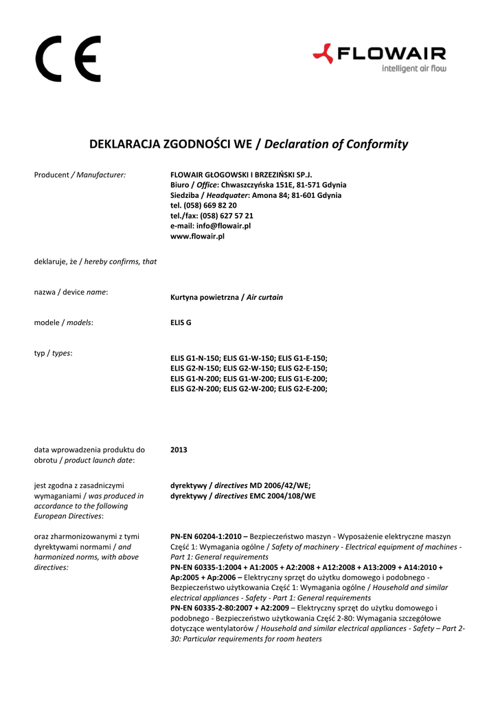 DEKLARACJA ZGODNOŚCI WE / Declaration of Conformity Producent / Manufacturer: FLOWAIR GŁOGOWSKI I BRZEZIŃSKI SP.J. Biuro / Office: Chwaszczyńska 151E, 81-571 Gdynia Siedziba / Headquater: Amona 84; 81-601 Gdynia tel. (058) 669 82 20 tel./fax: (058) 627 57 21 e-mail: [email protected] www.flowair.pl deklaruje, że / hereby confirms, that nazwa / device name: modele / models: typ / types: Kurtyna powietrzna / Air curtain ELIS G ELIS G1-N-150; ELIS G1-W-150; ELIS G1-E-150; ELIS G2-N-150; ELIS G2-W-150; ELIS G2-E-150; ELIS G1-N-200; ELIS G1-W-200; ELIS G1-E-200; ELIS G2-N-200; ELIS G2-W-200; ELIS G2-E-200; data wprowadzenia produktu do obrotu / product launch date: 2013 jest zgodna z zasadniczymi wymaganiami / was produced in accordance to the following European Directives: dyrektywy / directives MD 2006/42/WE; dyrektywy / directives EMC 2004/108/WE oraz zharmonizowanymi z tymi dyrektywami normami / and harmonized norms, with above directives: PN-EN 60204-1:2010 – Bezpieczeństwo maszyn - Wyposażenie elektryczne maszyn Część 1: Wymagania ogólne / Safety of machinery - Electrical equipment of machines Part 1: General requirements PN-EN 60335-1:2004 + A1:2005 + A2:2008 + A12:2008 + A13:2009 + A14:2010 + Ap:2005 + Ap:2006 – Elektryczny sprzęt do użytku domowego i podobnego Bezpieczeństwo użytkowania Część 1: Wymagania ogólne / Household and similar electrical appliances - Safety - Part 1: General requirements PN-EN 60335-2-80:2007 + A2:2009 – Elektryczny sprzęt do użytku domowego i podobnego - Bezpieczeństwo użytkowania Część 2-80: Wymagania szczegółowe dotyczące wentylatorów / Household and similar electrical appliances - Safety – Part 230: Particular requirements for room heaters PN-EN 60034-1:2009 + Ap1:2009 – Maszyny elektryczne wirujące Część 1: Dane znamionowe i parametry / Rotating electrical machines – Part 1: Rating and performance PN-EN 60034-5:2004 + A1:2009 – Maszyny elektryczne wirujące Część 5: Stopnie ochrony zapewniane przez rozwiązania konstrukcyjne maszyn elektrycznych wirujących (kod IP) – Klasyfikacja / Rotating electrical machines – Part 5: Degrees of protection provided by the integral design of rotating electrical machines (IP code). Classification. PN-EN 60034-8:2007 – Maszyny elektryczne wirujące Część 8: Oznaczanie wyprowadzeń i kierunek wirowania maszyn wirujących / Rotating electrical machines – Part 8: Terminal markings and direction of rotation. PN-EN 60034-9:2009 – Maszyny elektryczne wirujące Część 9: Dopuszczalne poziomy hałasu / Rotating electrical machines – Part 9: Noise limits. PN-EN 61000-6-1:2008 – Kompatybilność elektromagnetyczna (EMC) Część 6-1: Normy ogólne - Odporność w środowiskach: mieszkalnym, handlowym i lekko uprzemysłowionym / Electromagnetic compatibility (EMC) Part 6-1: Generic standards. Immunity for residential, commercial and light-industrial environments. PN-EN 61000-6-2:2008 + Ap1:2009 + Ap2:2009 – Kompatybilność elektromagnetyczna (EMC) Część 6-2: Normy ogólne – Odporność w środowiskach przemysłowych / Electromagnetic compatibility (EMC) - Part 6-2: Generic standards. Immunity for industrial environments. PN-EN 61000-6-3:2008 – Kompatybilność elektromagnetyczna (EMC) Część 6-3: Normy ogólne – Norma emisji w środowiskach: mieszkalnym, handlowym i lekko uprzemysłowionym / Electromagnetic compatibility (EMC) - Part 6-3: Generic standards - Emission standard for residential, commercial and light-industrial environments. PN-EN 61000-6-4:2008 – Kompatybilność elektromagnetyczna (EMC) Część 6-4: Normy ogólne - Norma emisji w środowiskach przemysłowych / Electromagnetic compatibility (EMC) - Part 6-4: Generic standards - Emission standard for industrial environments. Gdynia, 10.07.2013 Product Manager Dunajski Maciej